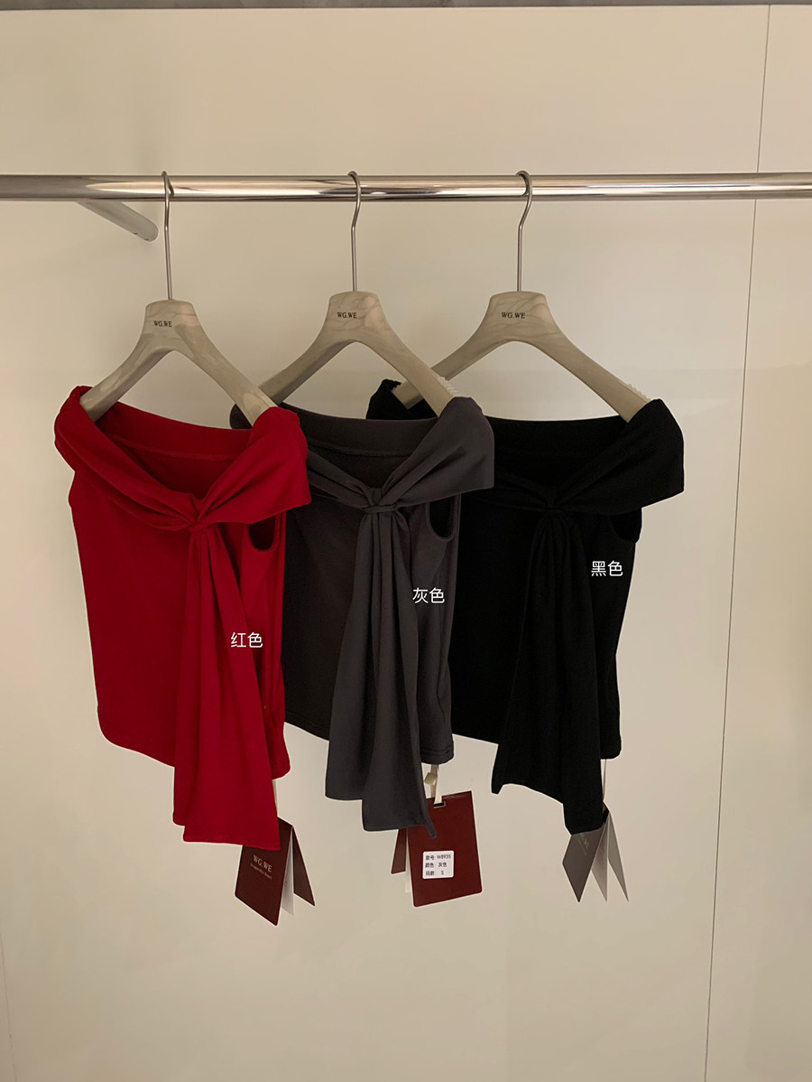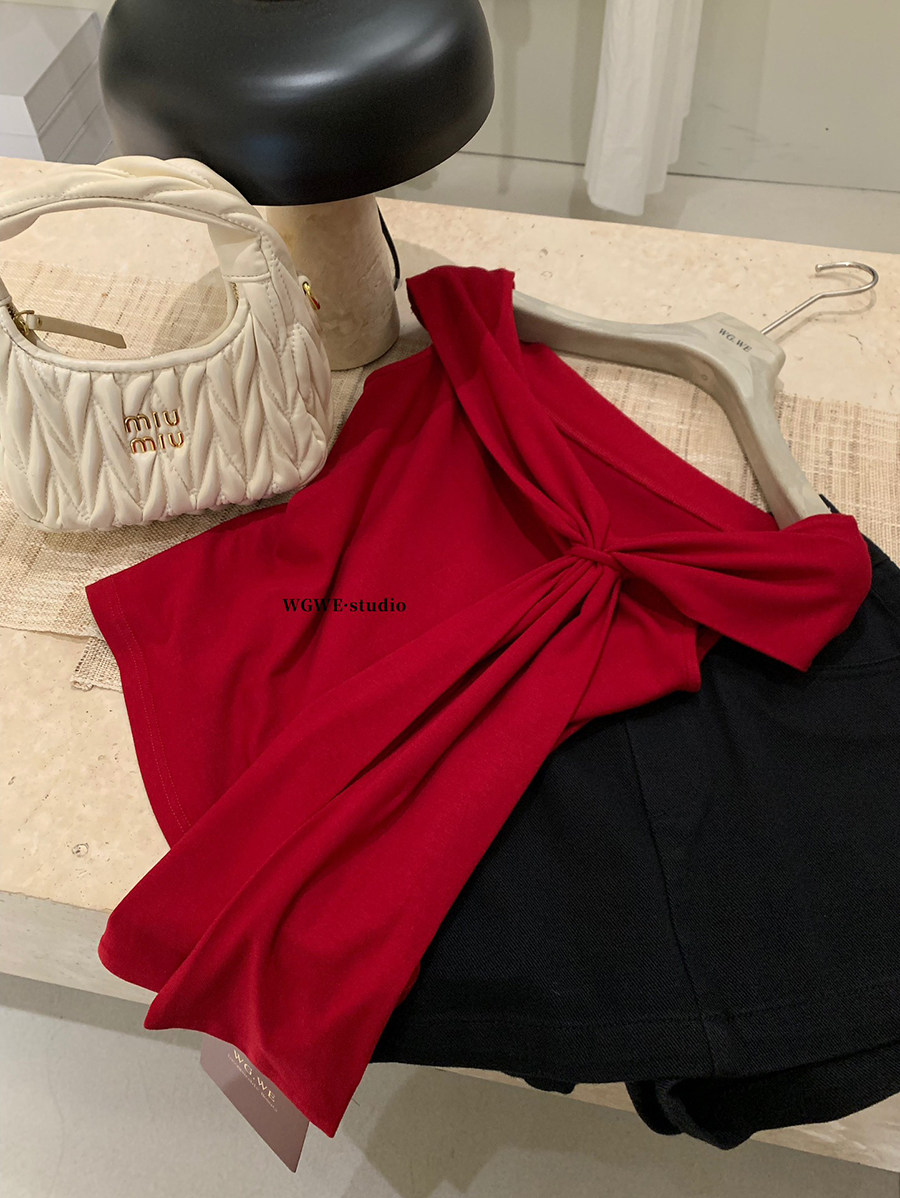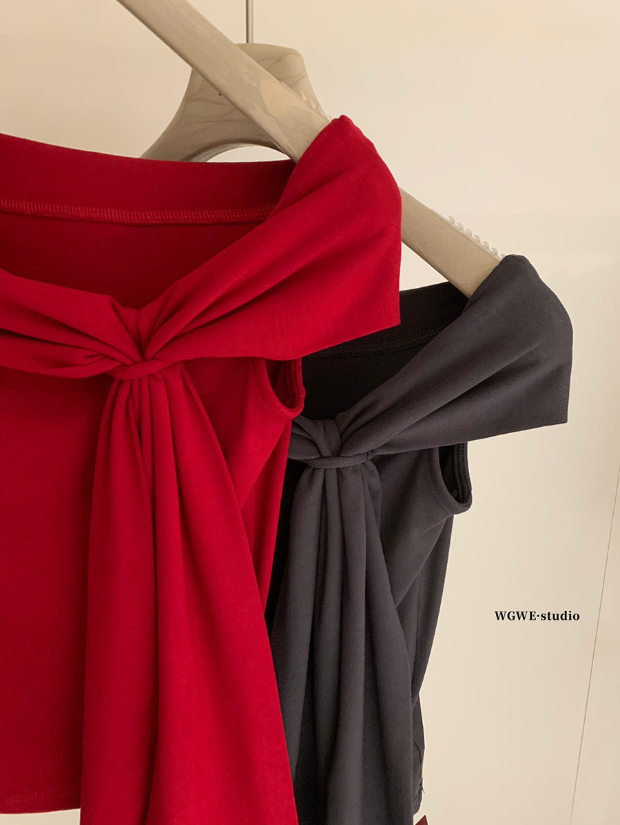Lin Xiaxia French-Style Design One-Shoulder Twist-Knot Knit Top with a Turn-Down Collar, Elegant and Slimming Short-Sleeve T-Shirt