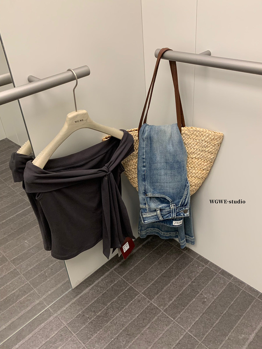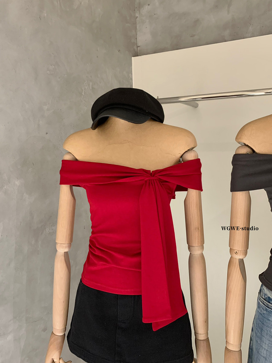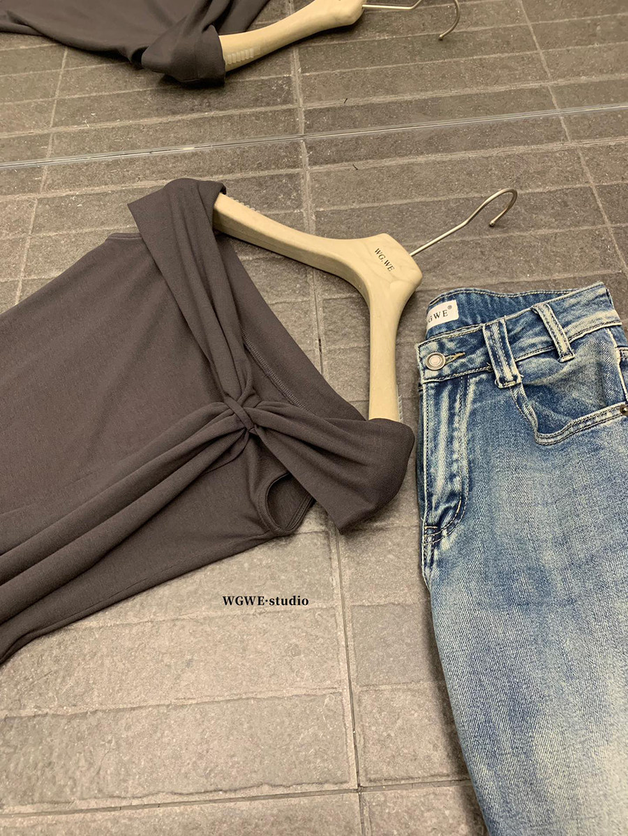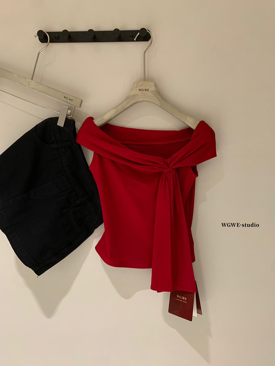 Lin Xiaxia French-Style Design One-Shoulder Twist-Knot Knit Top with a Turn-Down Collar, Elegant and Slimming Short-Sleeve T-Shirt