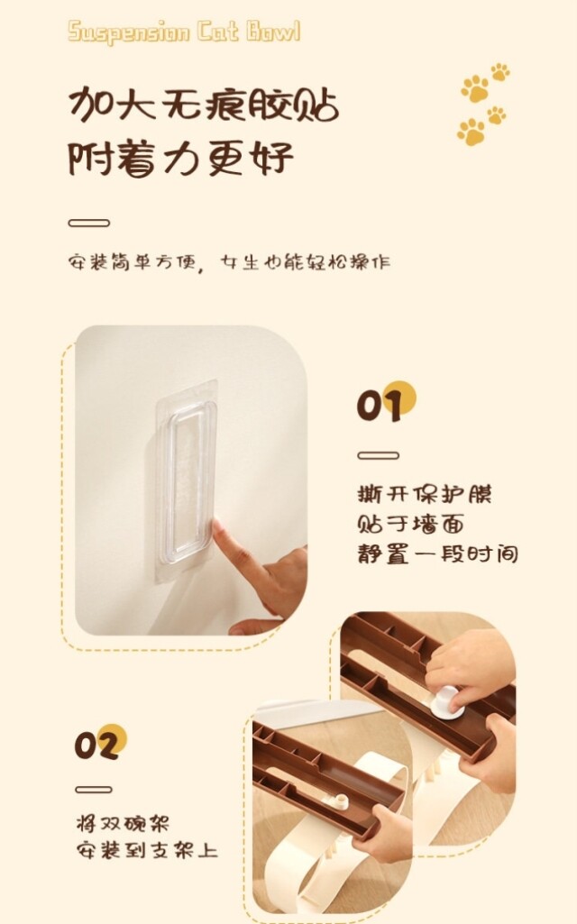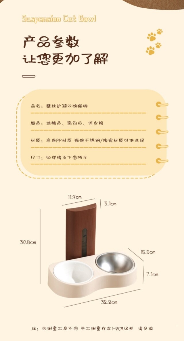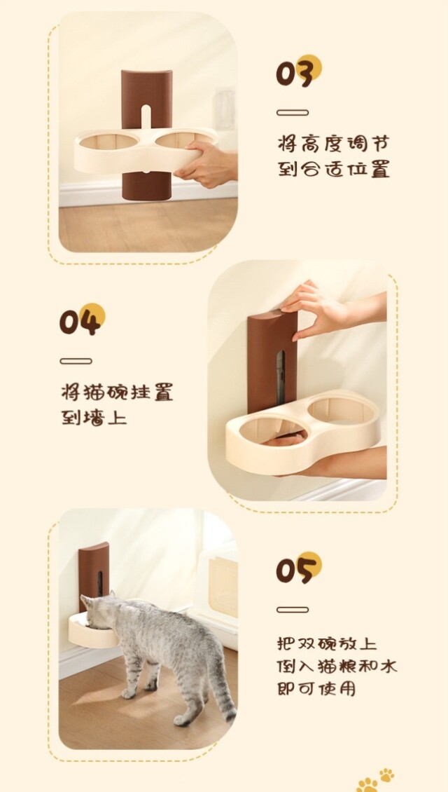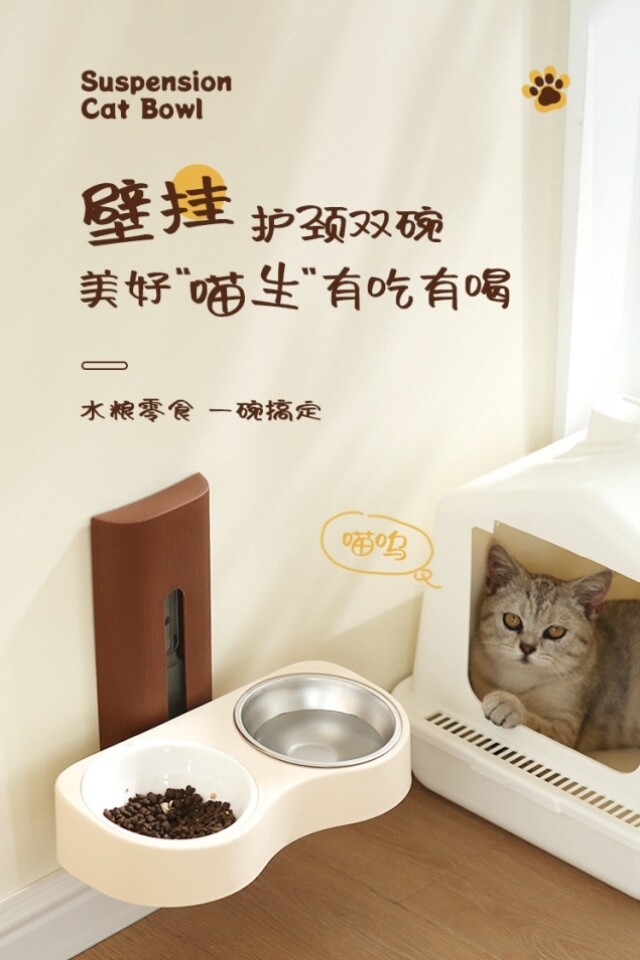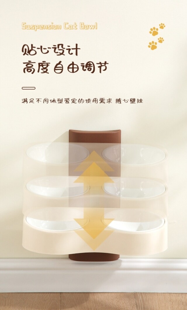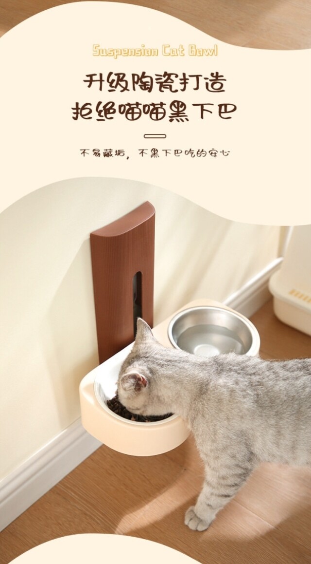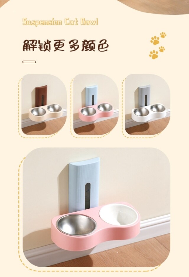 Suspended cat bowl! Double-bowl stainless steel anti-tipping cervical vertebrae-protecting dog bowl with water and food in one, adjustable and easy to clean with high legs