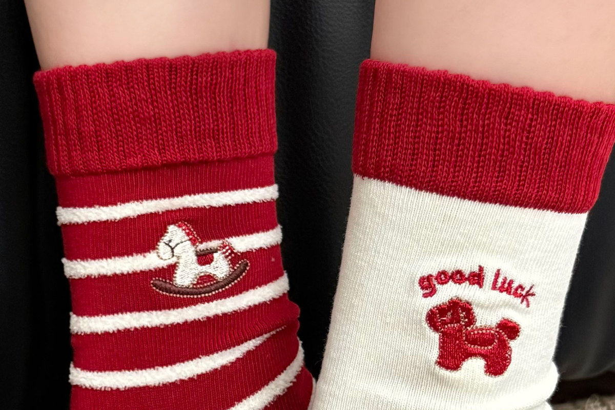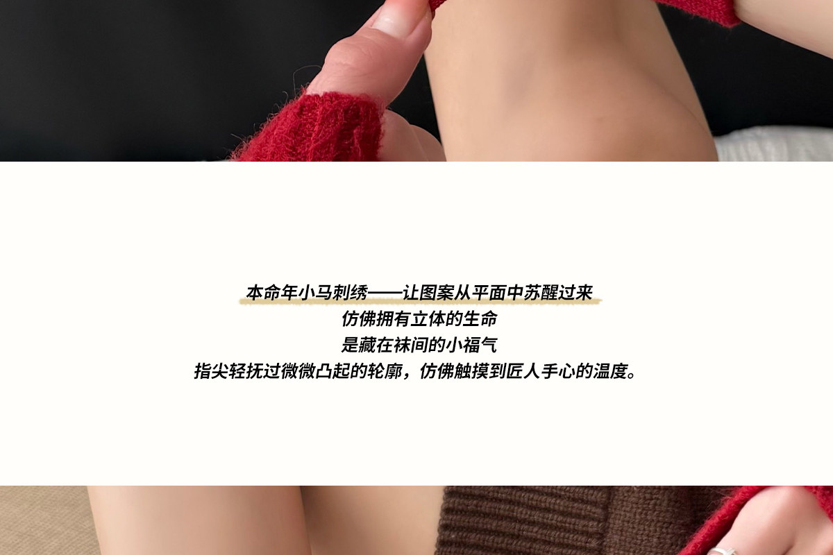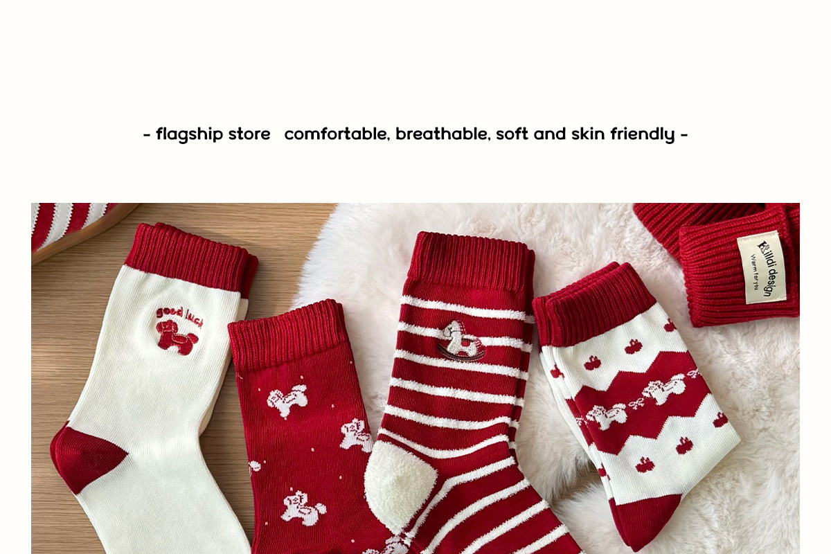 Zodiac year red socks women's autumn and winter pure cotton mid-calf socks Year of the Horse cartoon striped stockings cute festive pile socks