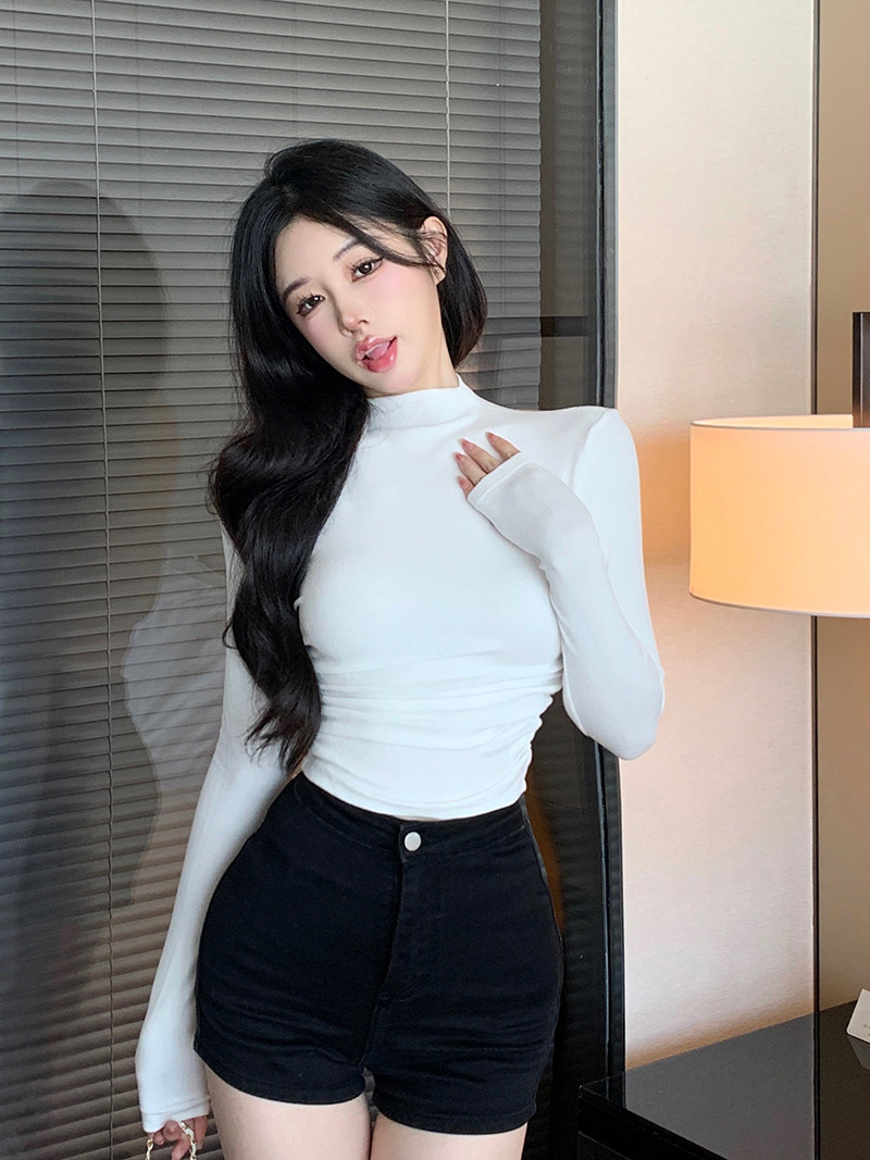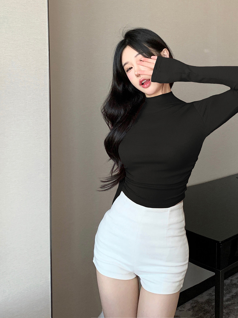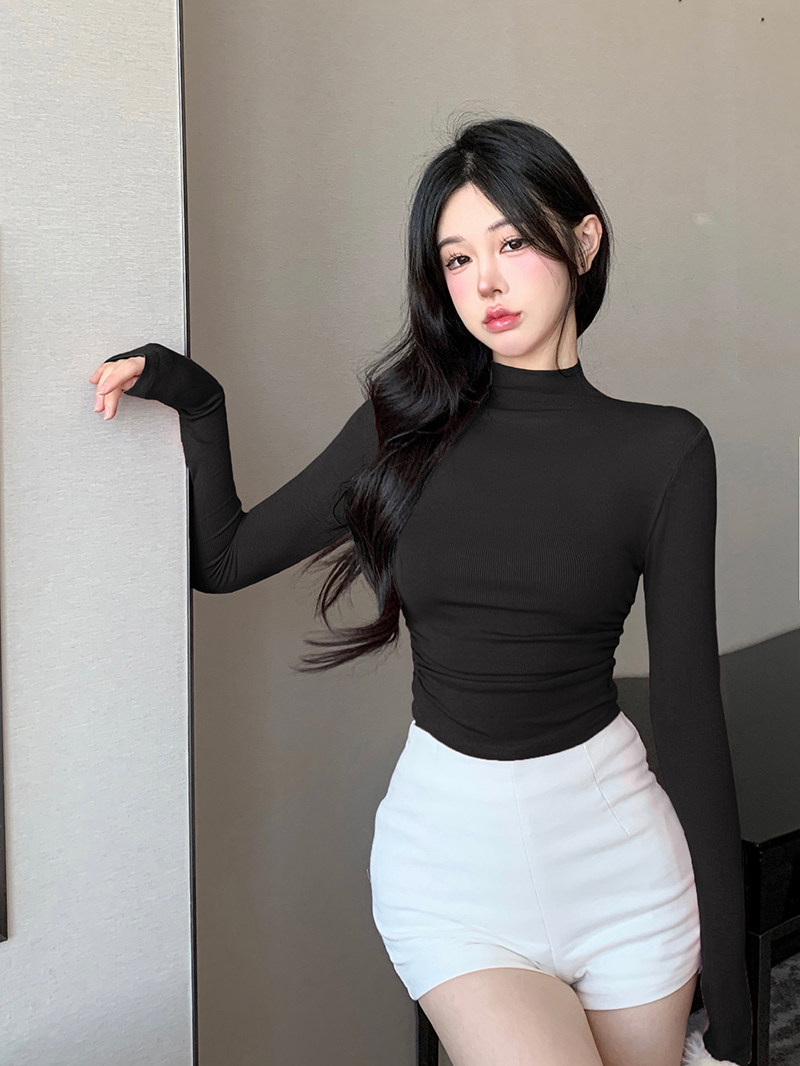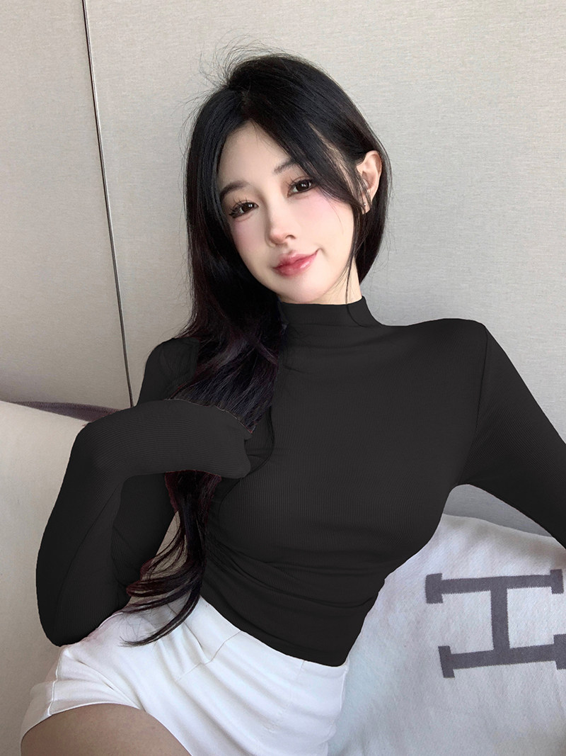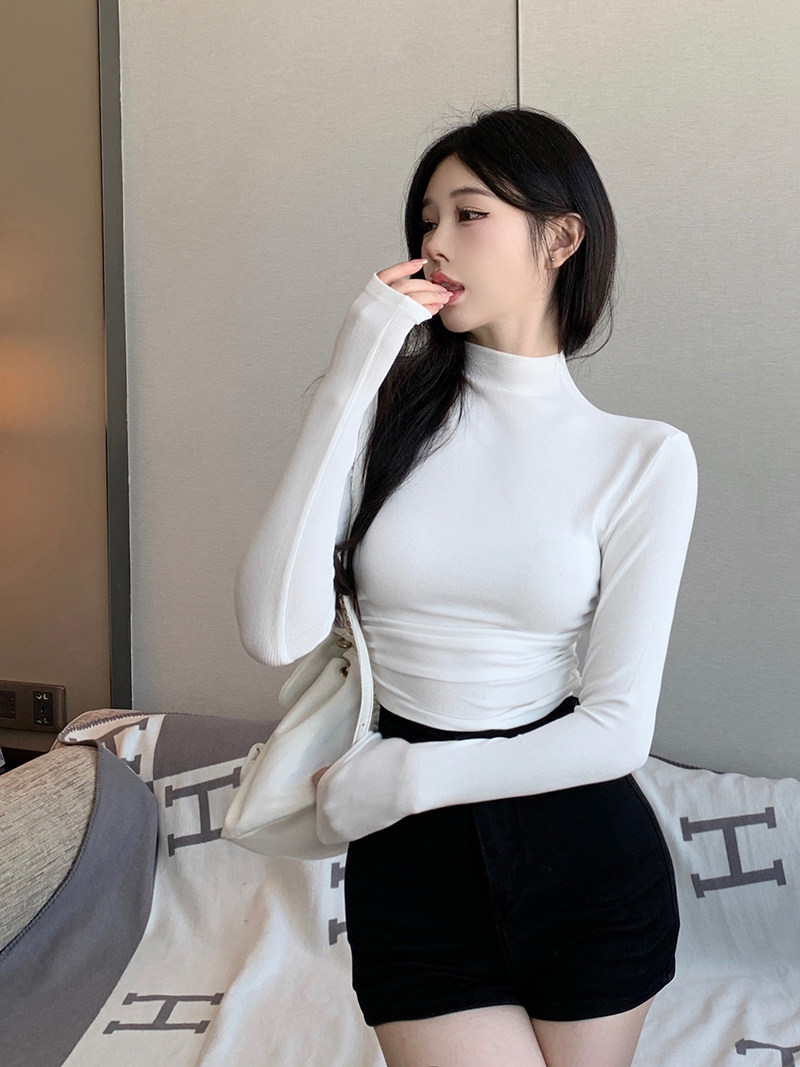 Minimalist Style Half-High Collar Slim-Fit Ruched Long-Sleeve T-Shirt for Women, Spring Pure Desire Short Korean Chic Unique Top