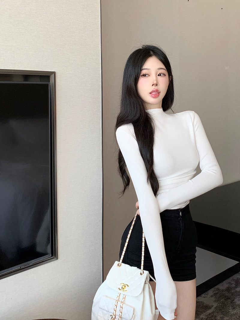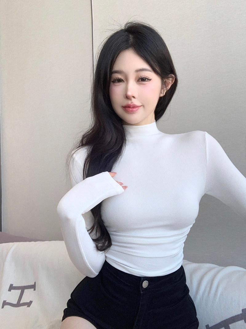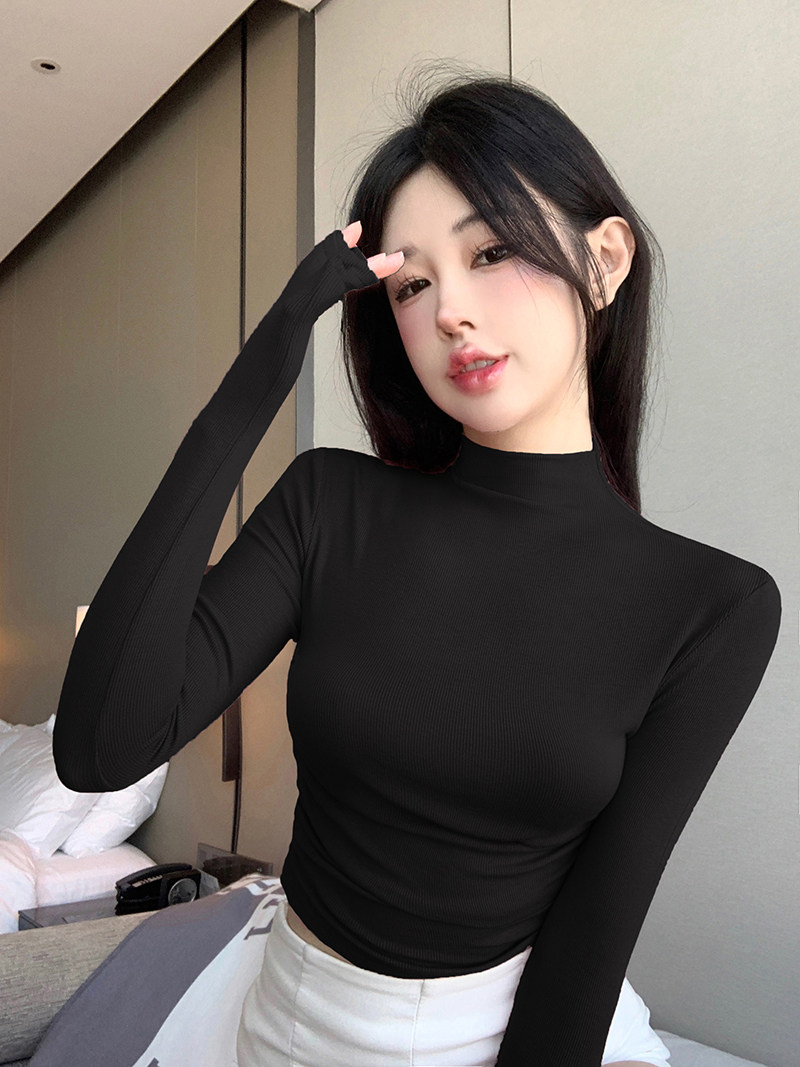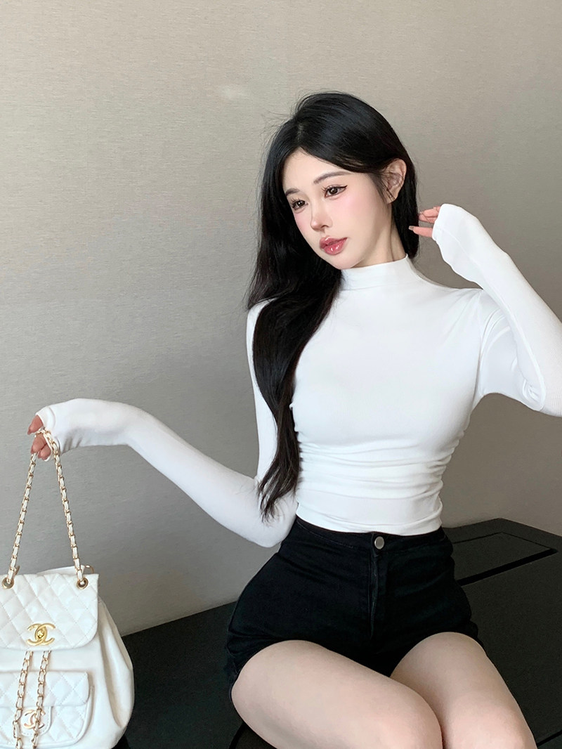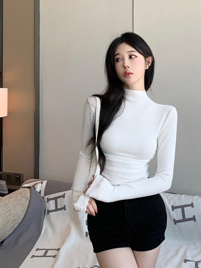 Minimalist Style Half-High Collar Slim-Fit Ruched Long-Sleeve T-Shirt for Women, Spring Pure Desire Short Korean Chic Unique Top