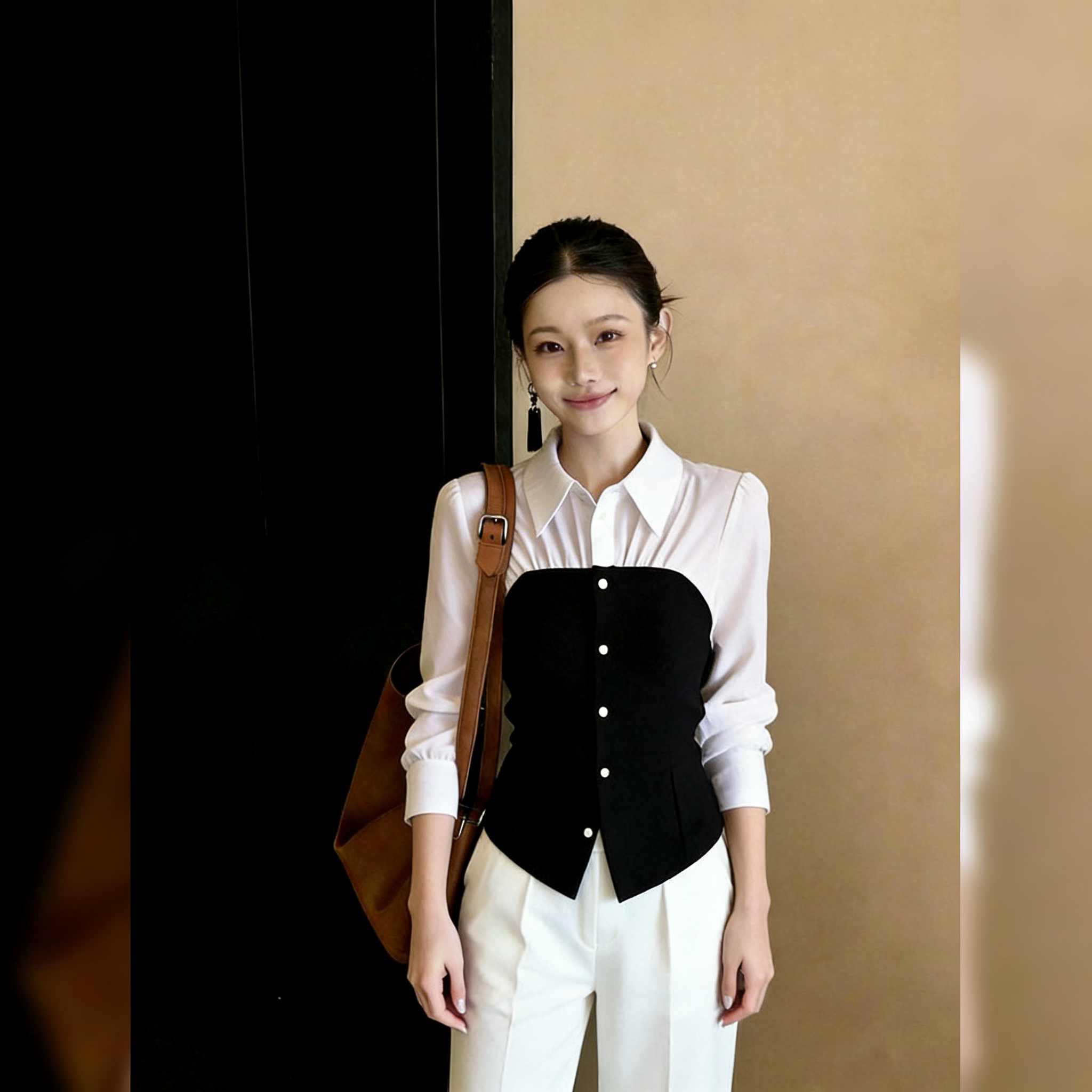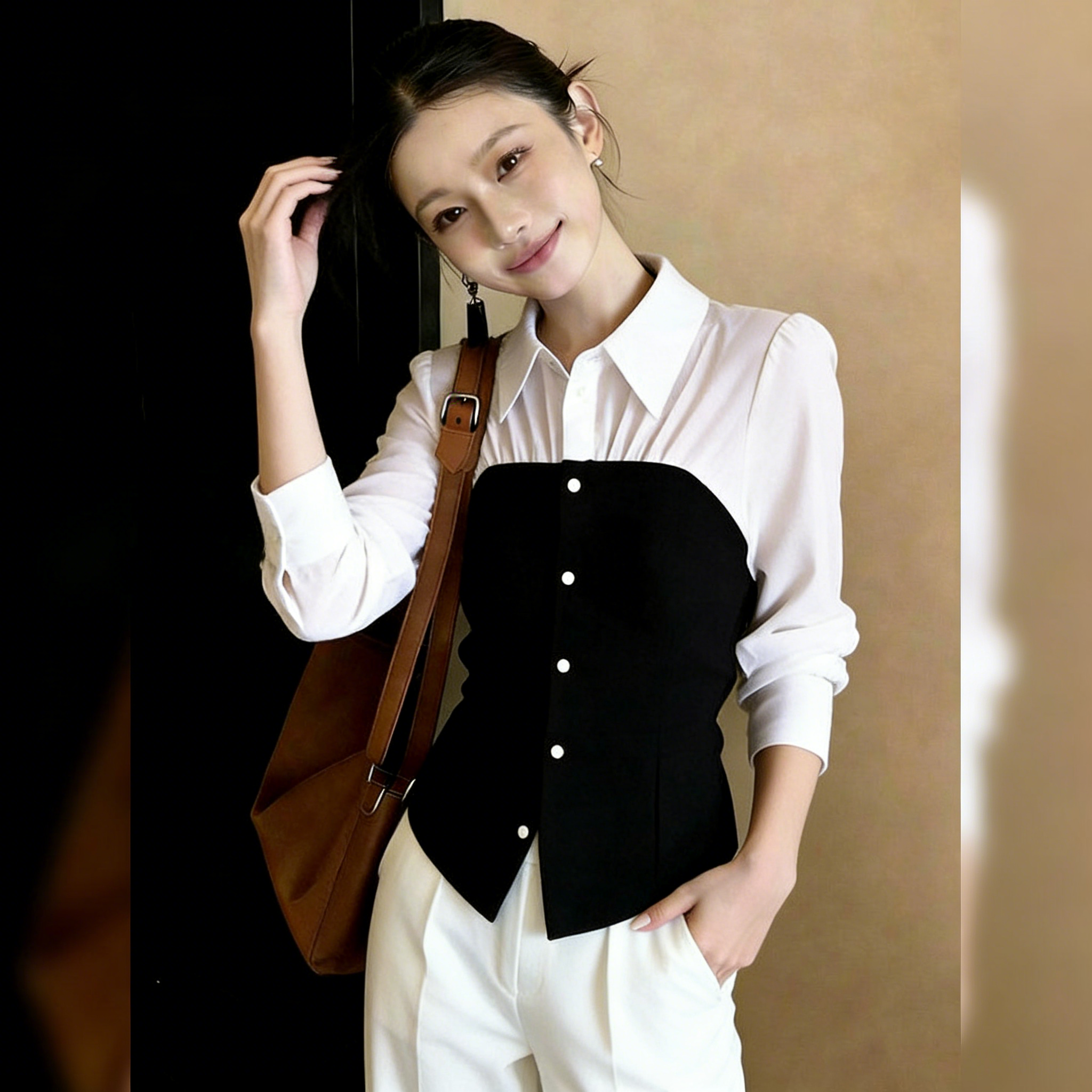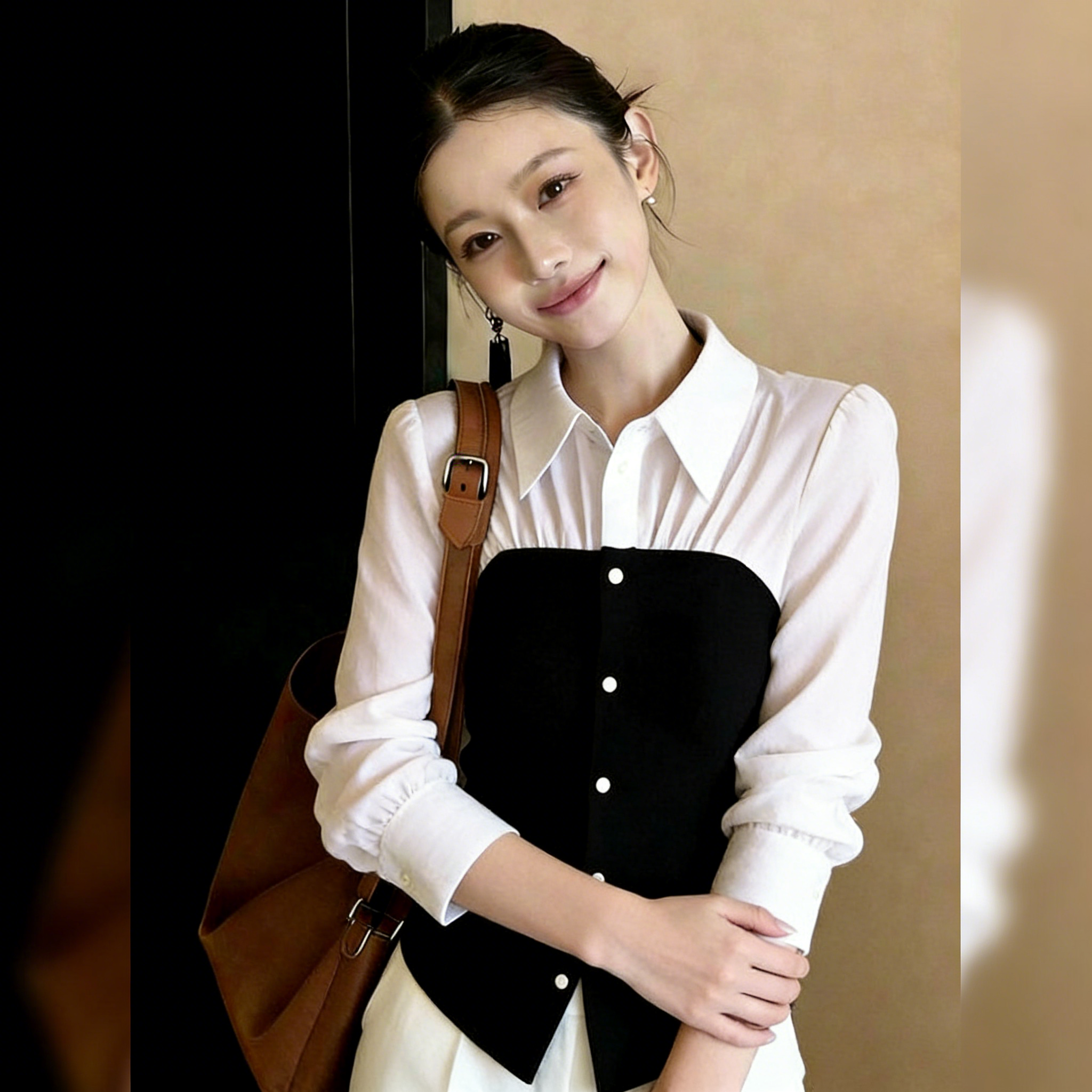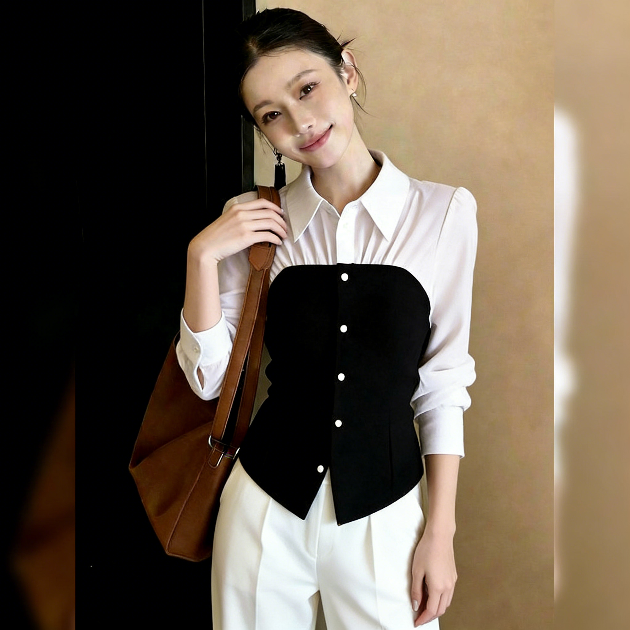 (in Stock) Slim-Fit, Stylish, Chic, Everyday Commuting Black and White Faux Two-Piece Top for Women, 2026 Spring Long-Sleeve Shirt