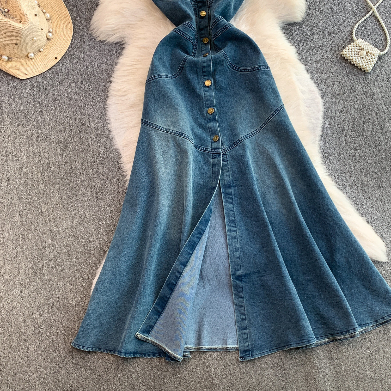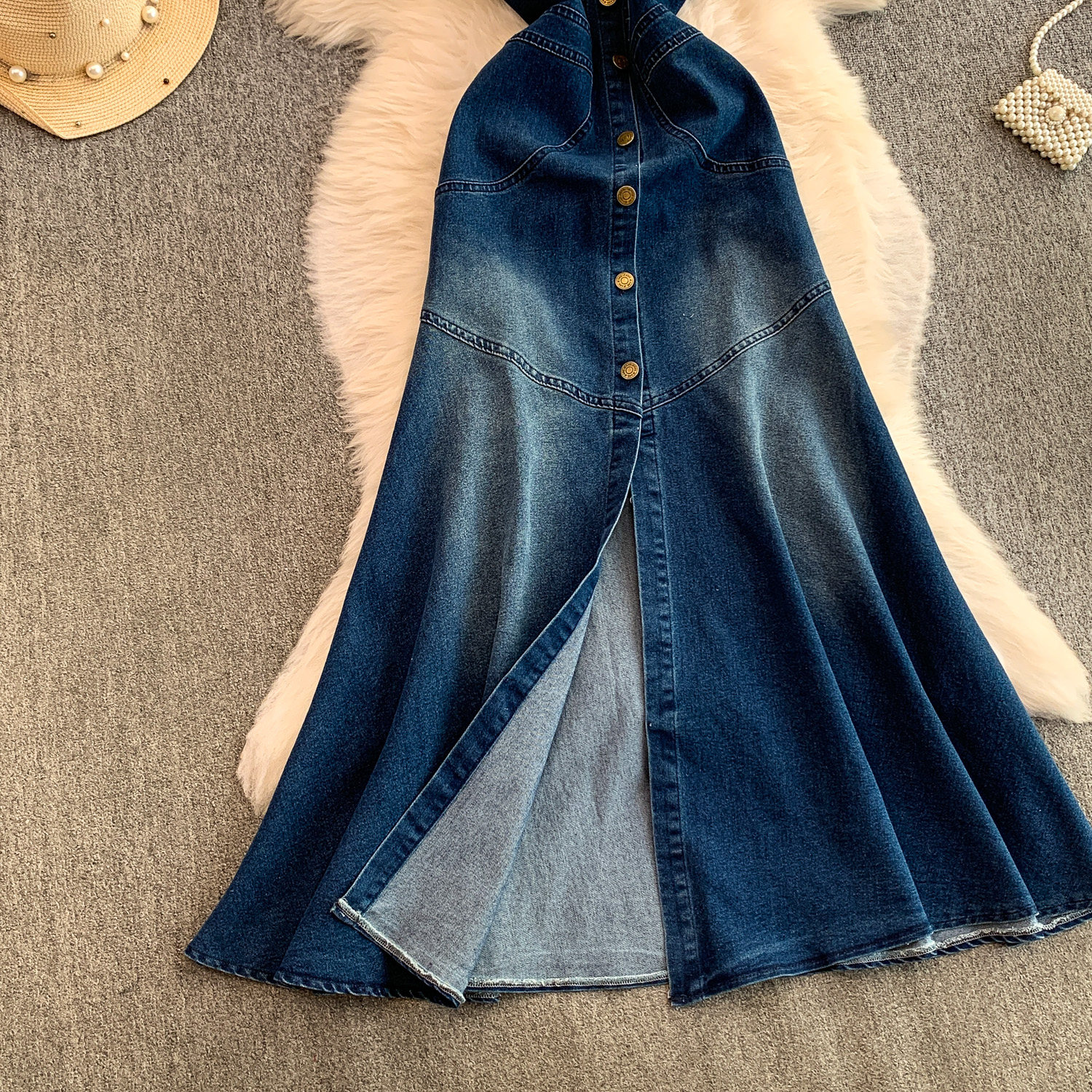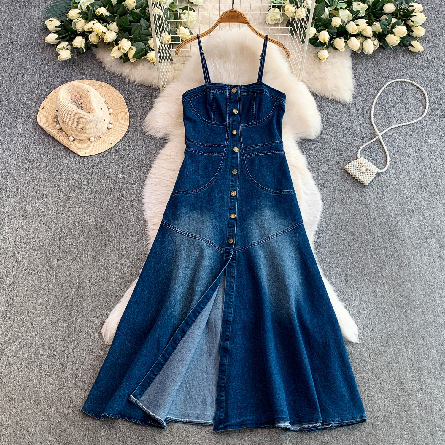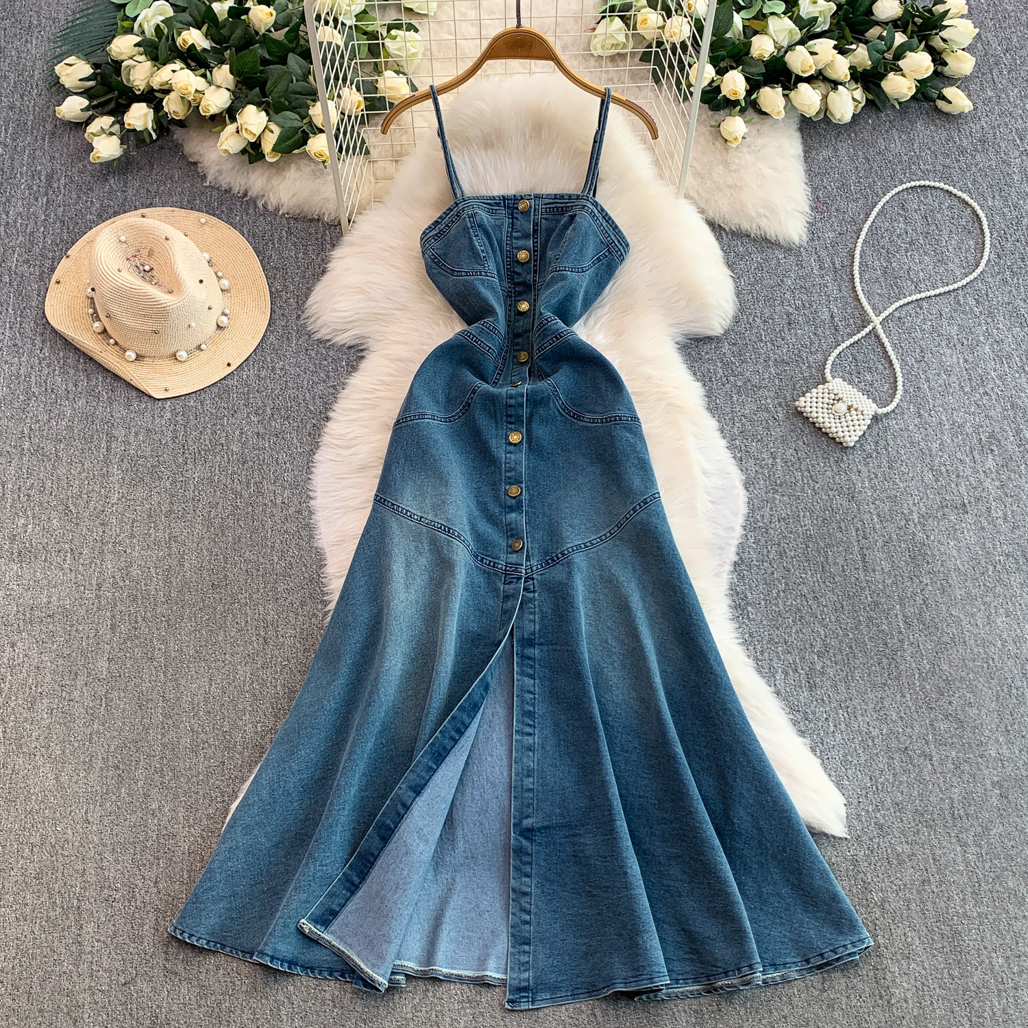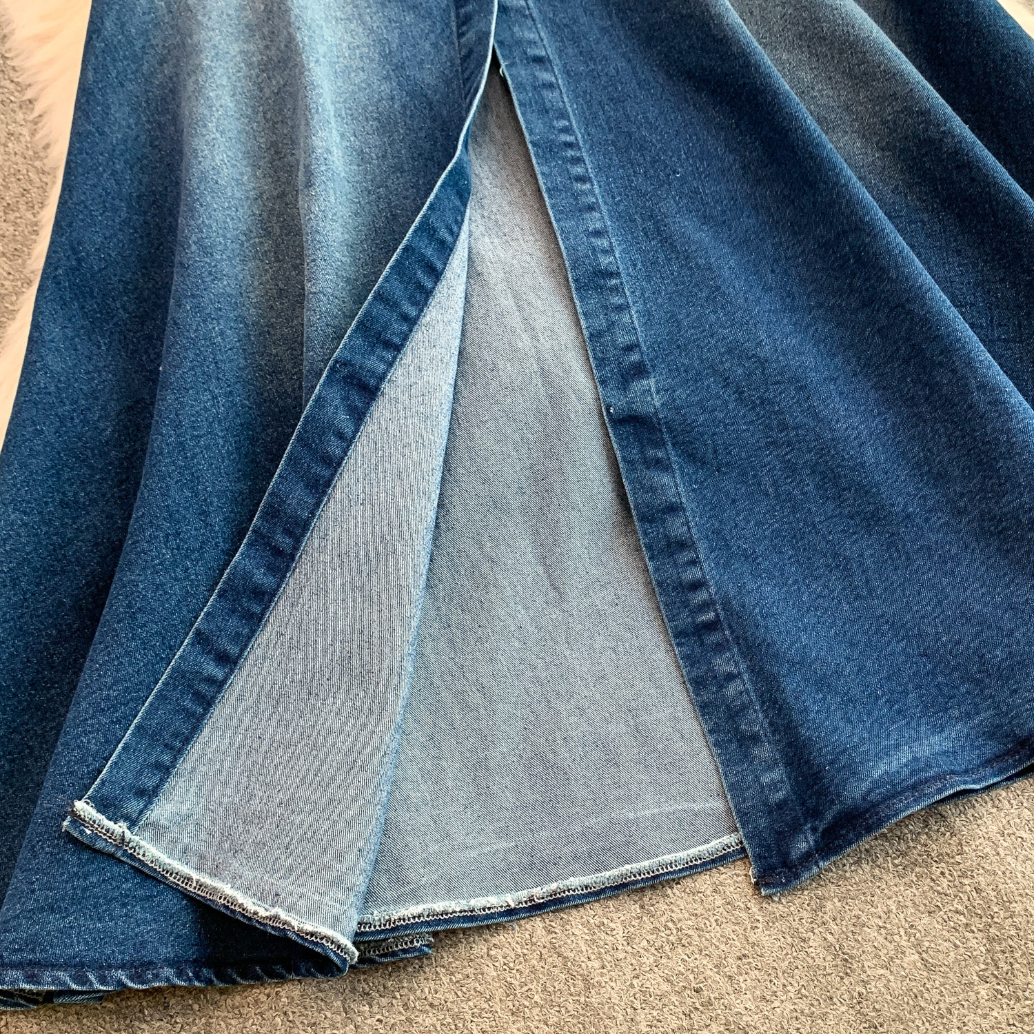 European and American Niche Goddess-Style Fashionable and Sexy Single-Breasted Denim Suspender Dress for Women, Spring and Autumn Elegant Slit Long Dress