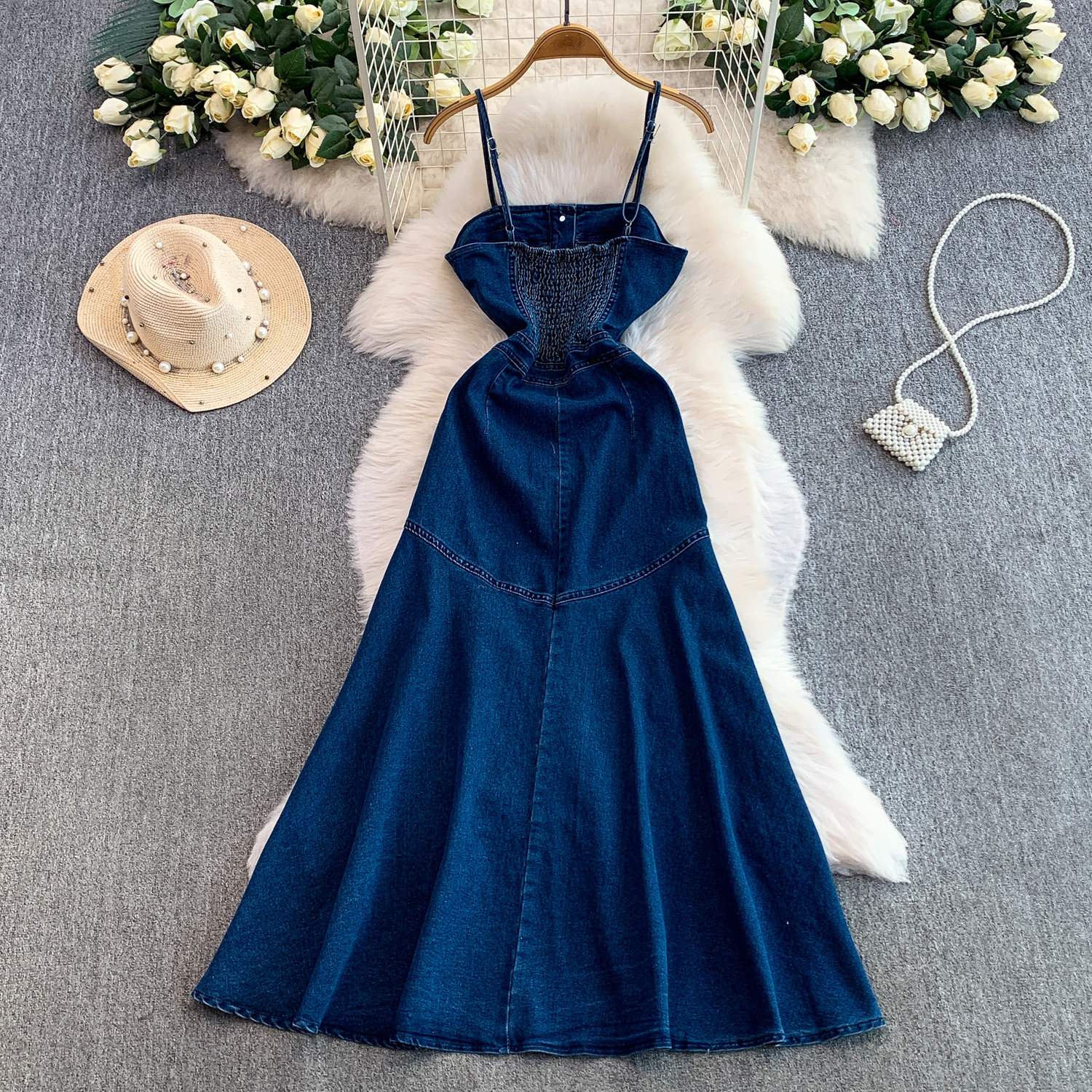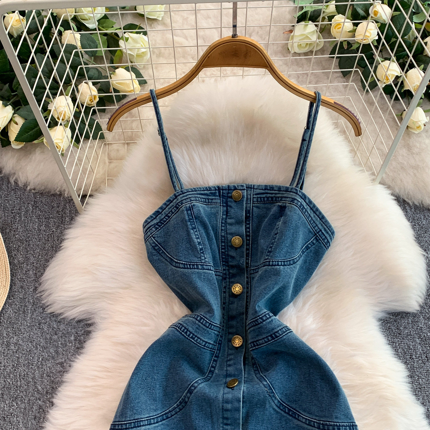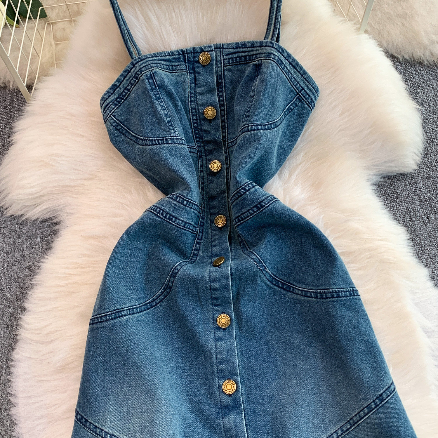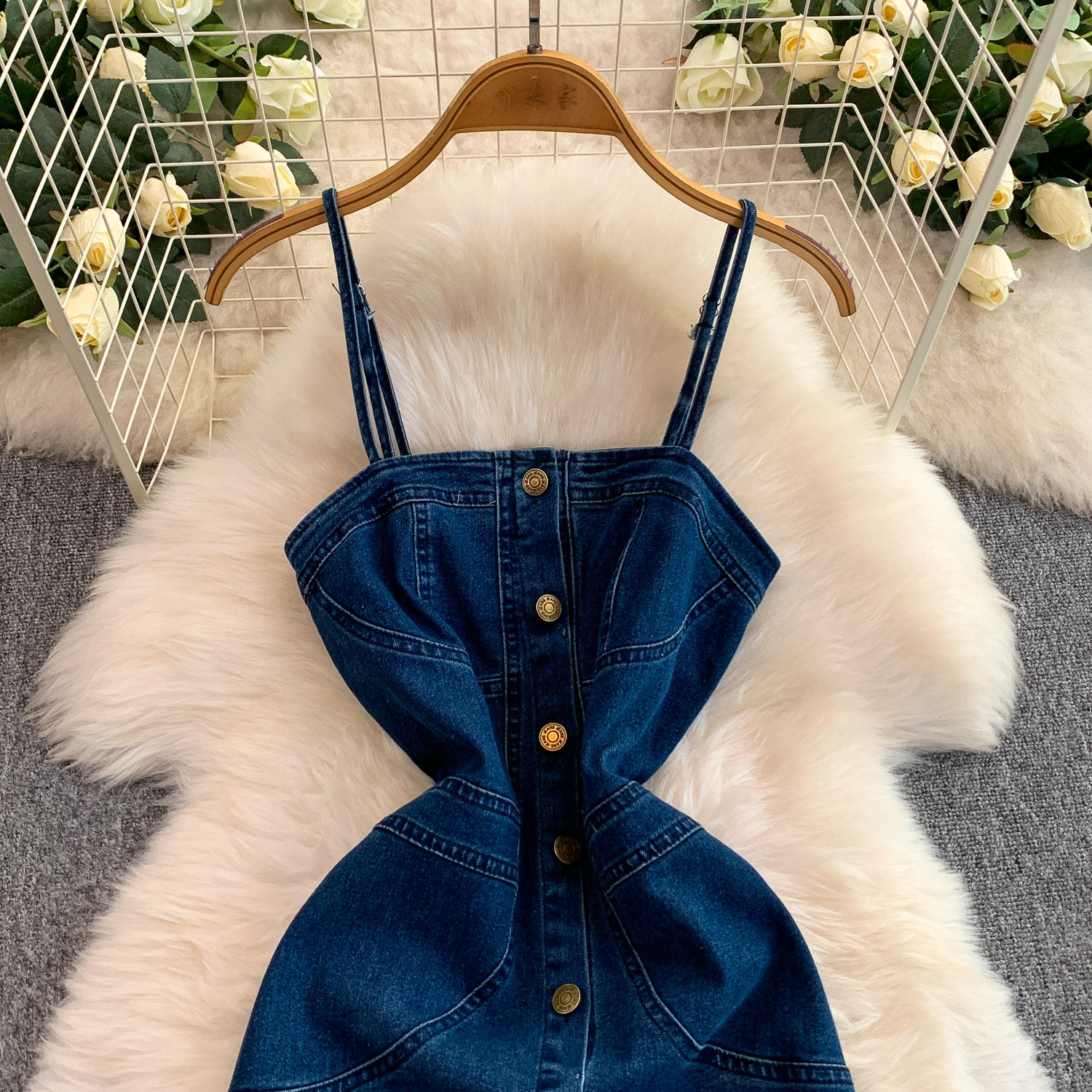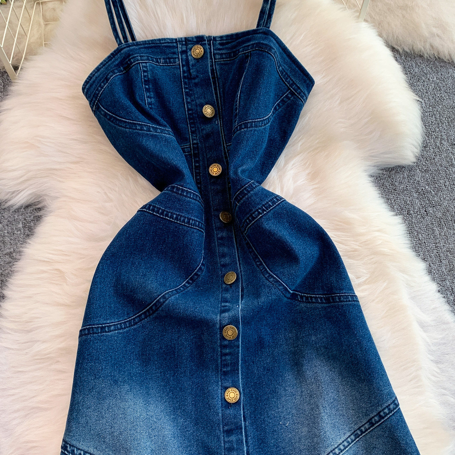 European and American Niche Goddess-Style Fashionable and Sexy Single-Breasted Denim Suspender Dress for Women, Spring and Autumn Elegant Slit Long Dress
