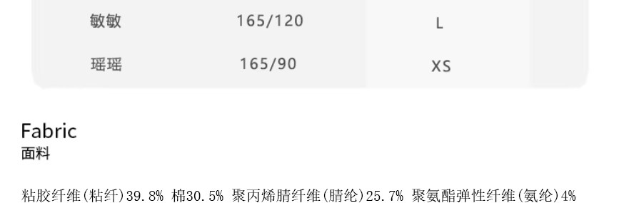 Material Composition Viscose Fiber (Viscose Fiber) 39.8% Cotton 30.5% Polyacrylonitrile Fiber (Acrylic Fiber) 25.7% Polyurethane Elastic Fiber (Spandex) 4%