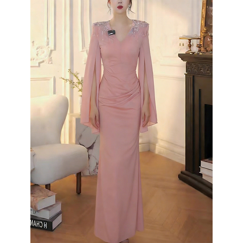 Mijie 2026 Spring Light Luxury Elegant Style V-Neck Sequin Dress for Women, Waist-Cinching Slimming Cape Sleeve Long Dress