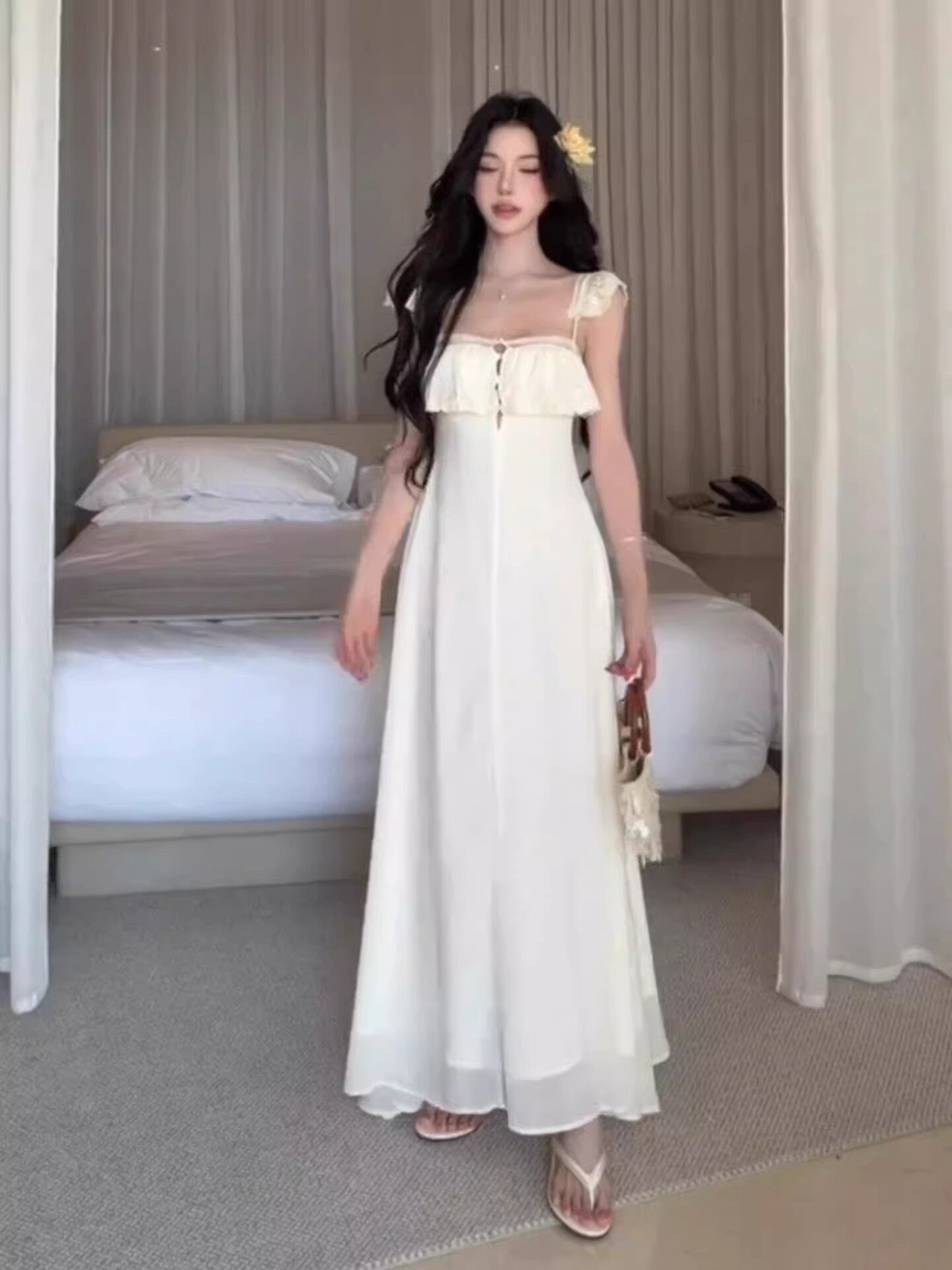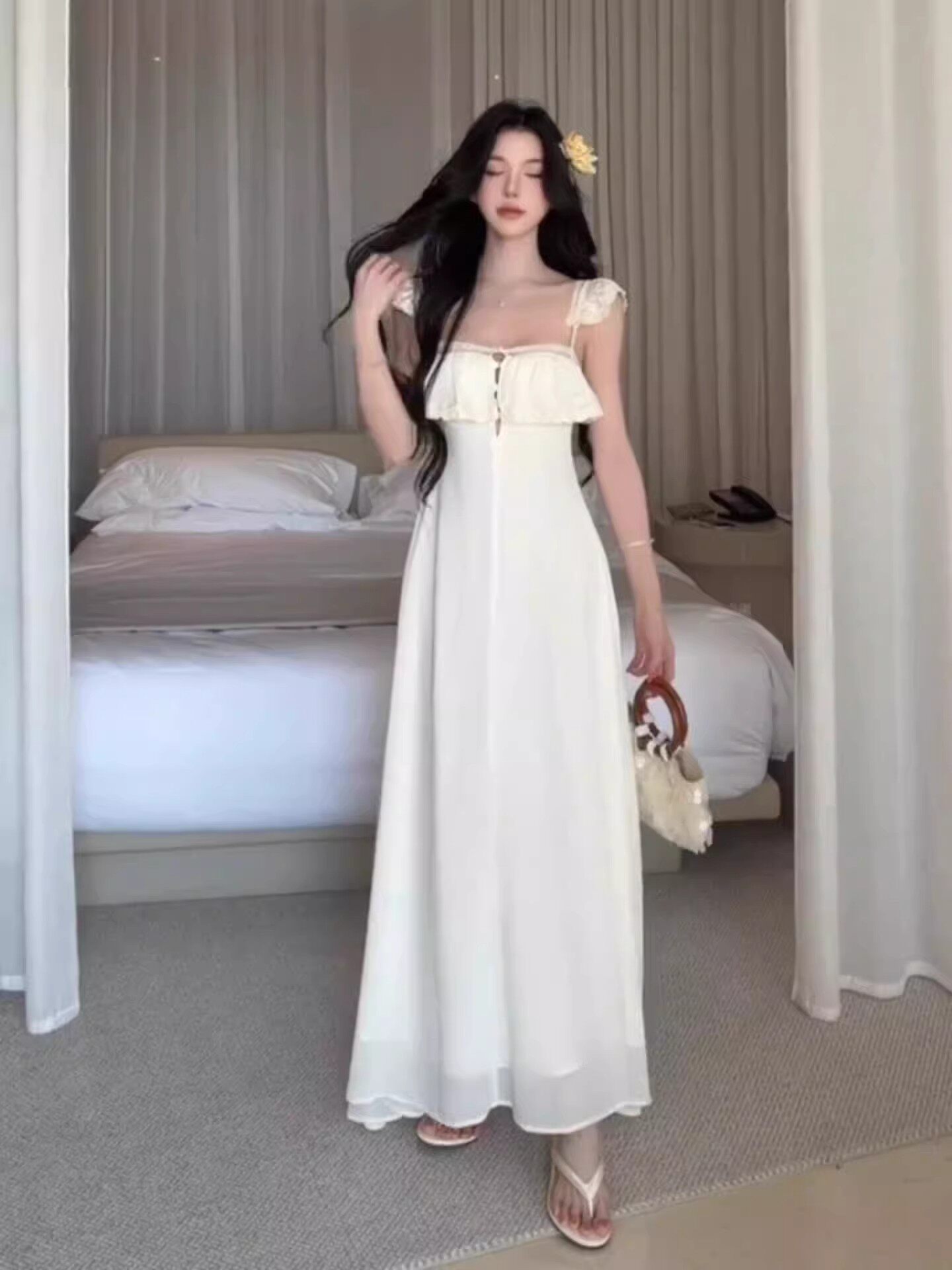 French-Style Rose-Red Lace Ruffle Strap Dress for Women, Perfect for Spring and Autumn, with a Stunning and Elegant Design, Waist-Cinching, and a Long, Flowing Skirt