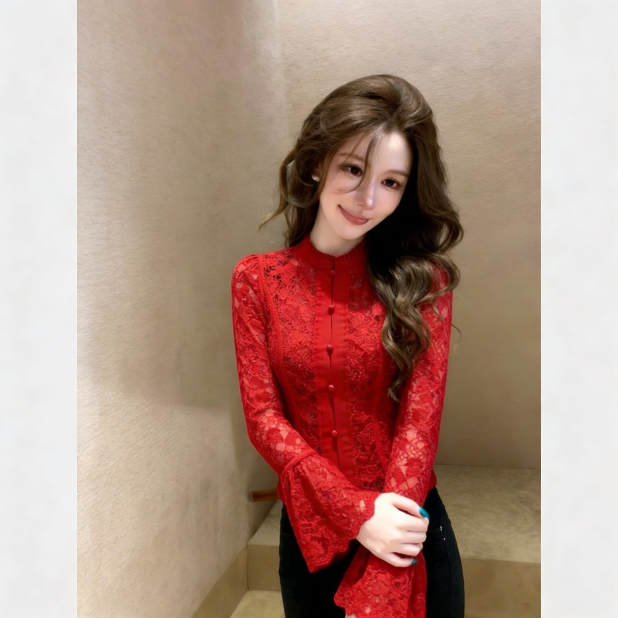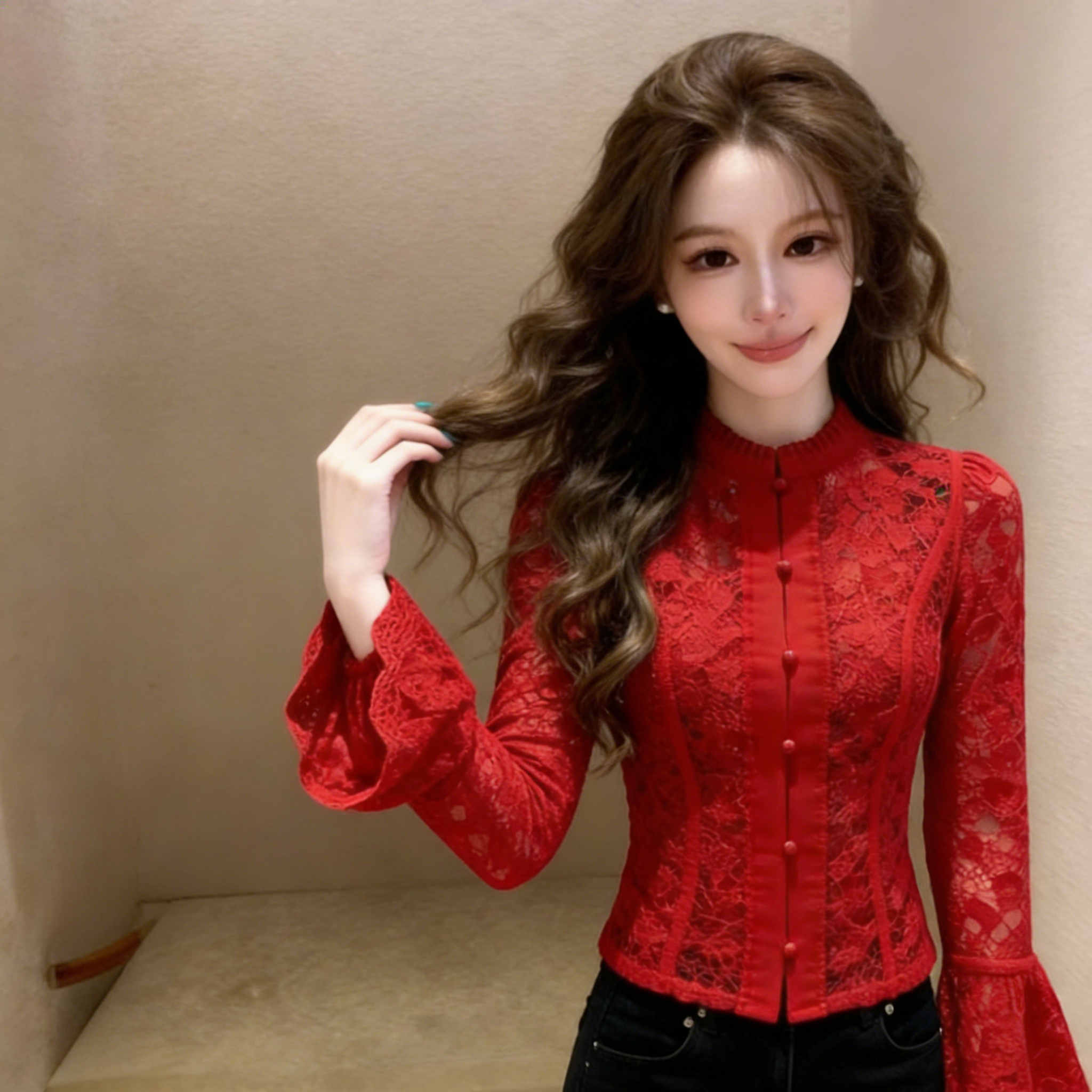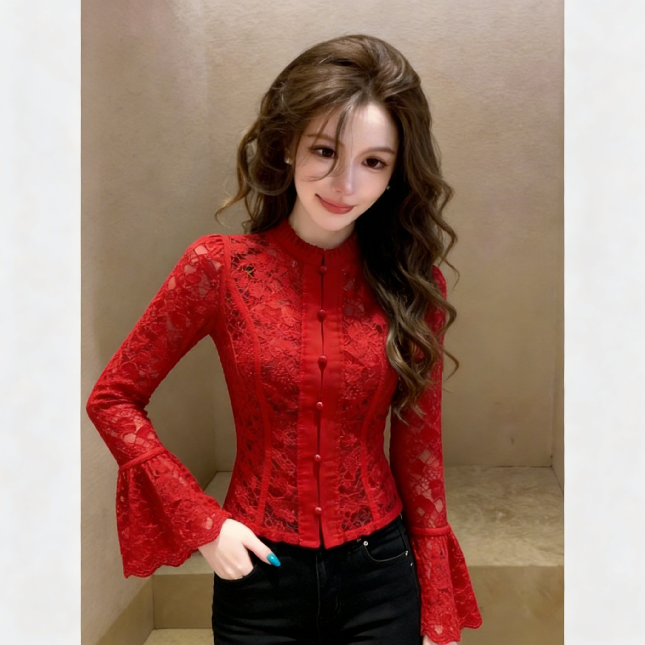 (in Stock) Red Lace Shirt for Women, 2026 Spring Collection, Light Luxury, High-End, Unique, Beautiful, Super Stylish French-Style Top