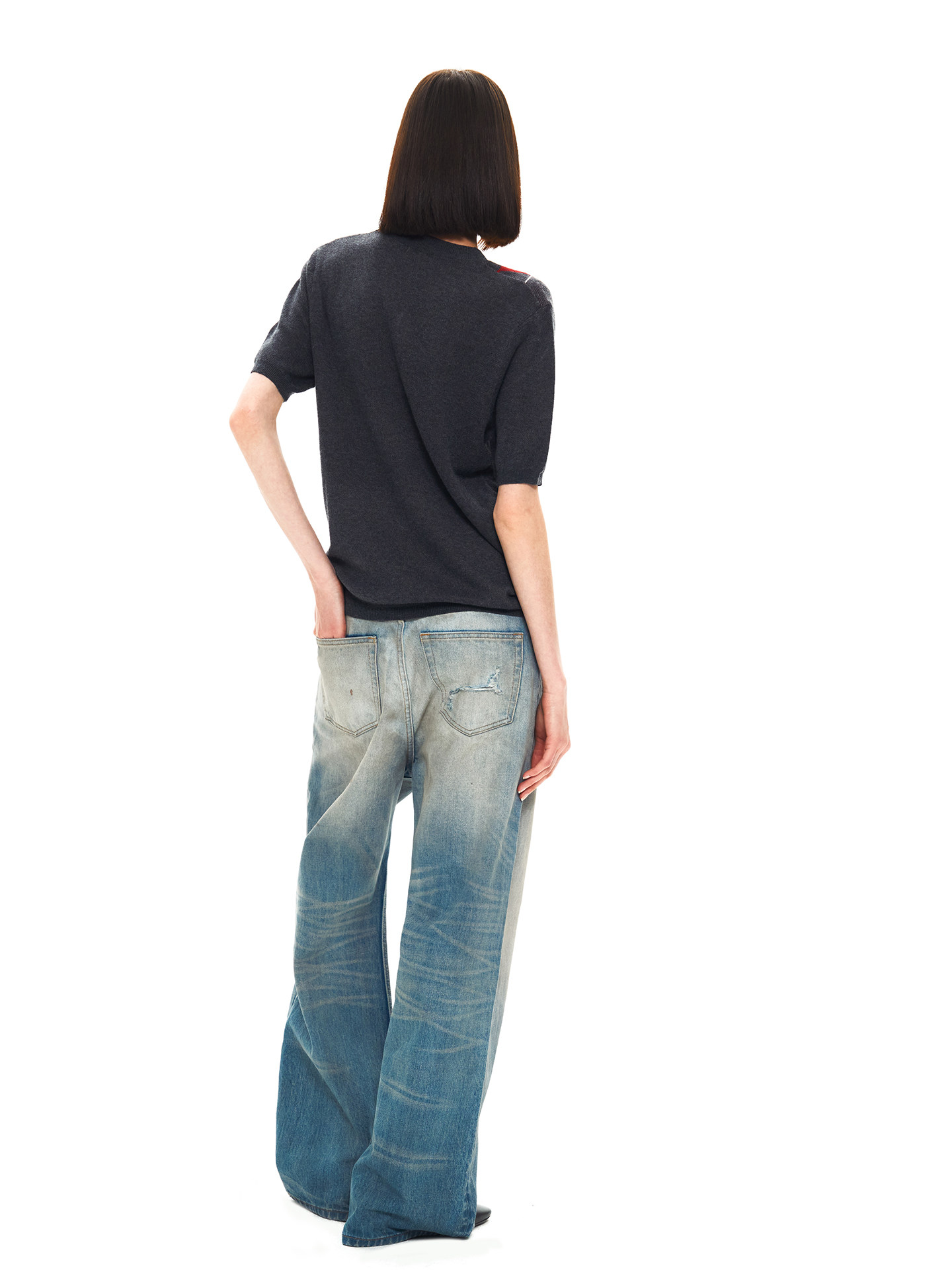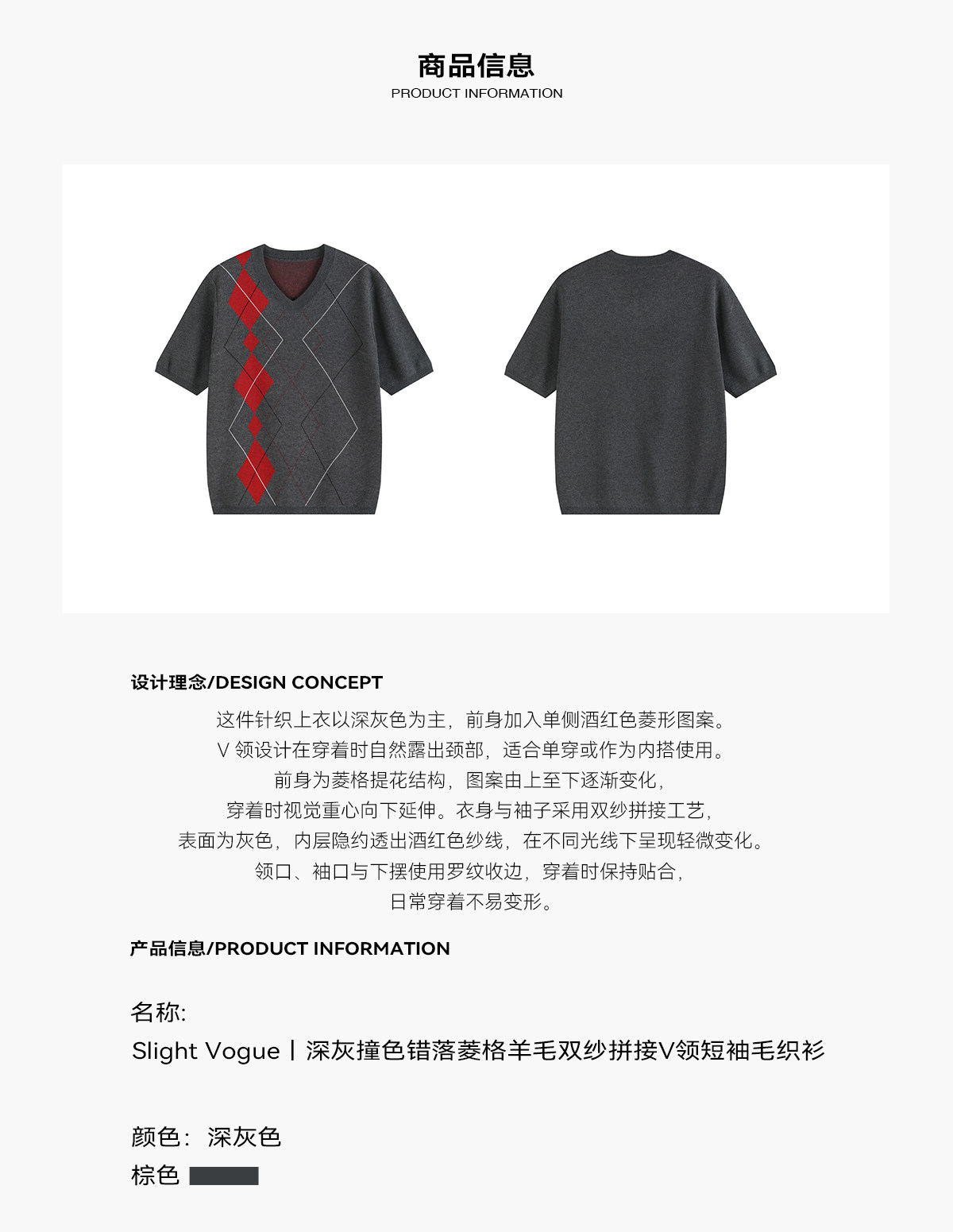 Slight Vogue丨Dark gray contrasting diamond wool double yarn splicing V-neck short-sleeved sweater
