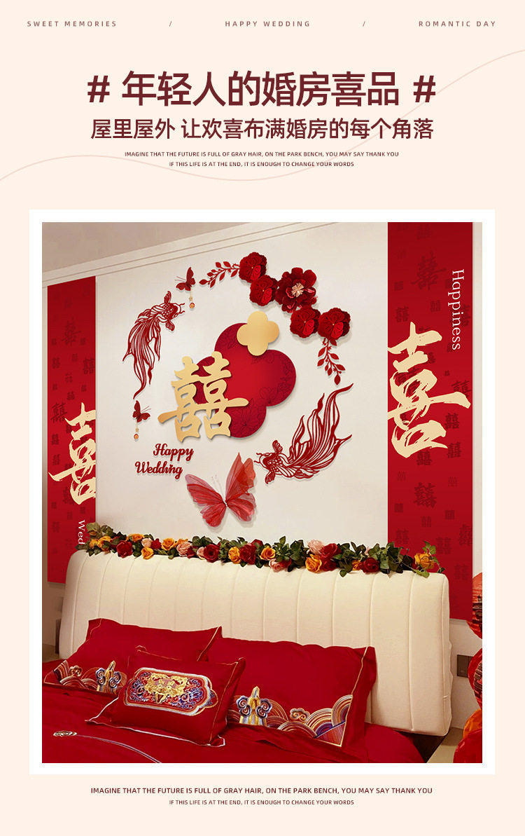 Wedding Room Decoration Set, Wedding Bedroom Headboard Background Wall Decoration, Double Happiness Character Garland, Complete Collection of Wedding Supplies