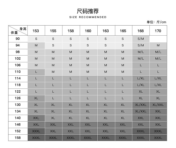 China (cm) 160-165/84-86 165-170 / 88-90 167-172 / 92-96 168-173 / 98-102 170-176 / 106-110