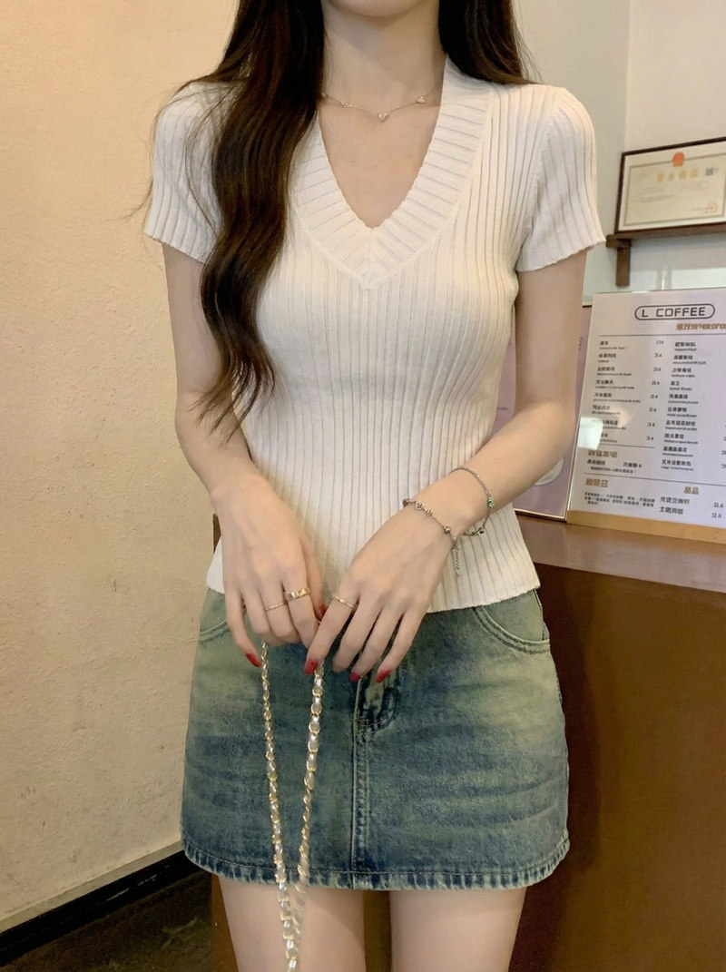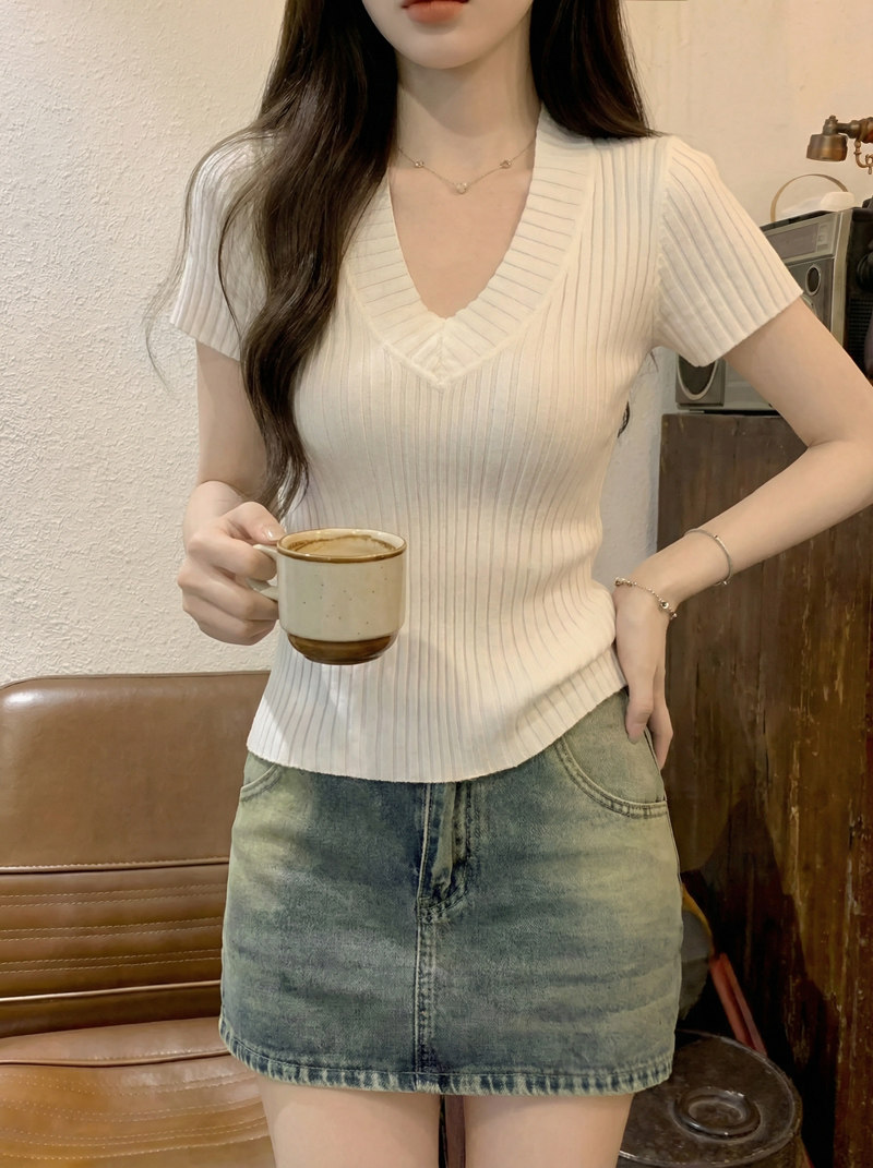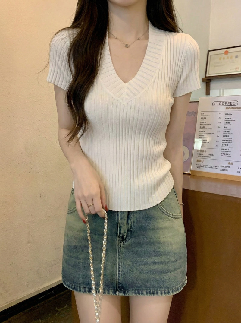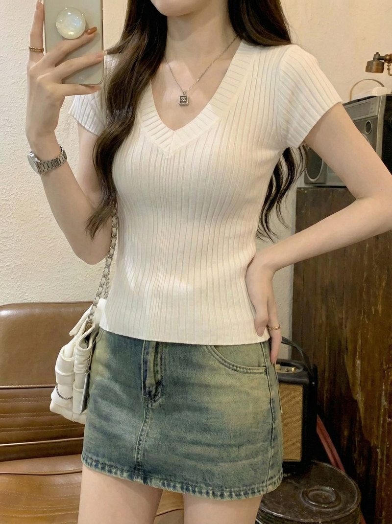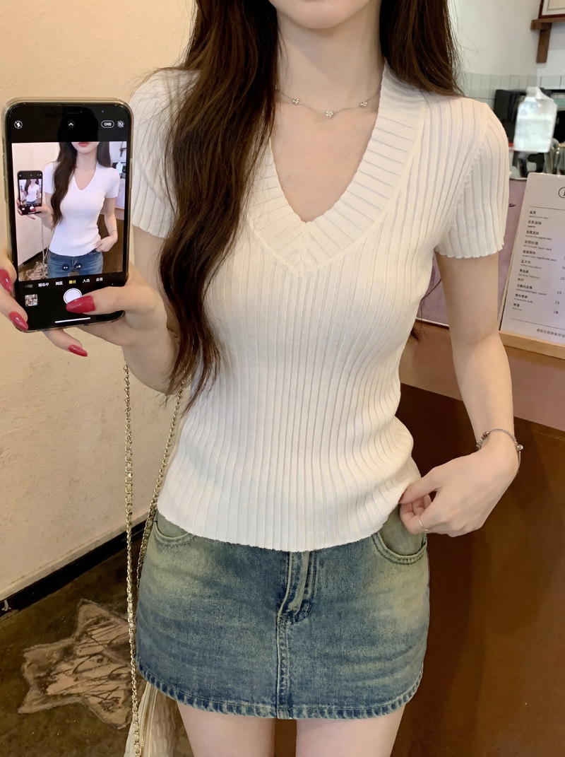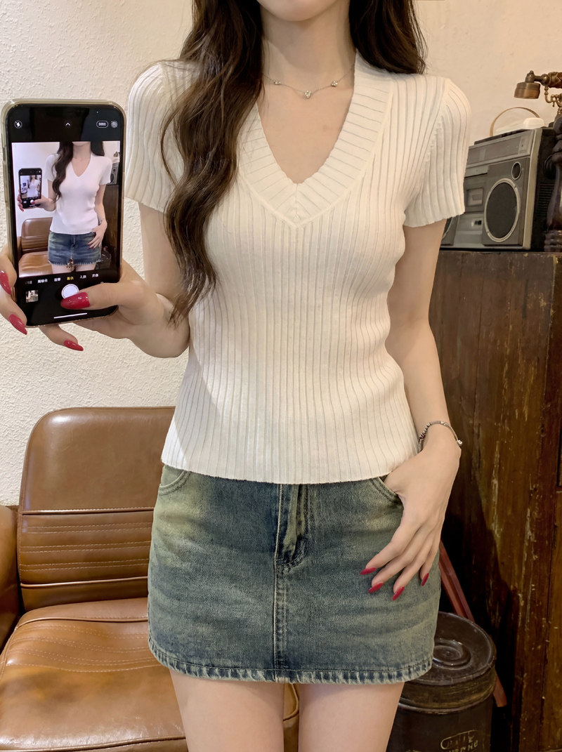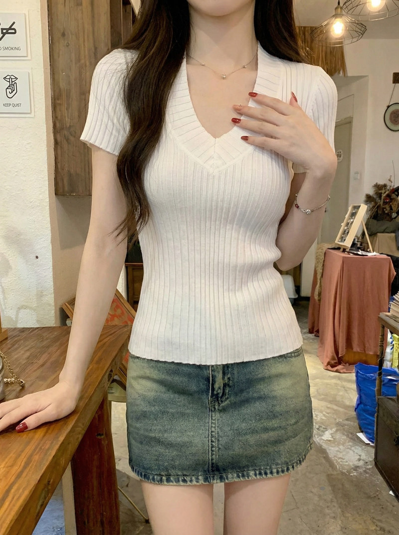 Gentle Korean-Style V-Neck Waist-Cinching Short-Sleeve Blouse for Women, Summer White Simple Fashion Slim-Fit Ribbed Elegant Top