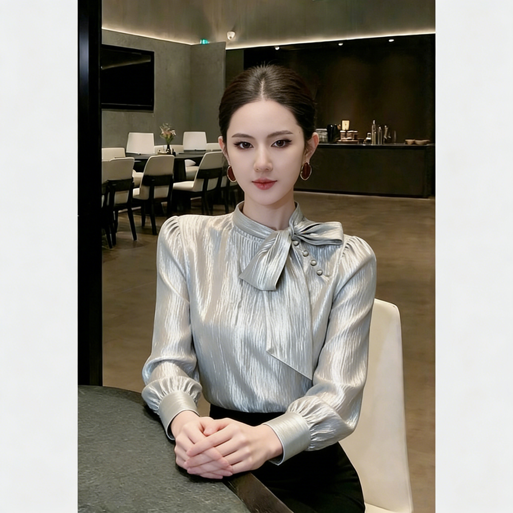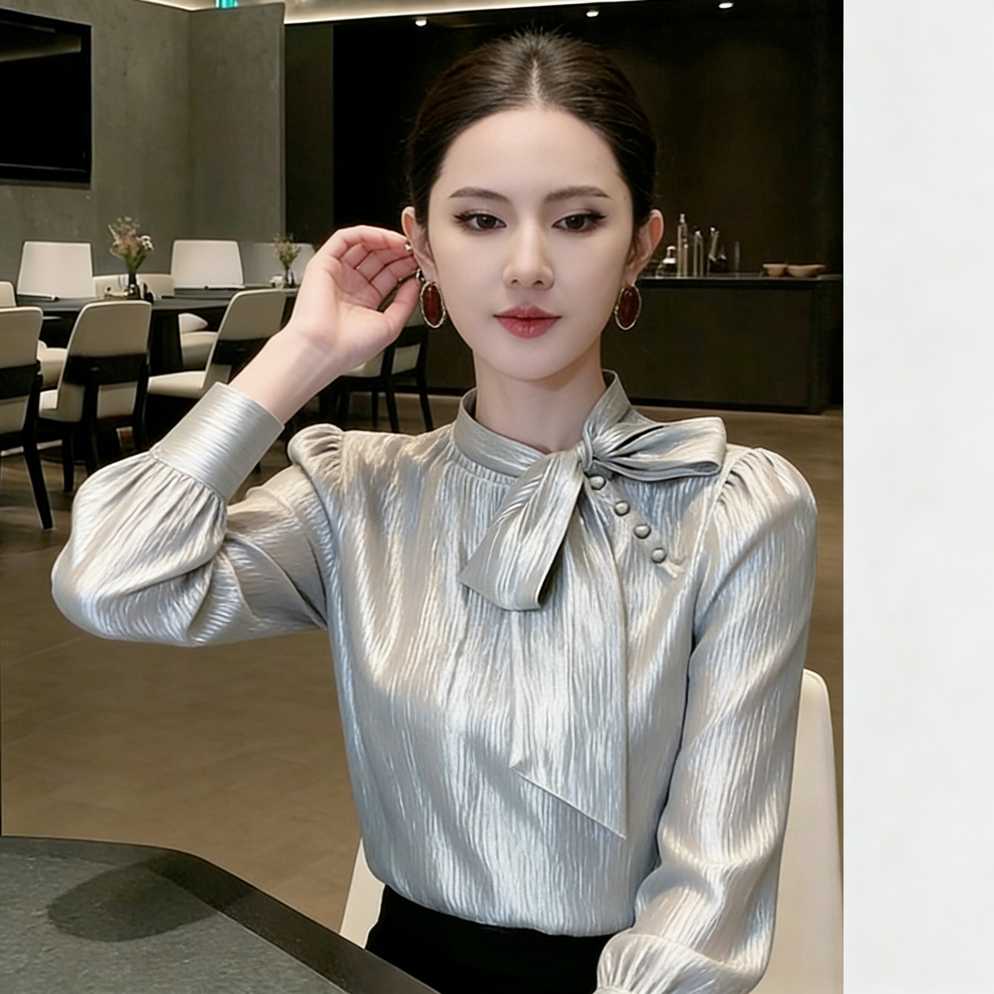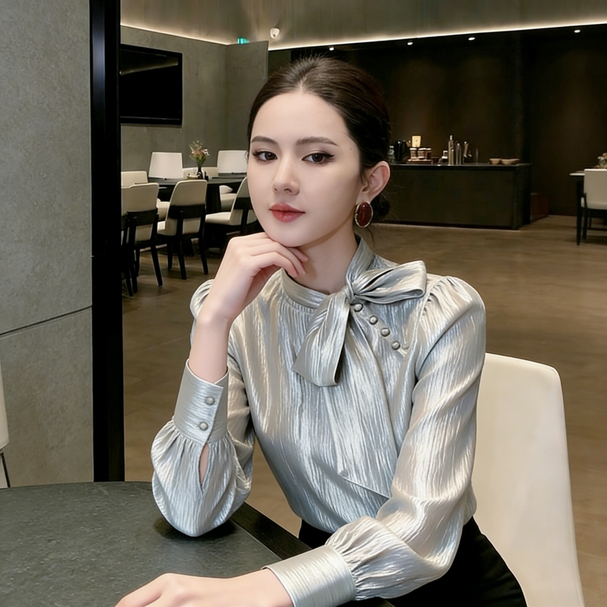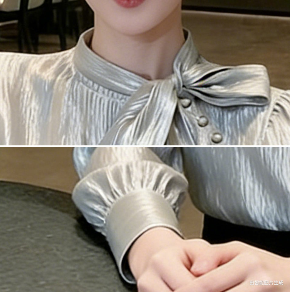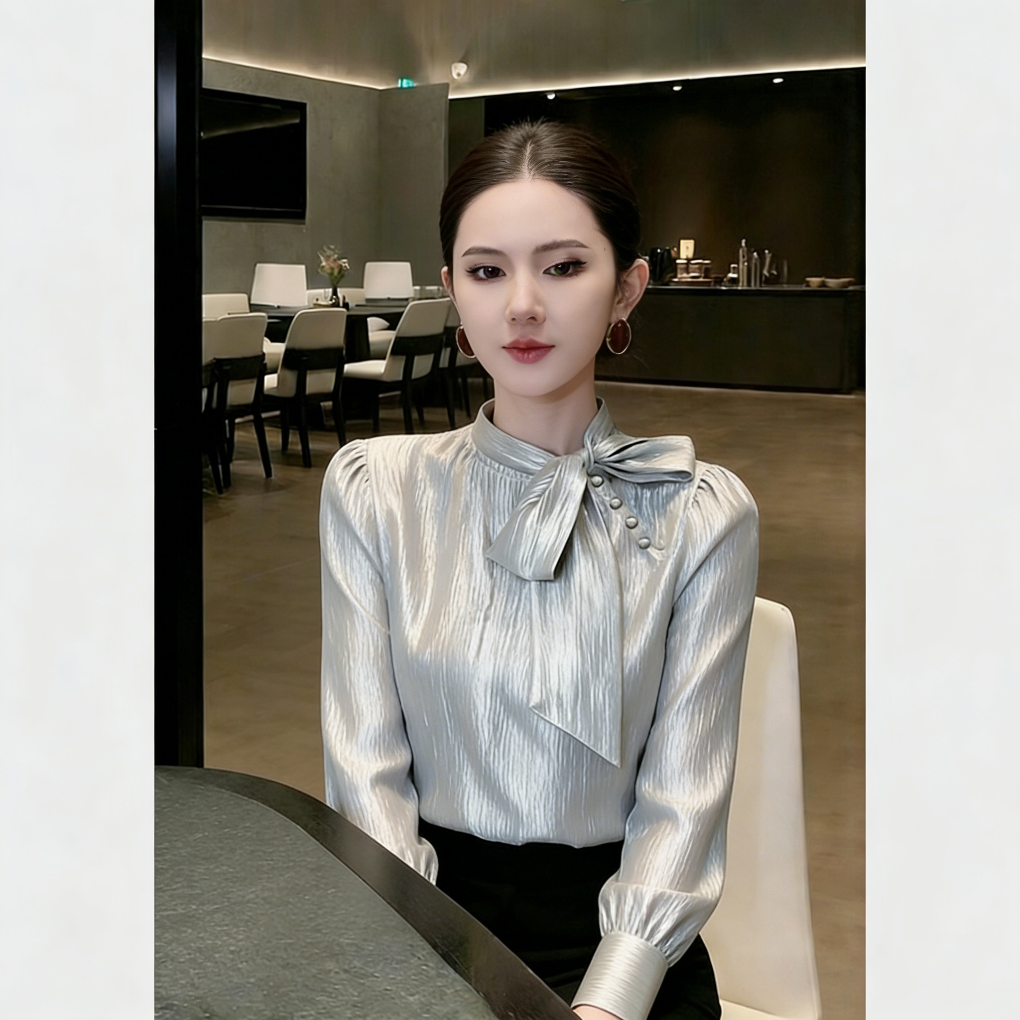 (in Stock) Silver Bow Tie Blouse 2026 Spring Elegant High-End French Style Versatile Shirt