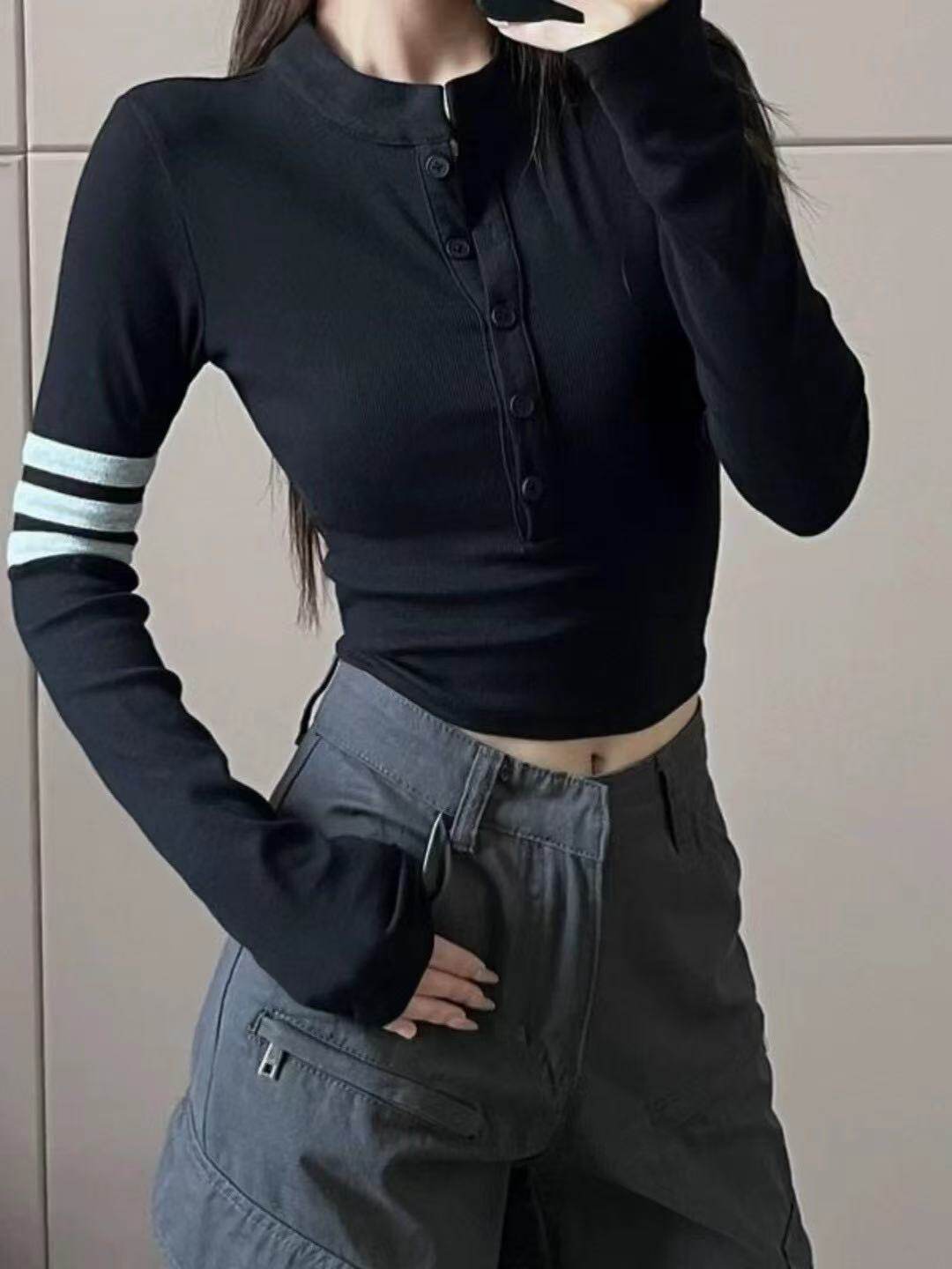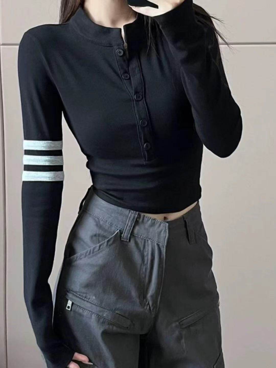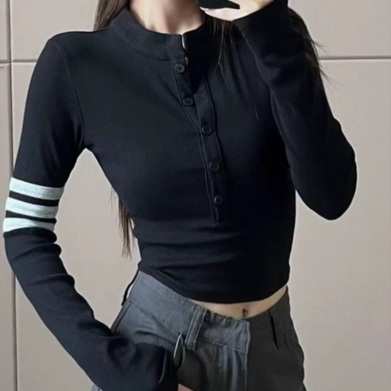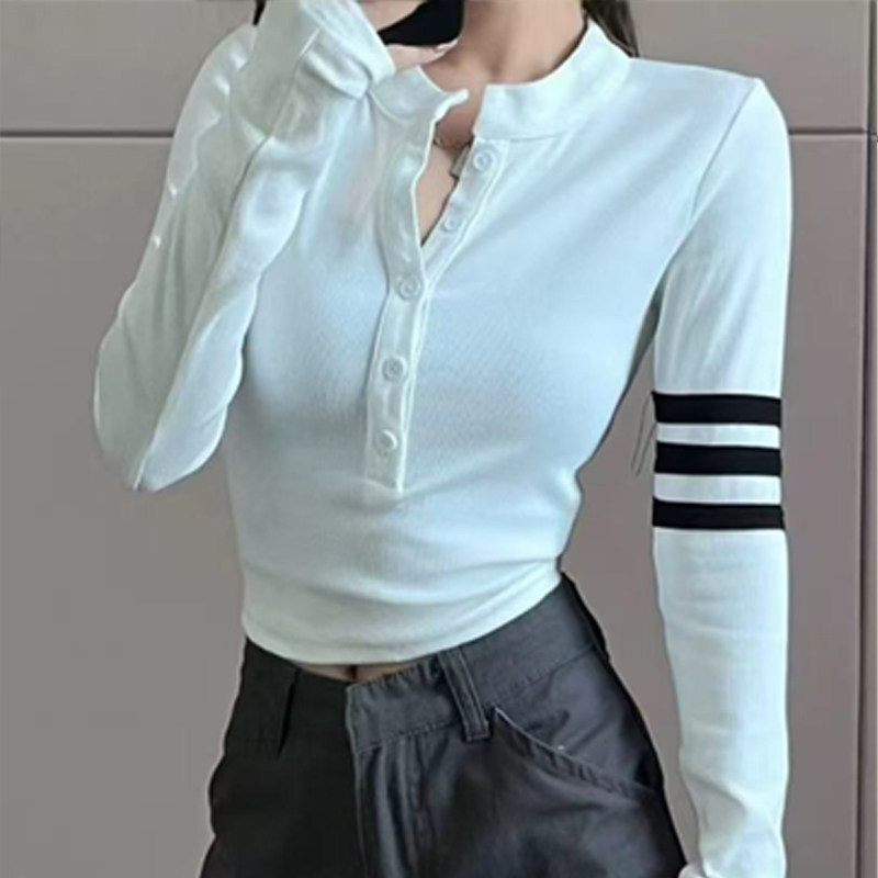 Korean Style Stand Collar Single-Breasted Long-Sleeve T-Shirt for Women, Spring Spicy Girl Style Slim Fit Short Striped Patchwork Base Shirt Top