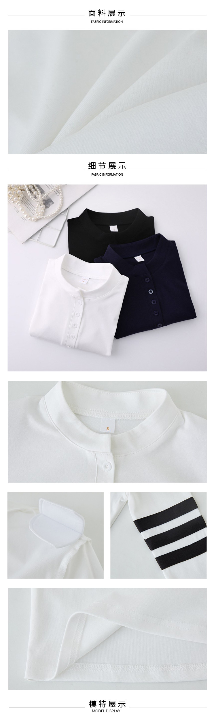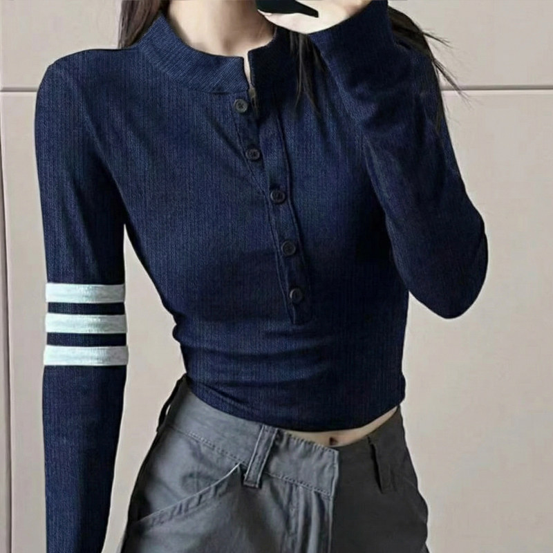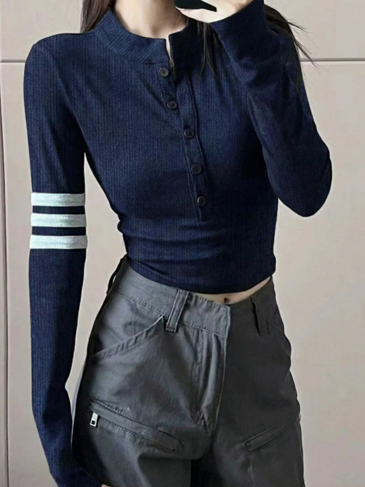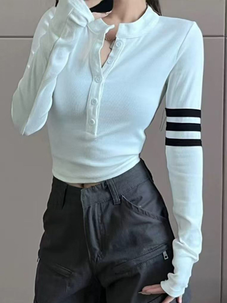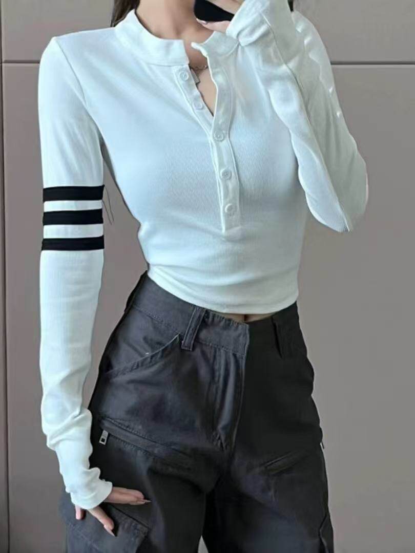 Korean Style Stand Collar Single-Breasted Long-Sleeve T-Shirt for Women, Spring Spicy Girl Style Slim Fit Short Striped Patchwork Base Shirt Top