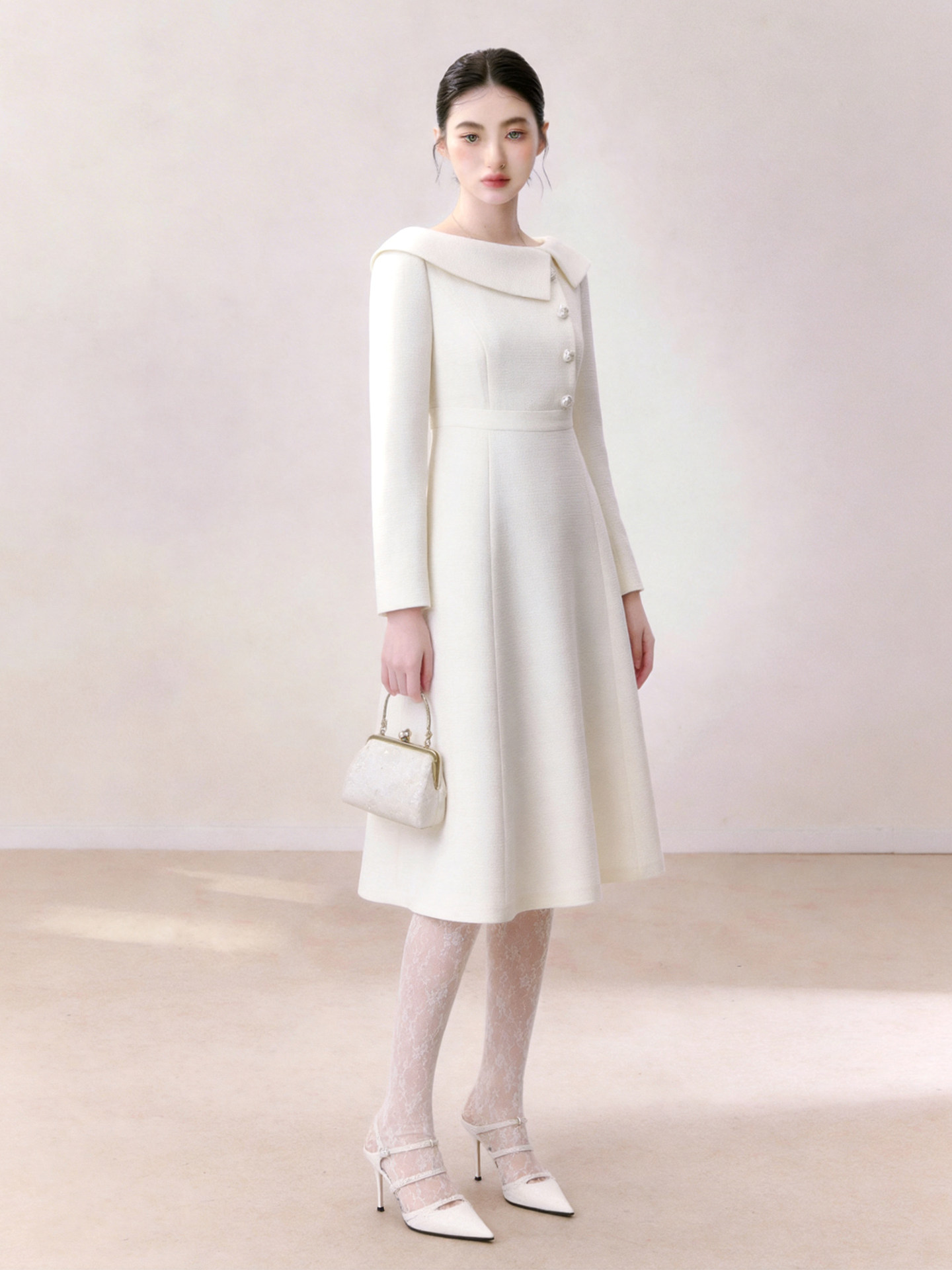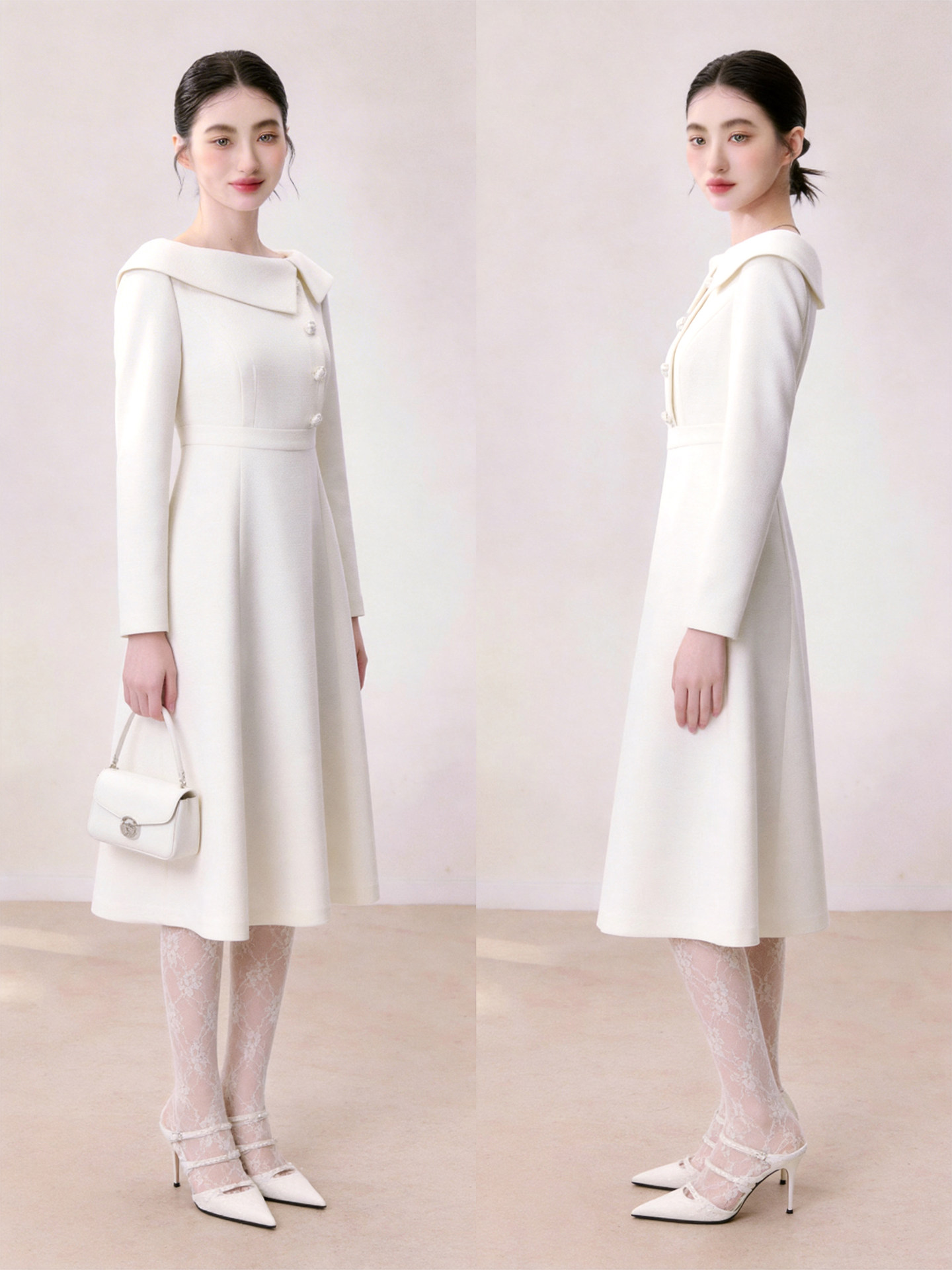 French Elegant Style White Lapel Dress for Women 2026 Summer Long-Sleeved Waist-Cinching A-Line Dress for Date and Party Wear