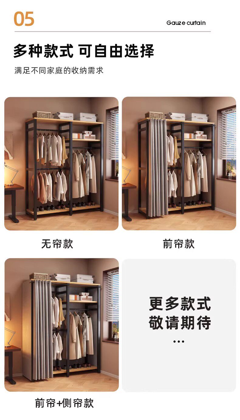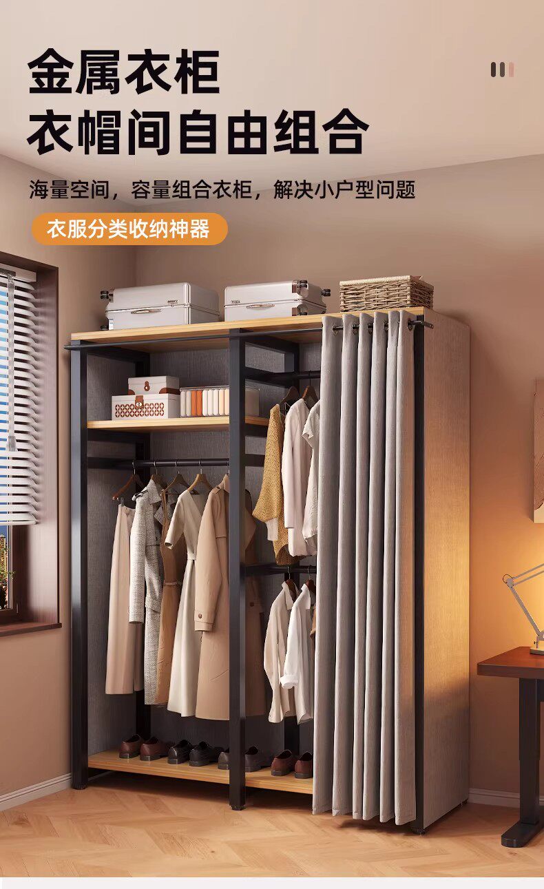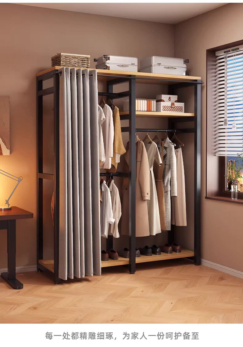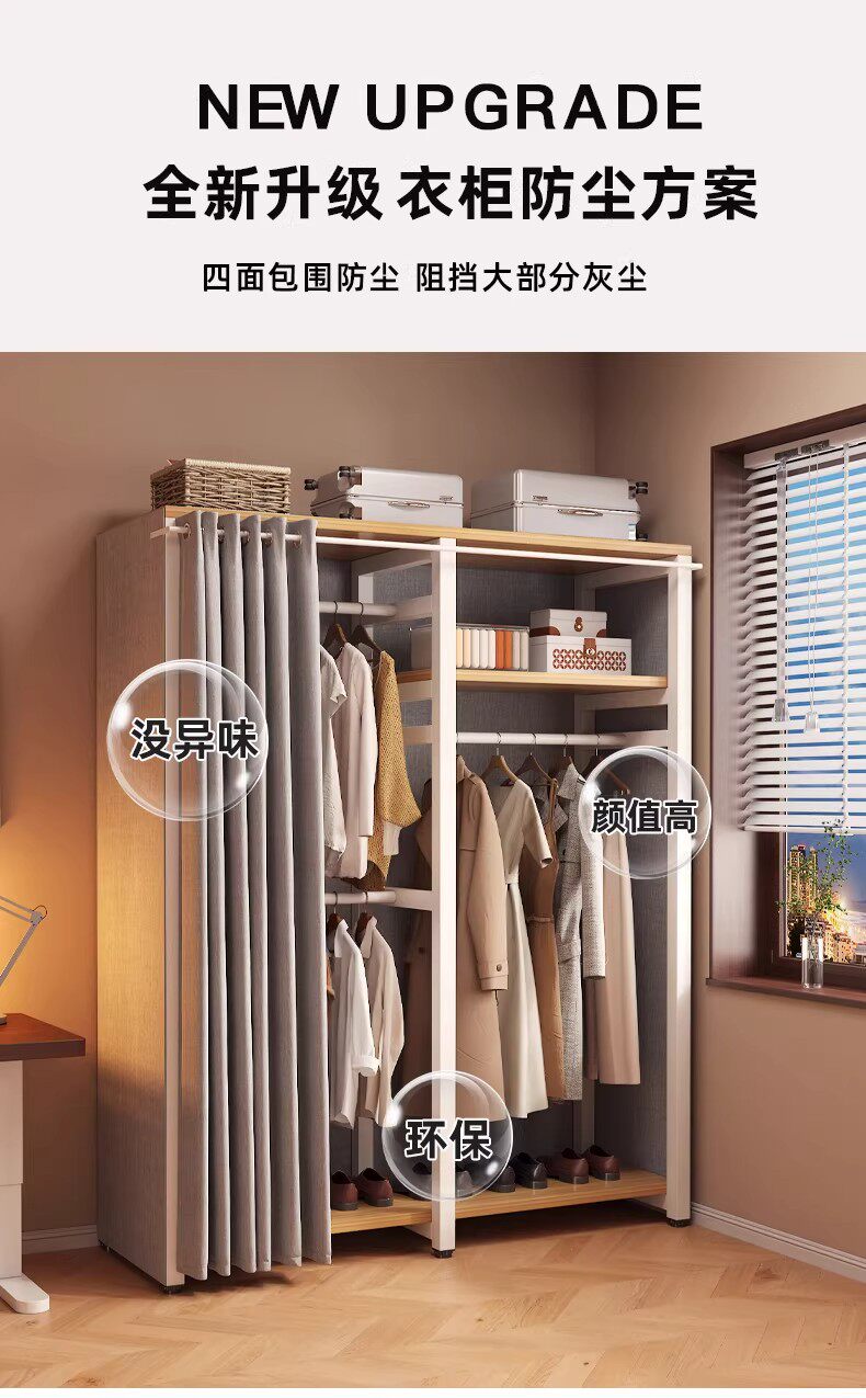 German Wardrobe Coat Rack for Home Use, Floor-Standing Bedroom Dust-Proof Metal Storage Rack, Simple Wardrobe, Sturdy and Durable Steel-Wood