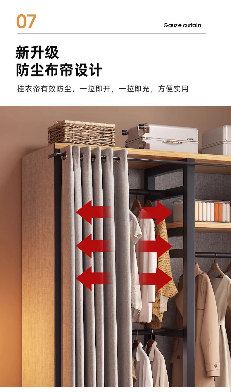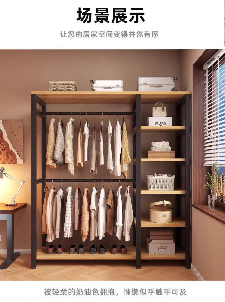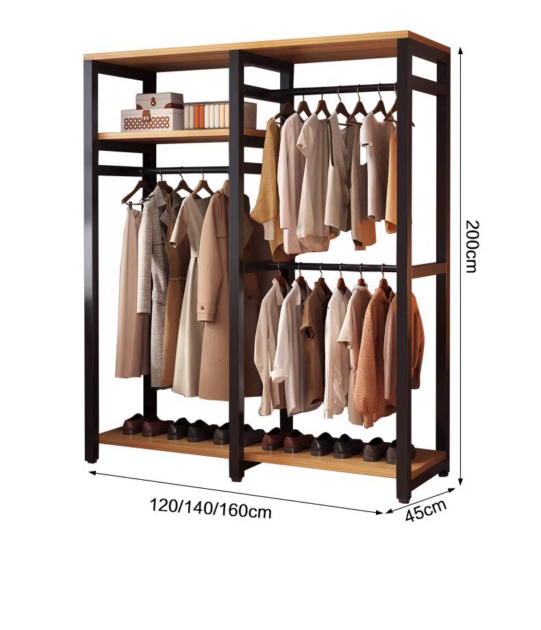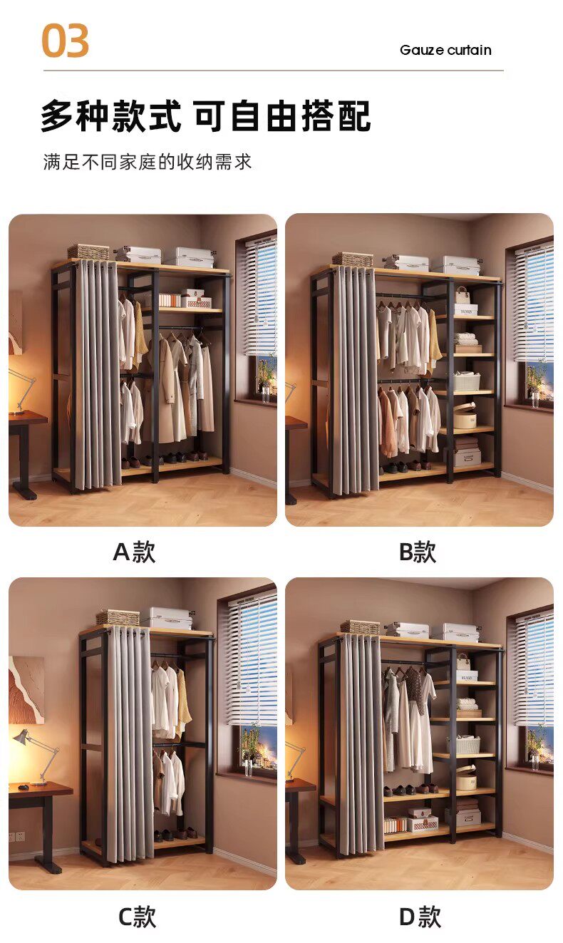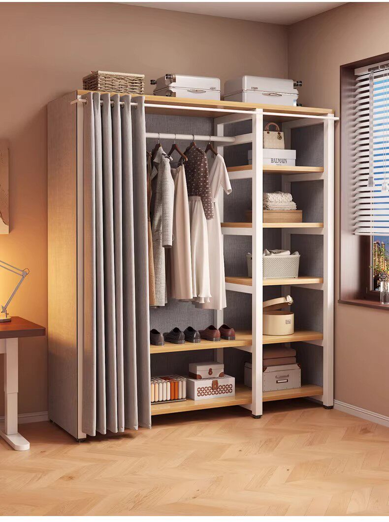 German Wardrobe Coat Rack for Home Use, Floor-Standing Bedroom Dust-Proof Metal Storage Rack, Simple Wardrobe, Sturdy and Durable Steel-Wood