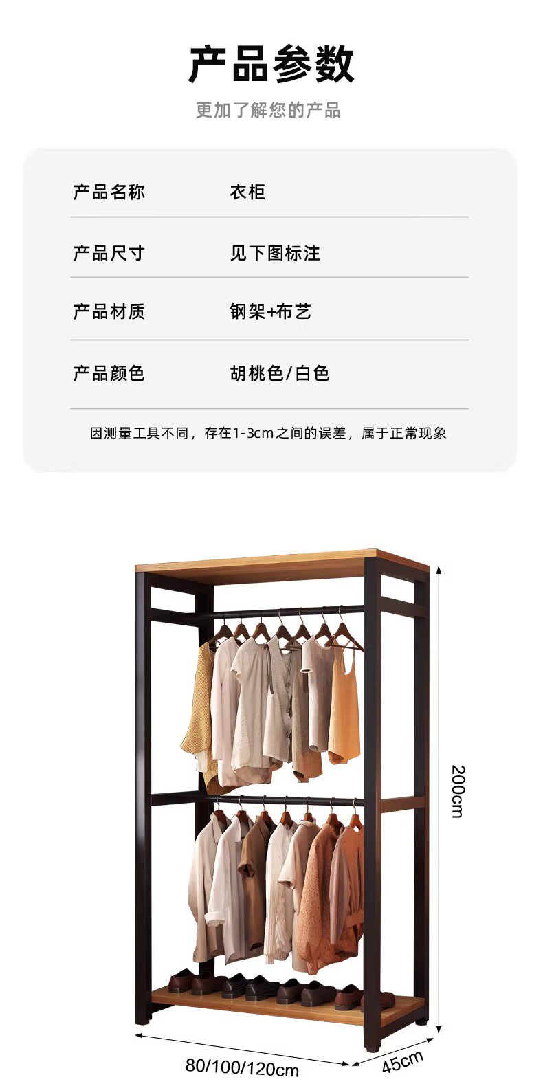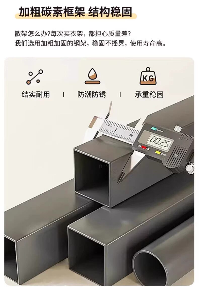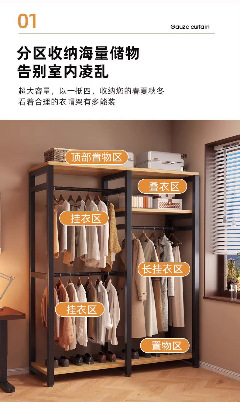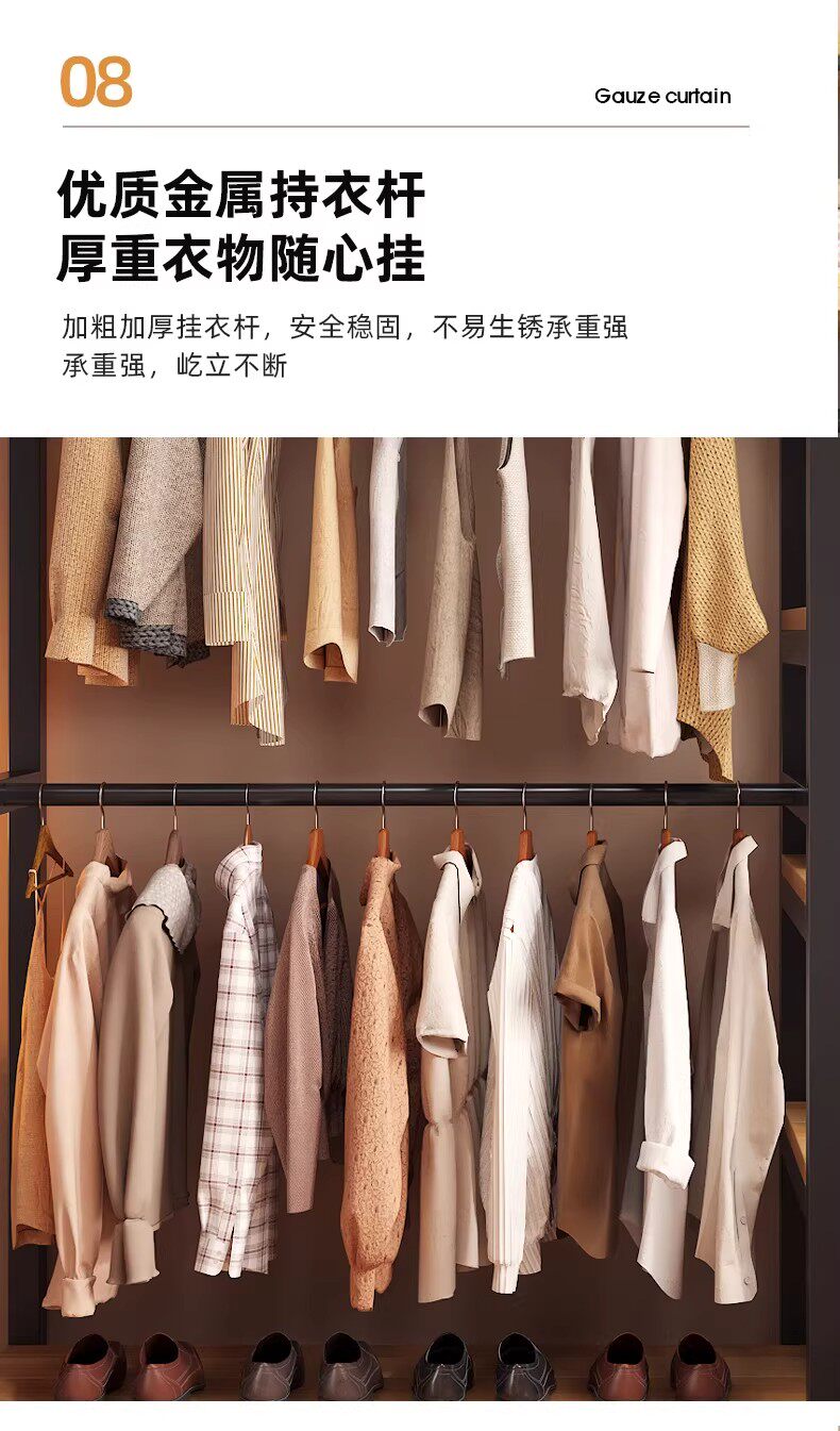 German Wardrobe Coat Rack for Home Use, Floor-Standing Bedroom Dust-Proof Metal Storage Rack, Simple Wardrobe, Sturdy and Durable Steel-Wood