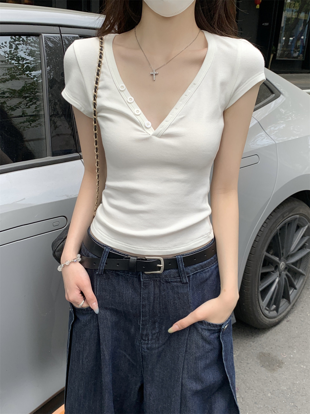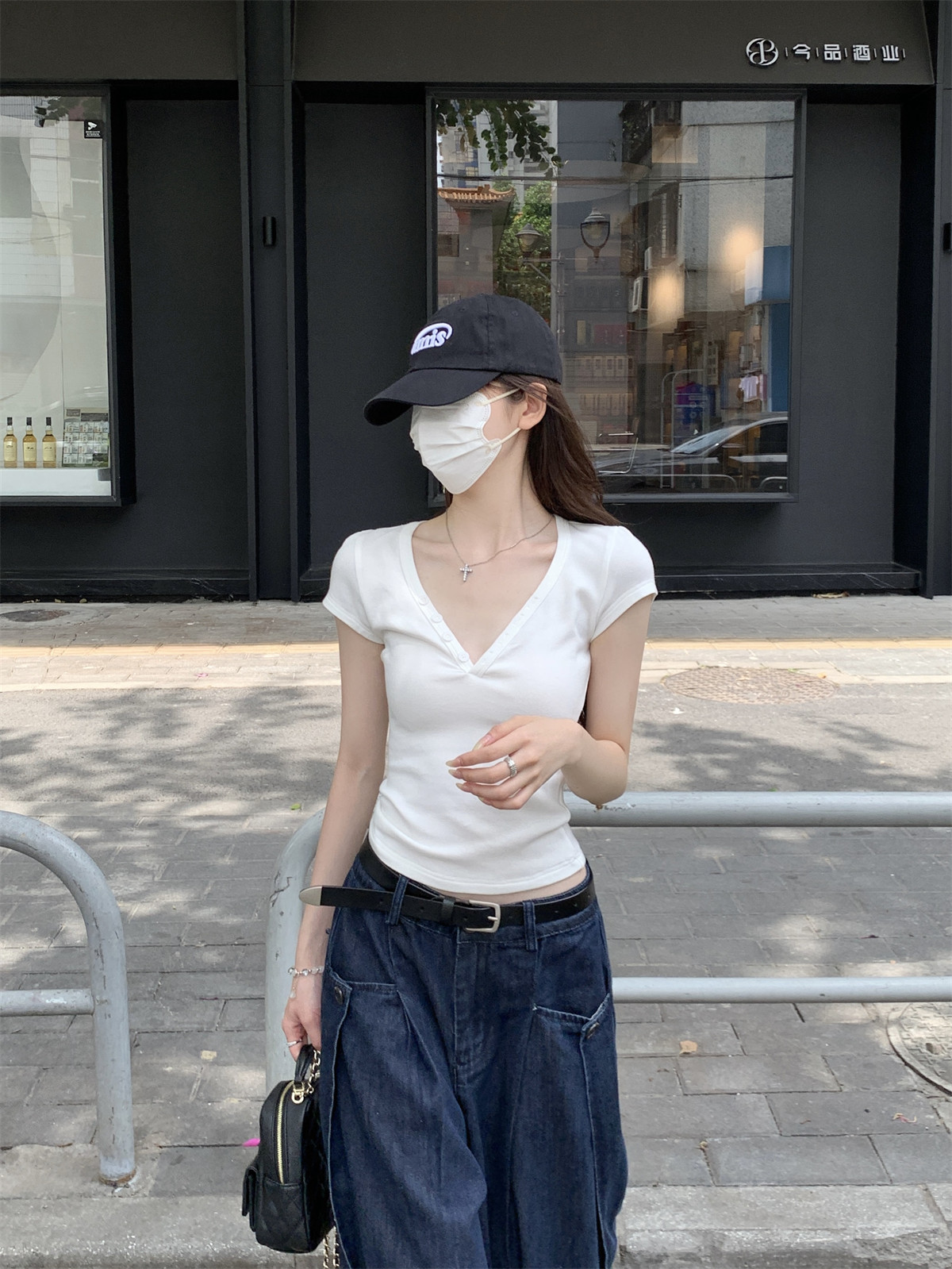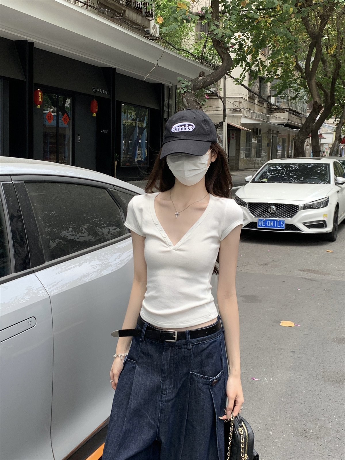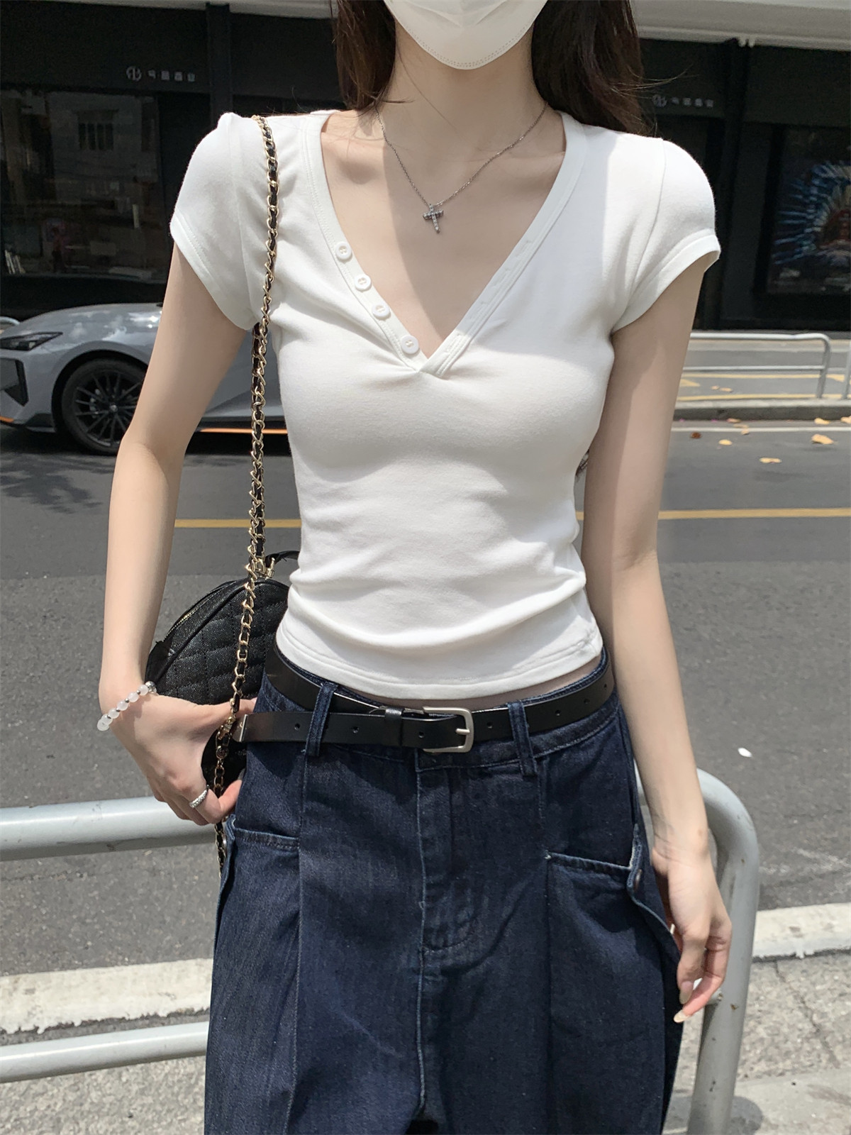 Elegant V-Neck Sexy Pure Desire Short-Sleeve T-Shirt for Women, 2026 Summer New Korean Style Slim-Fit Short Half-Sleeve Top