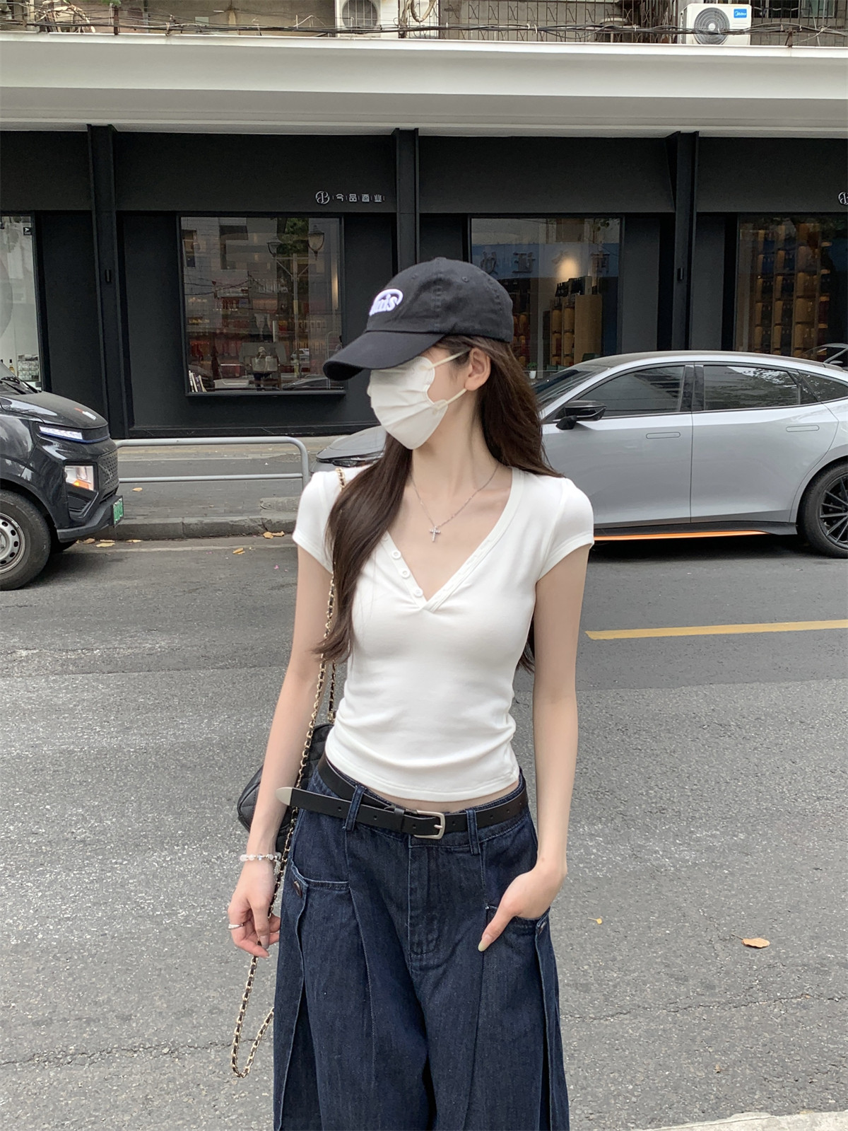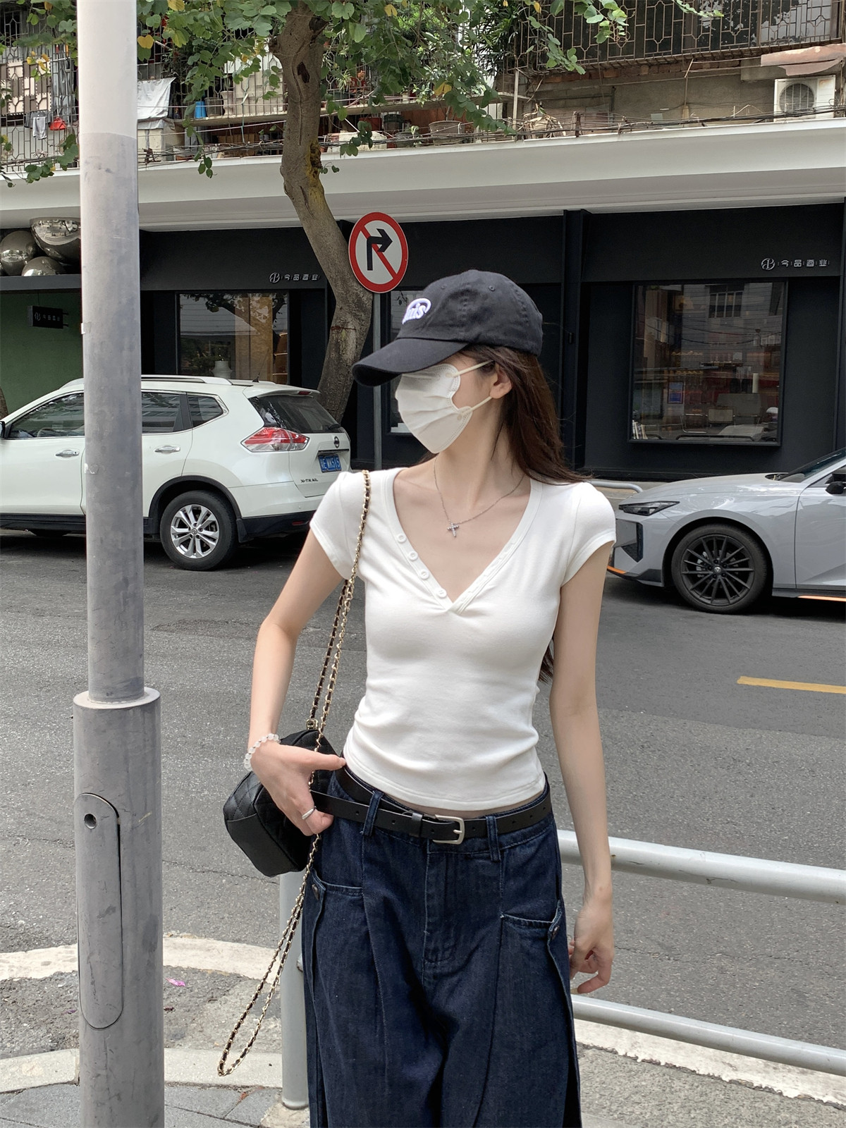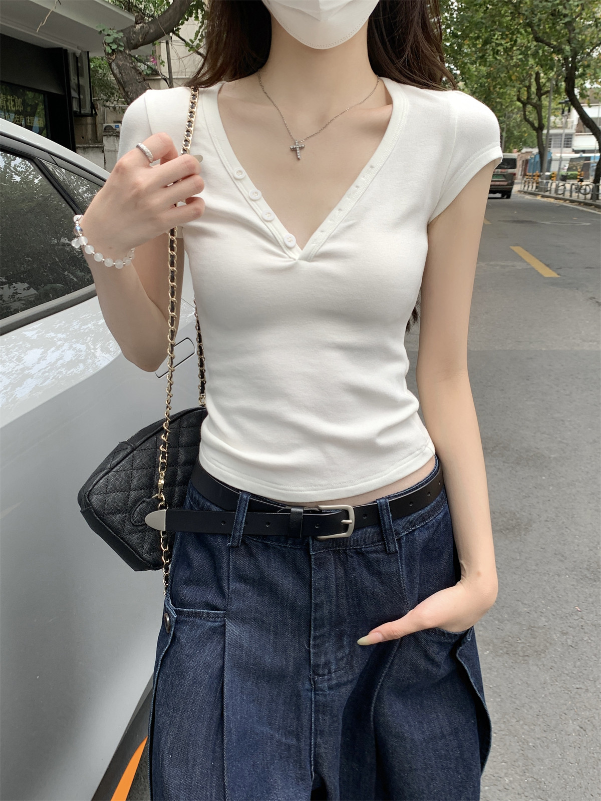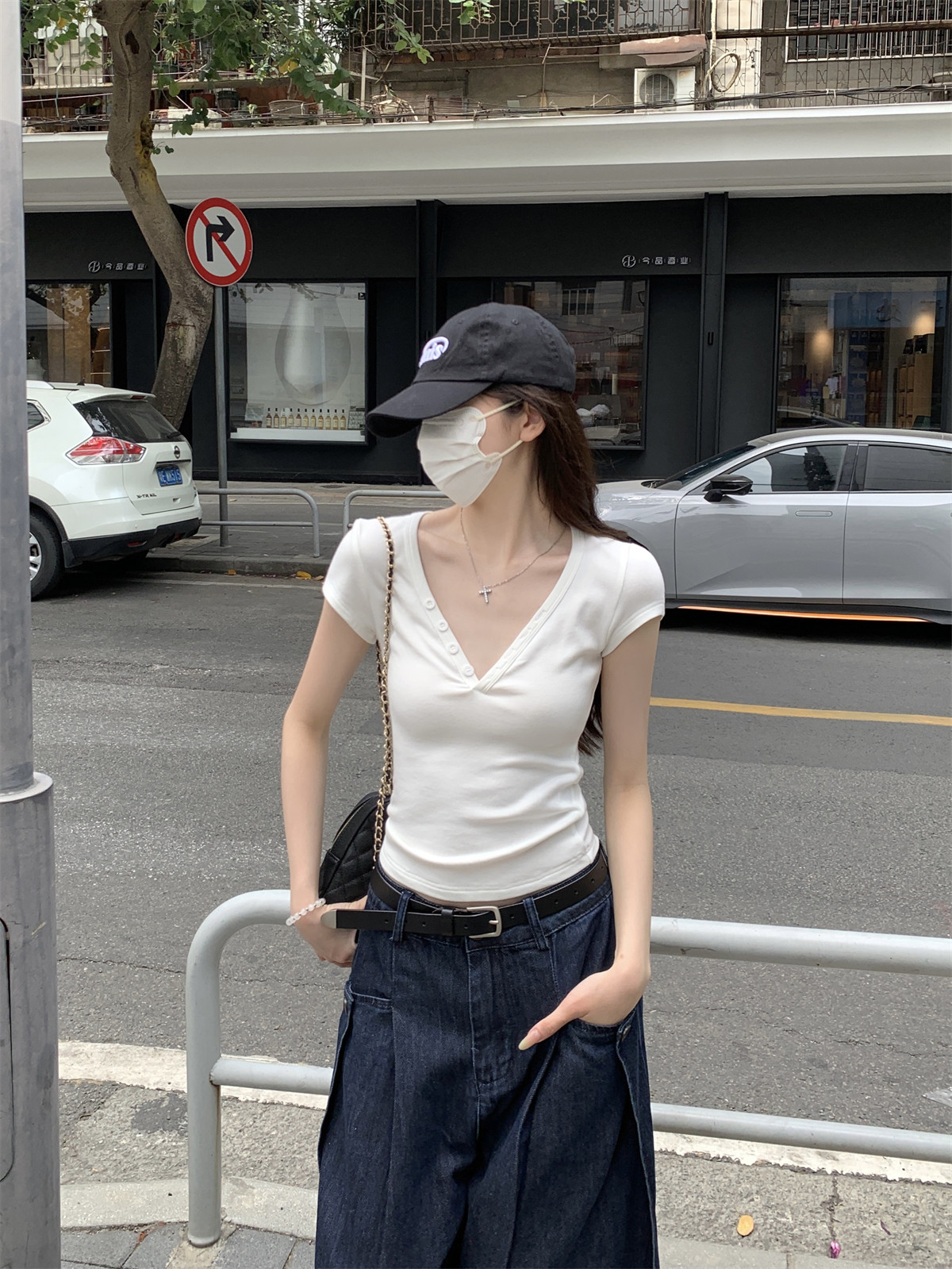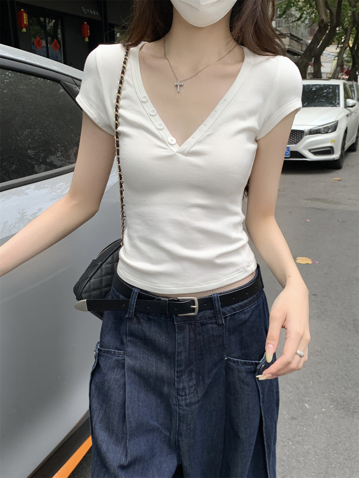 Elegant V-Neck Sexy Pure Desire Short-Sleeve T-Shirt for Women, 2026 Summer New Korean Style Slim-Fit Short Half-Sleeve Top
