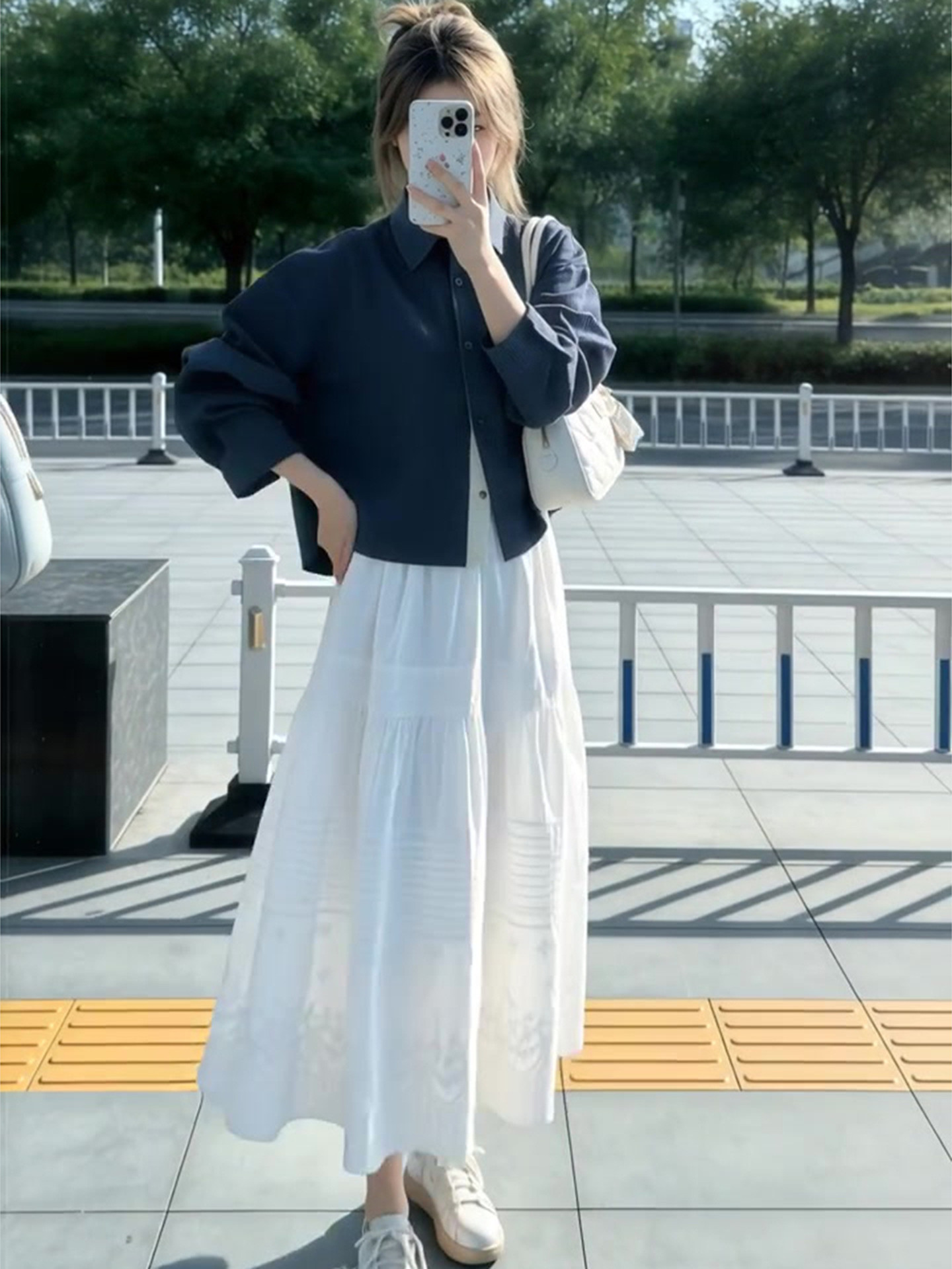 Korean style casual commuting style versatile navy blue top high waist white skirt 2026 spring two-piece set