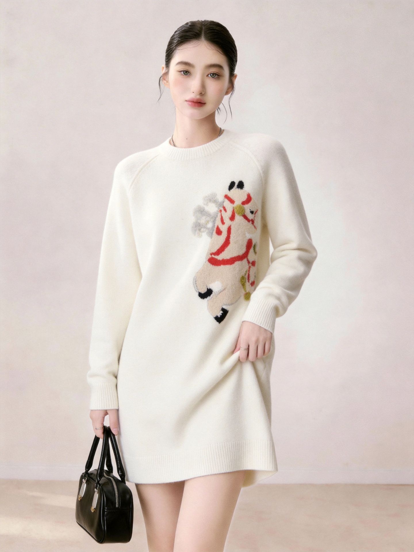 Cute Casual Style Jacquard Knit Dress for Women 2026 Summer White Round Neck Long Sleeve Petite Dress