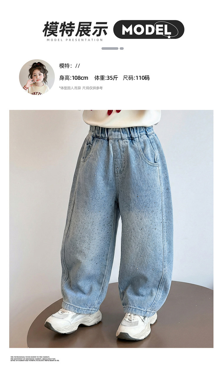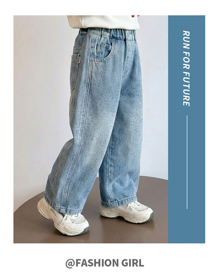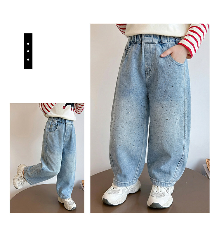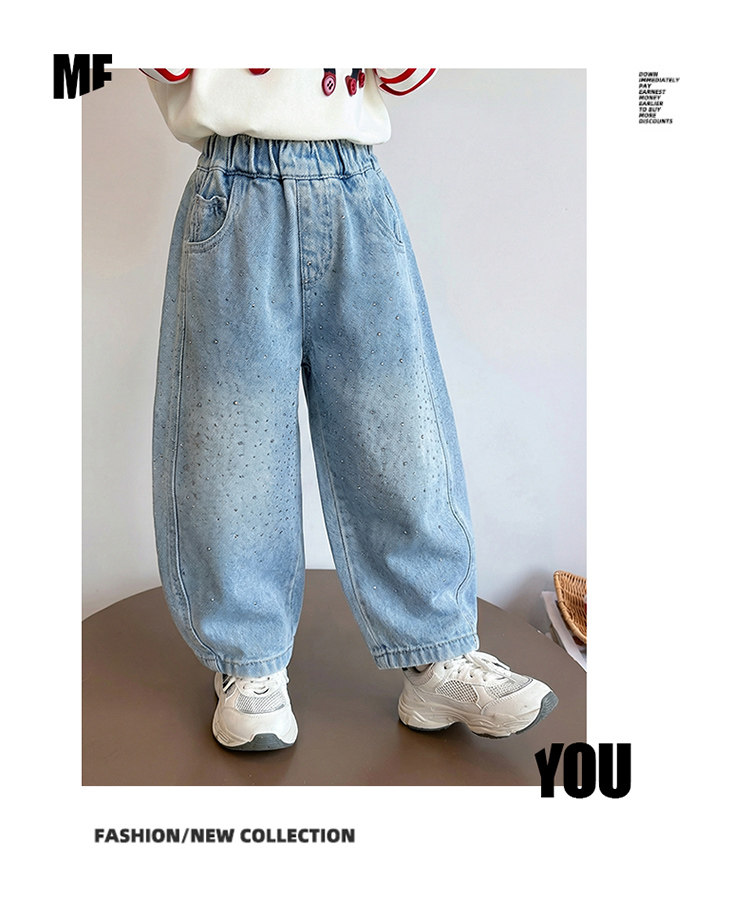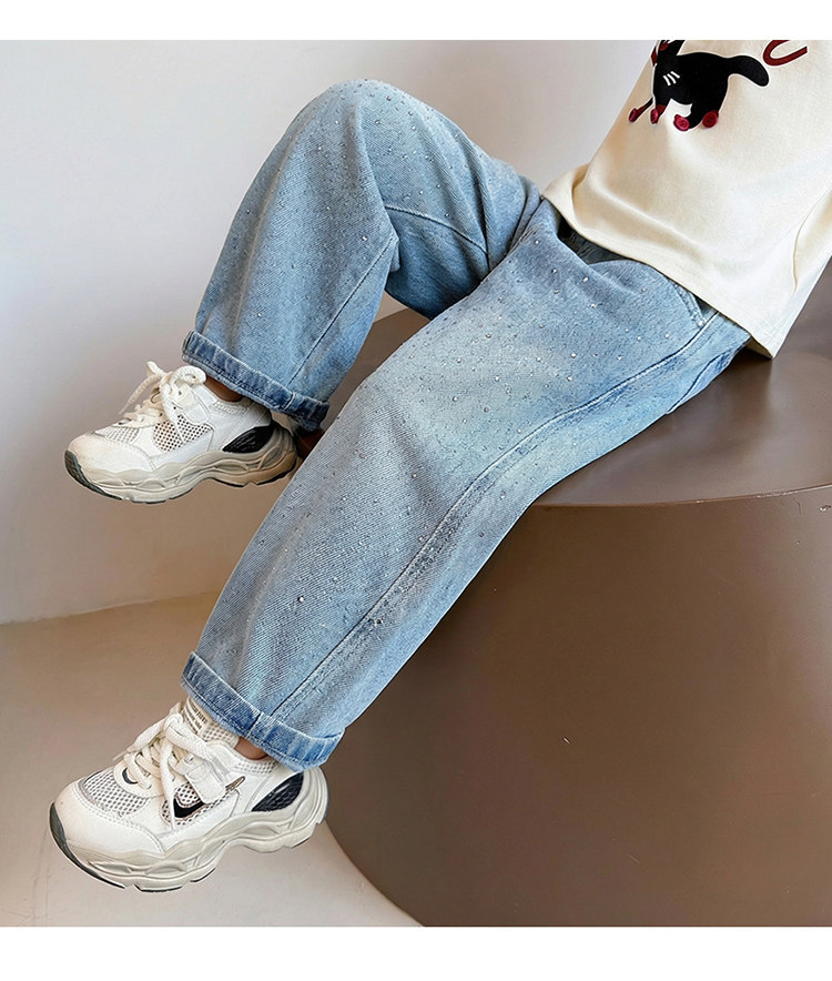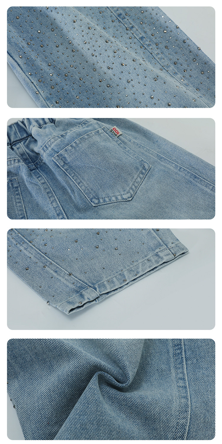 Girls' Spring and Autumn Jeans with Rhinestones and a Sweet Stylish Straight-Leg Design, Elastic Waist Pants for Children
