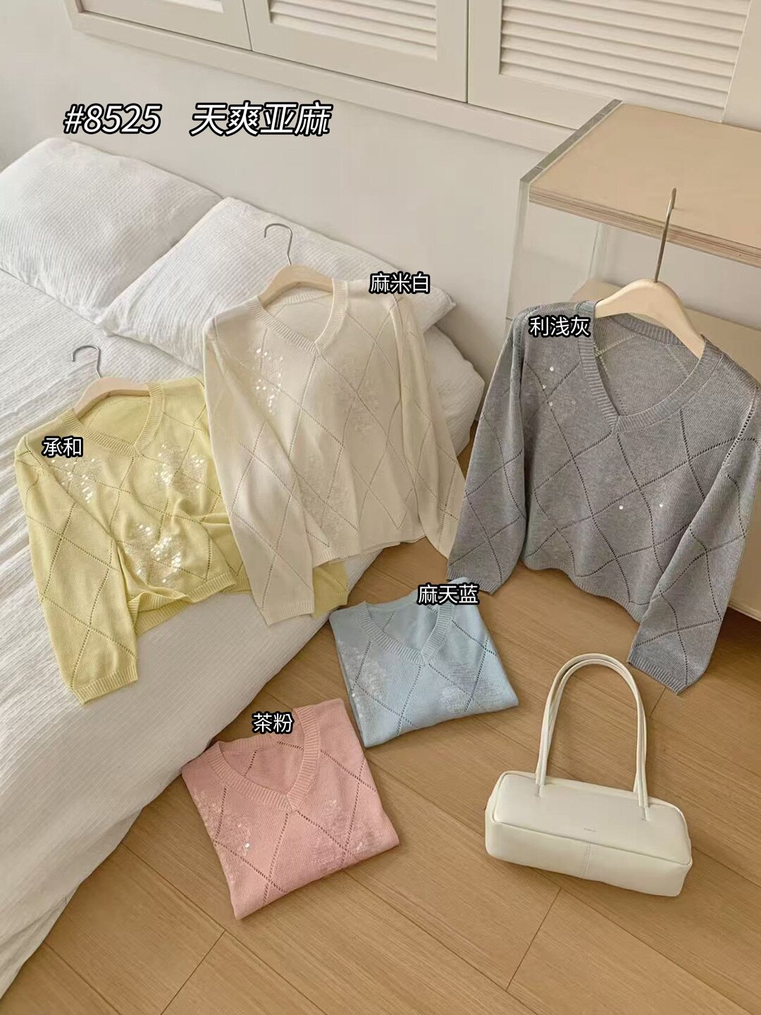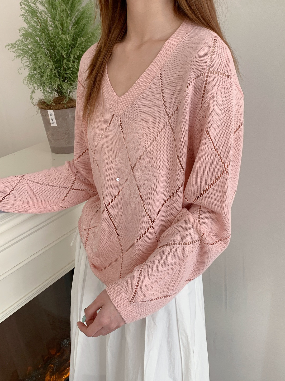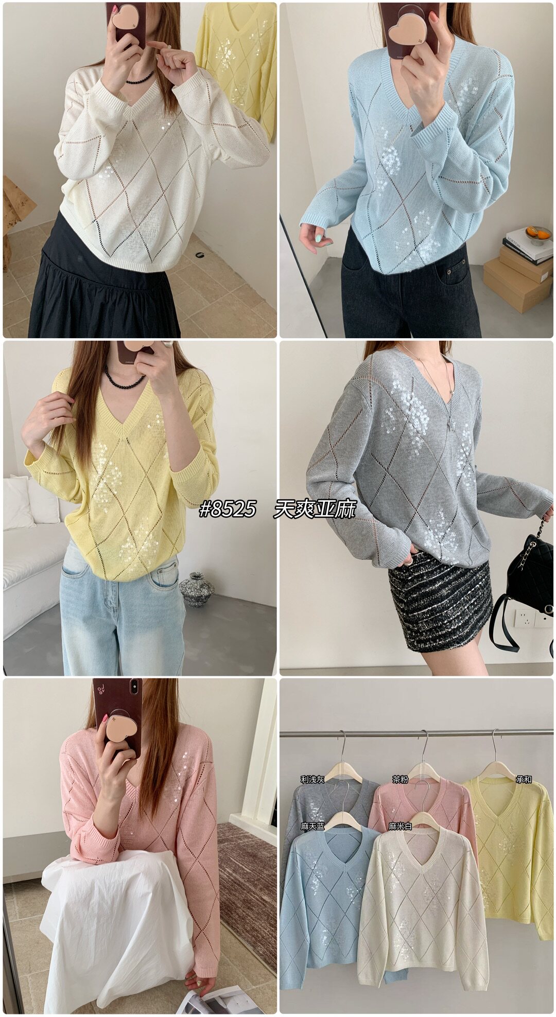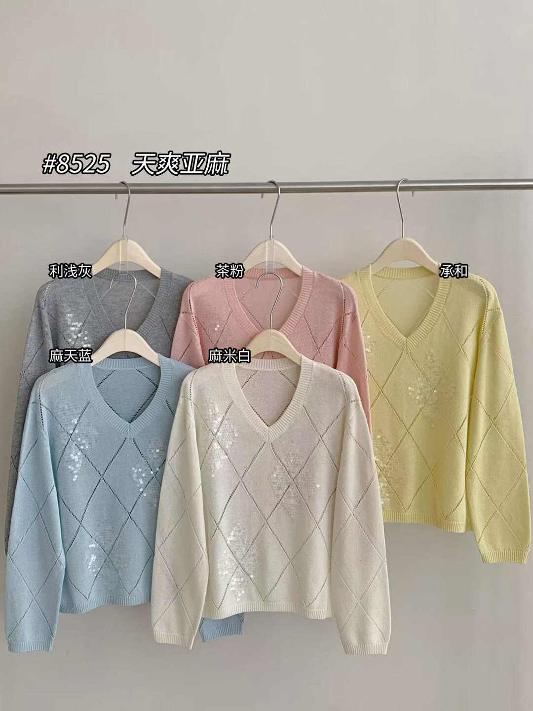 Tianshuang Linen Sequin Diamond Pattern 2026 Early Spring New Loose Slimming V-Neck Long Sleeve Knitted Sweater Women's Top
