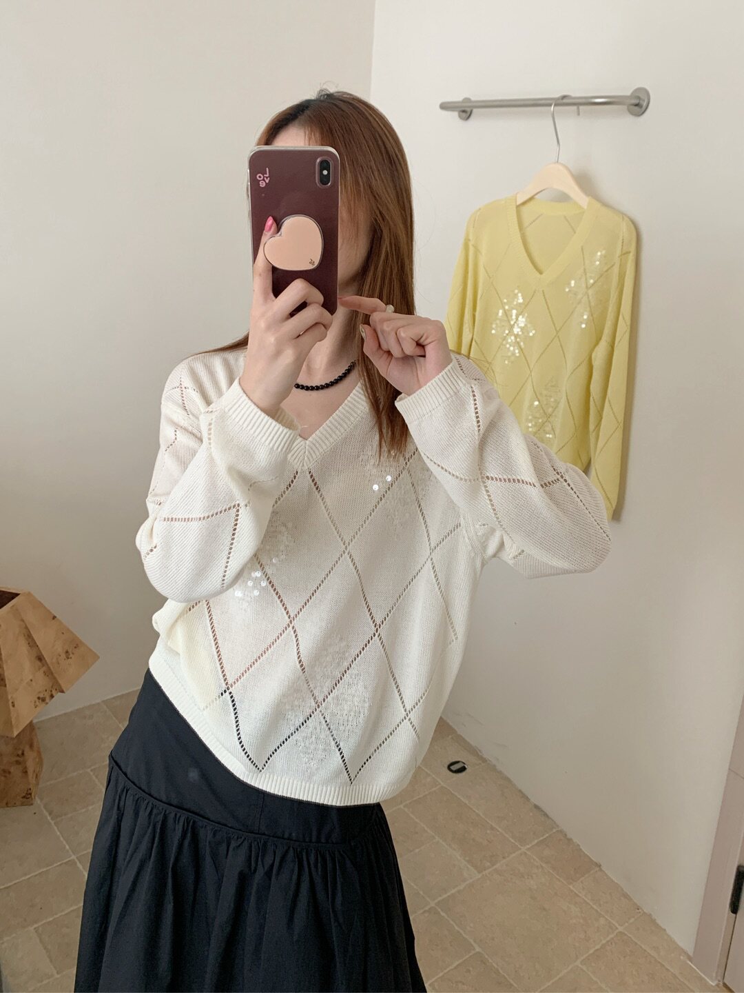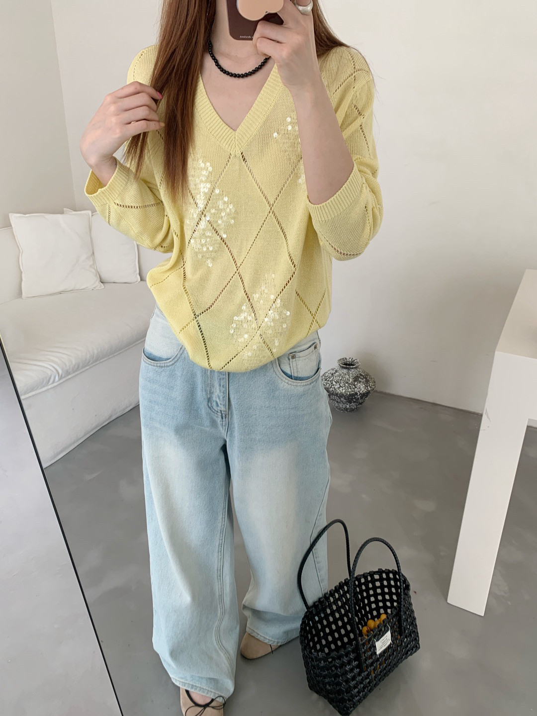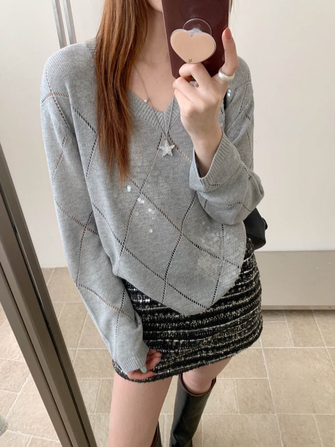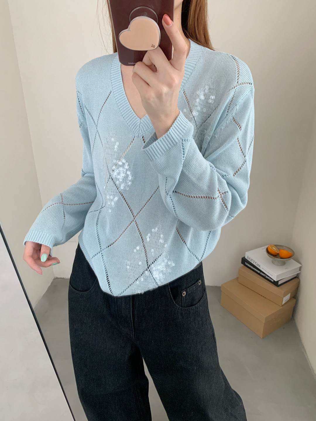 Tianshuang Linen Sequin Diamond Pattern 2026 Early Spring New Loose Slimming V-Neck Long Sleeve Knitted Sweater Women's Top