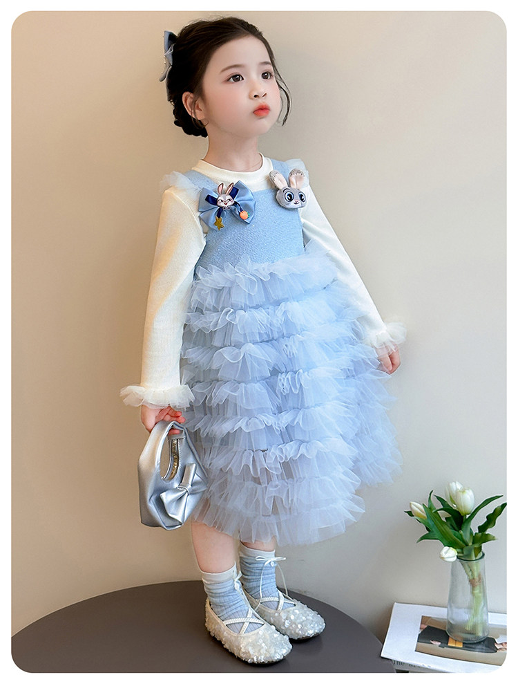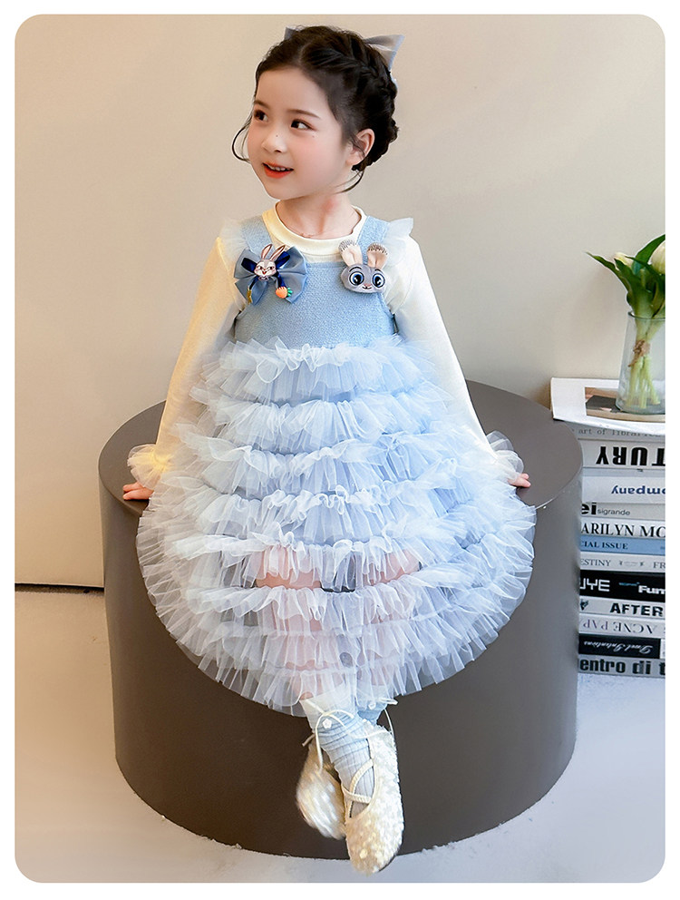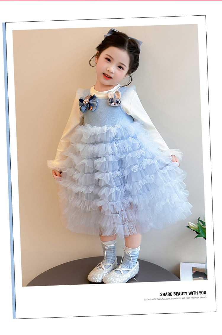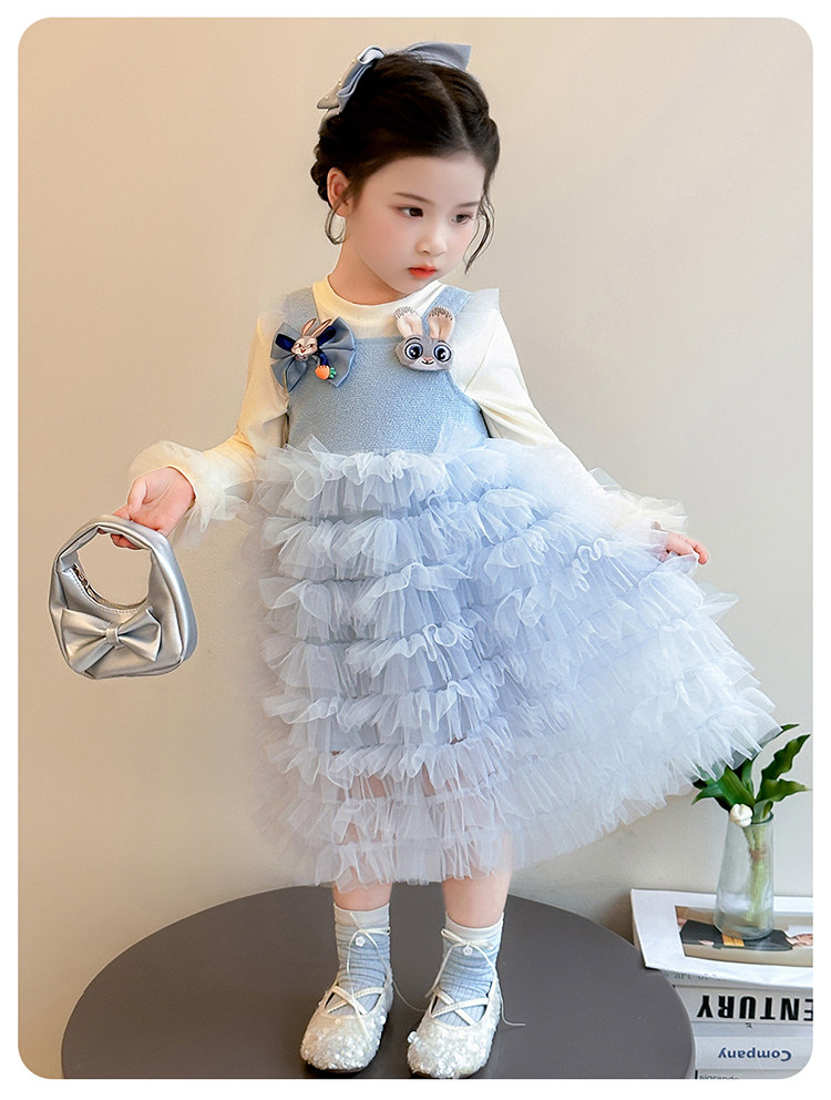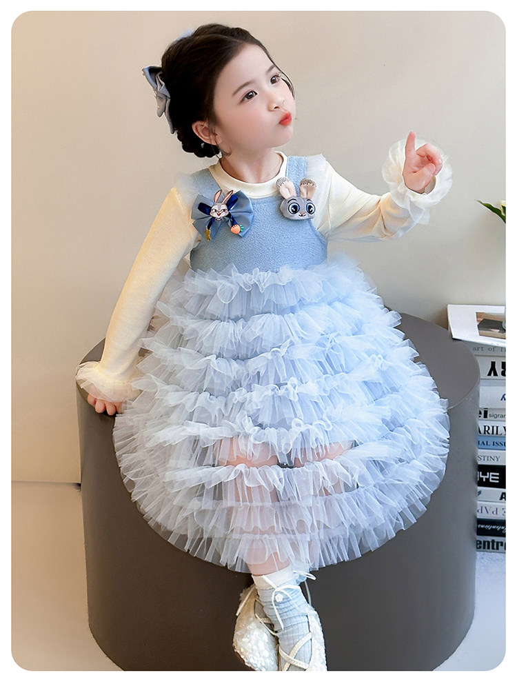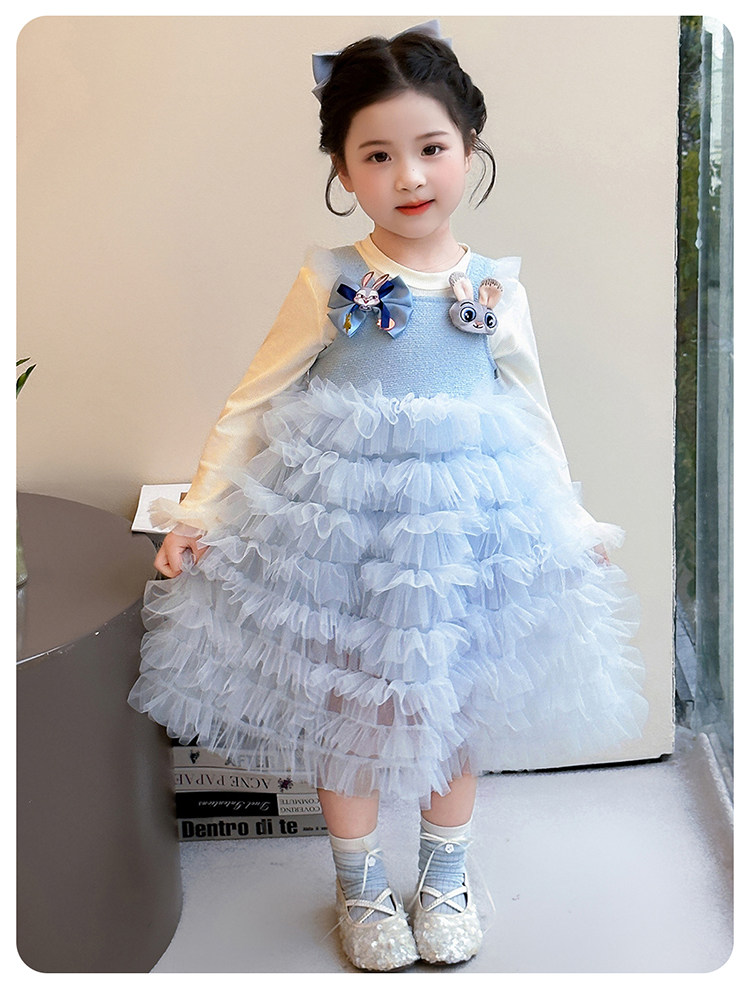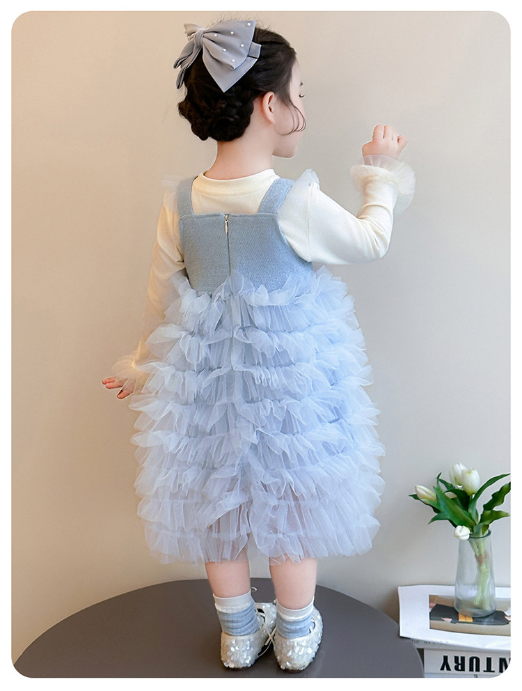 Girls' Long-Sleeved Princess-Style Dress, Kidsren's Blue Mesh Spring & Fall Cake Dress, Stylish Tutu Dress, Baby Dress