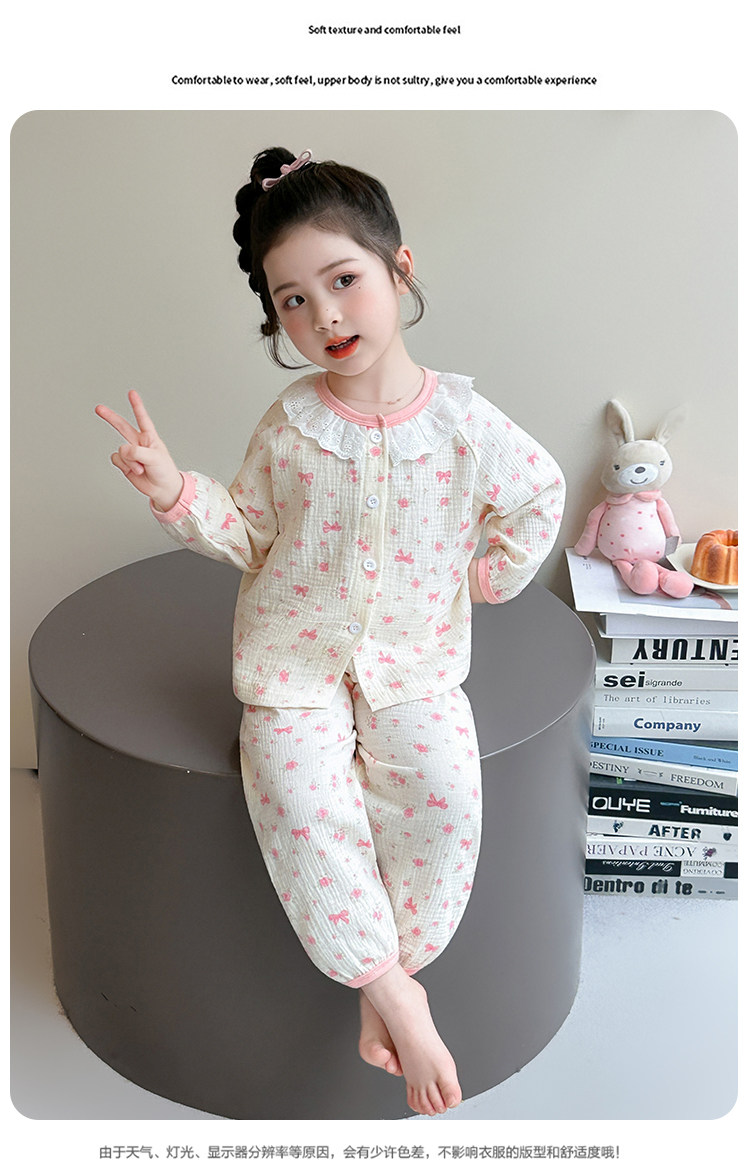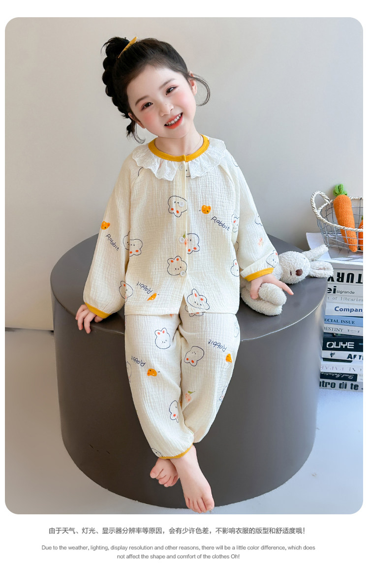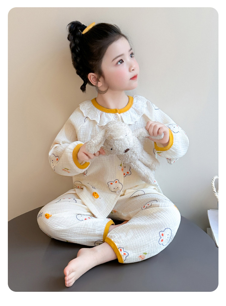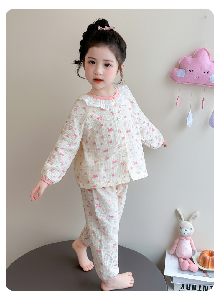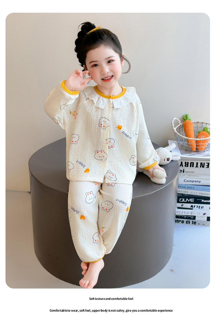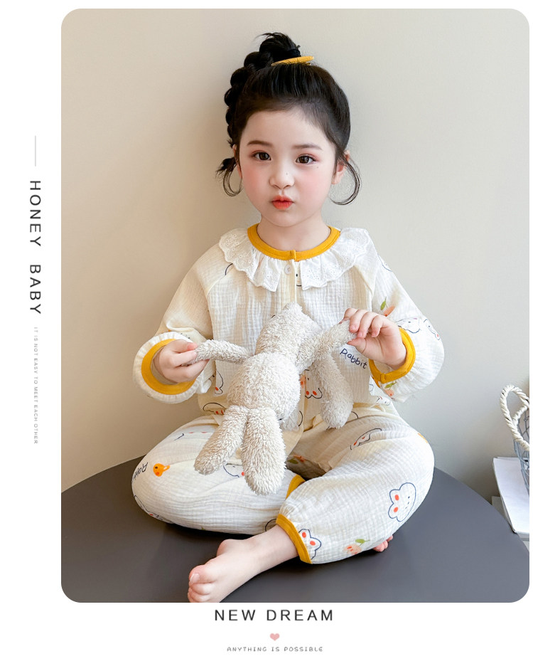Girls' Gauze Pajamas, Spring & Fall Long-Sleeved Air-Conditioned Clothes, Kidsren's Pure Cotton Home Clothes, Cute Cardigan Suits for Girls and Babies