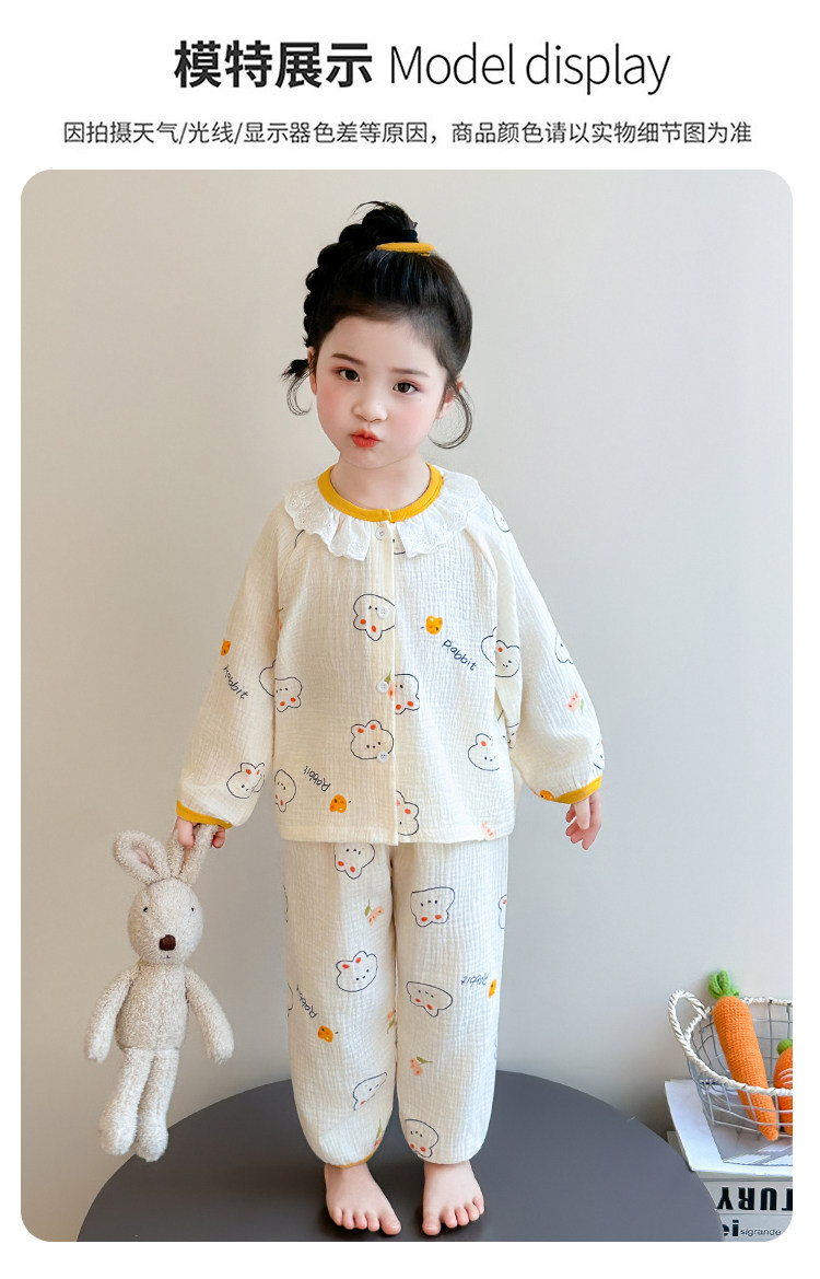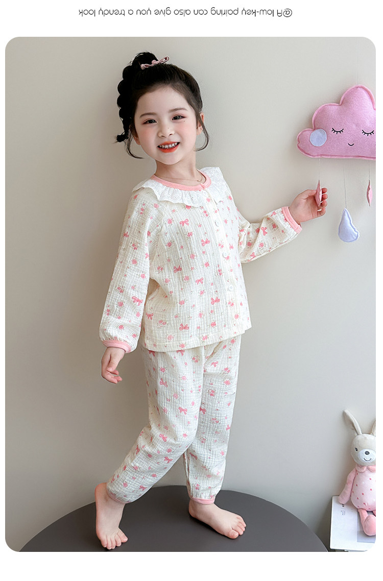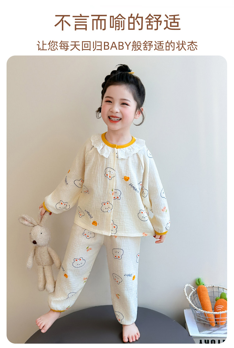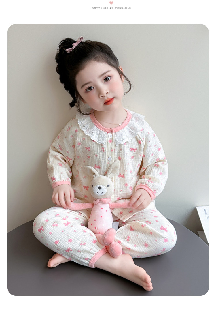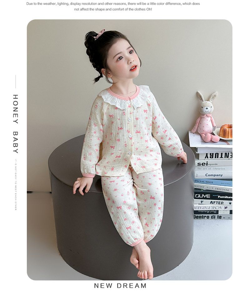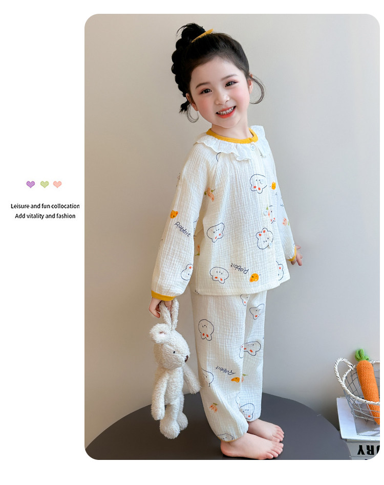 Girls' Gauze Pajamas, Spring & Fall Long-Sleeved Air-Conditioned Clothes, Kidsren's Pure Cotton Home Clothes, Cute Cardigan Suits for Girls and Babies