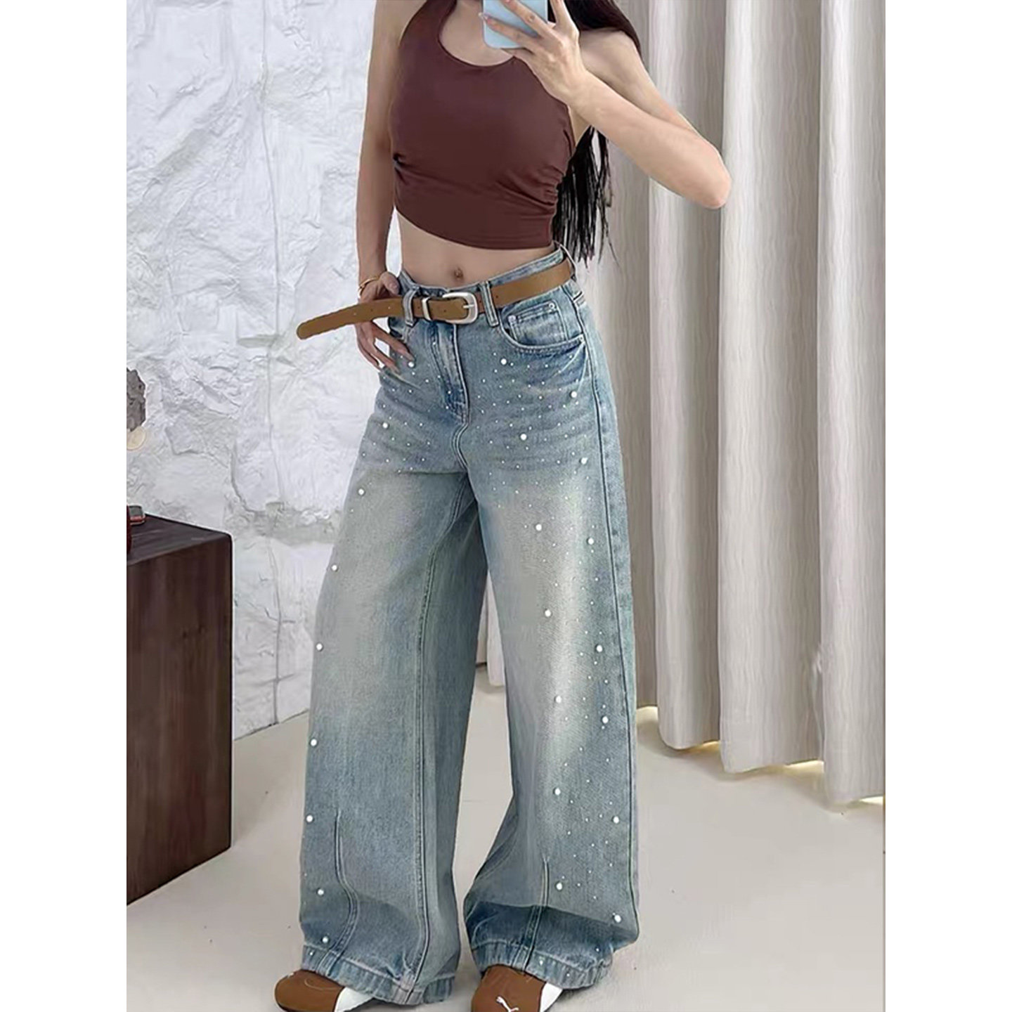 2026 Spring/Summer Super Stylish Slimming High-Waisted Commuter Loose Straight-Leg Korean-Style Relaxed Blue Beaded Jeans