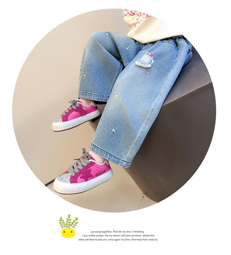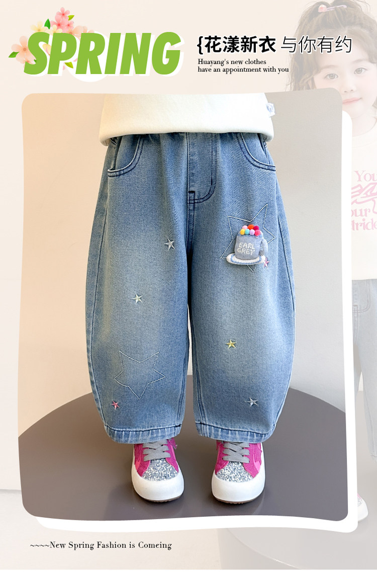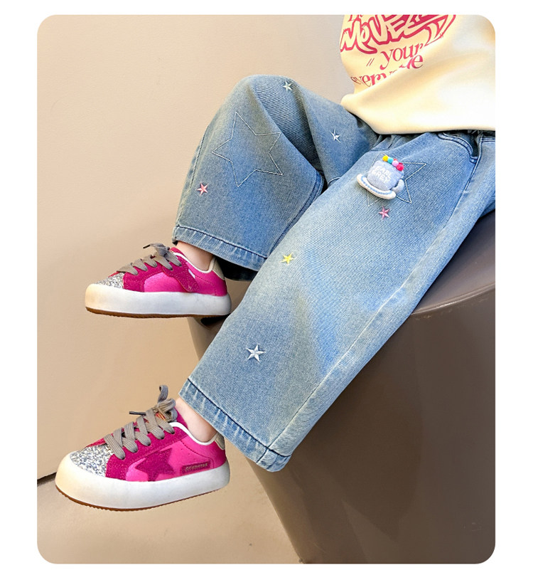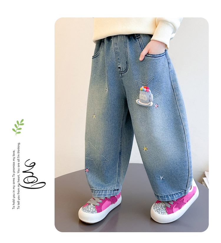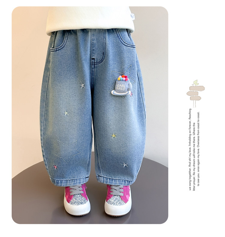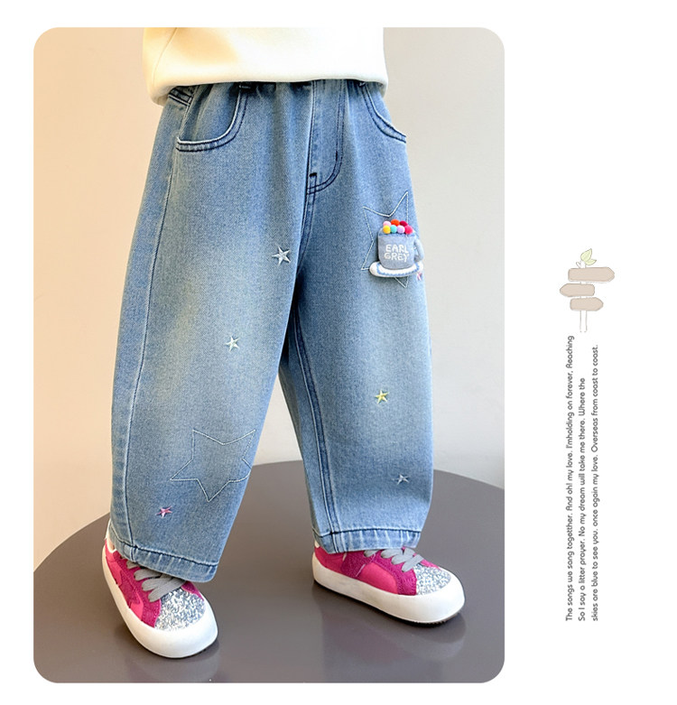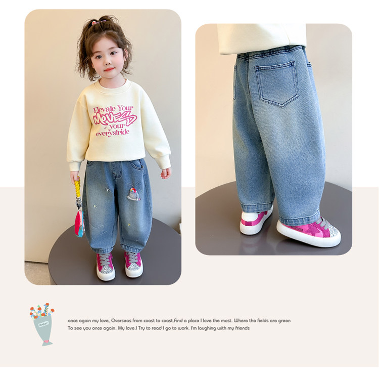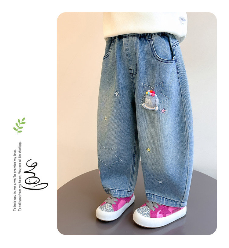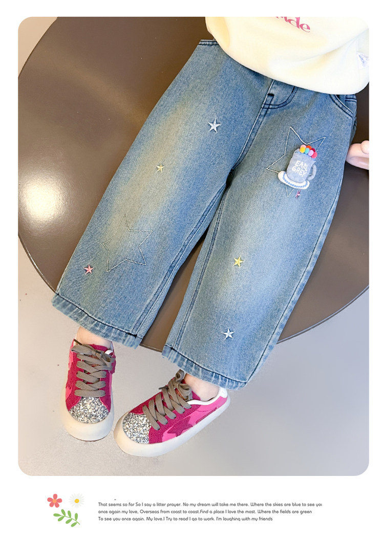 Girls' Embroidered Scimitar Jeans, New Spring and Autumn Style, Stylish Loose Casual Long Pants for Children, Straight-Leg Pants for Toddlers