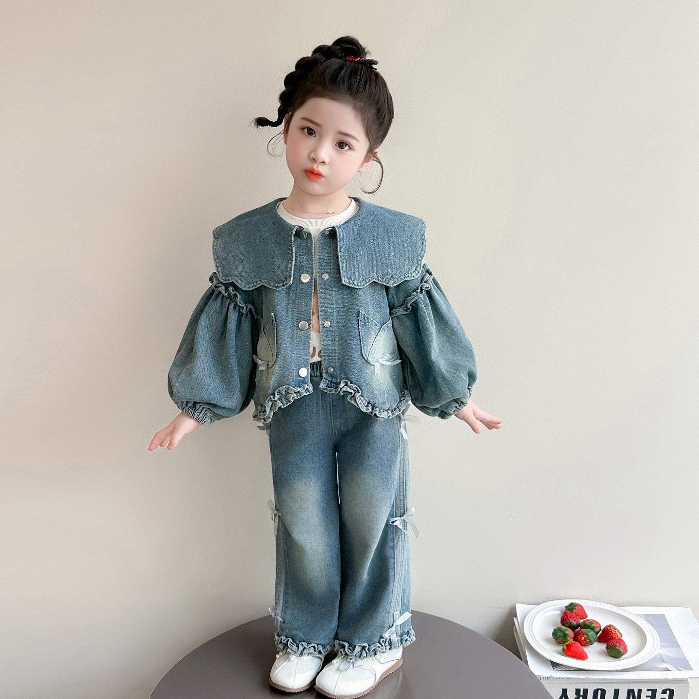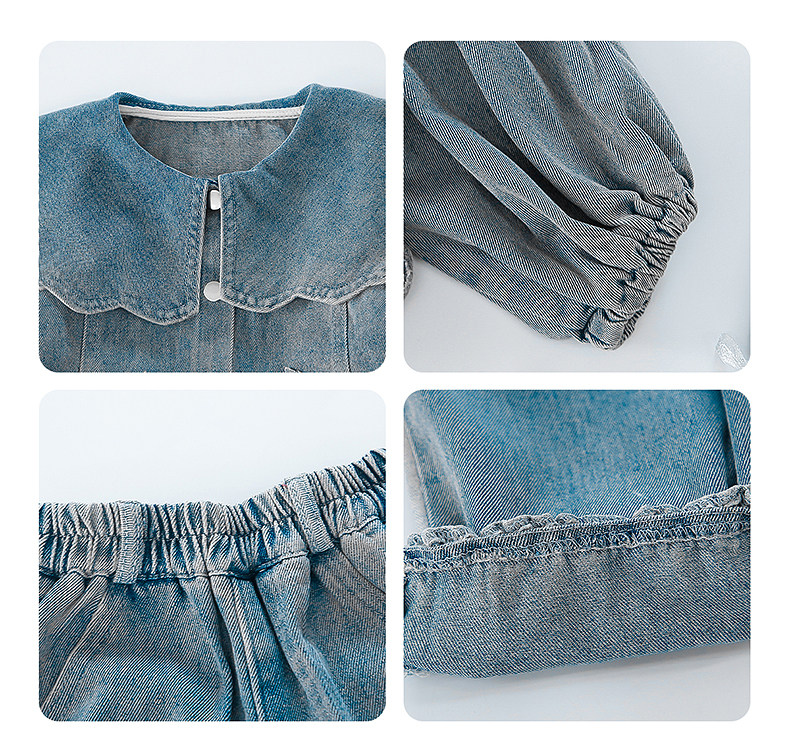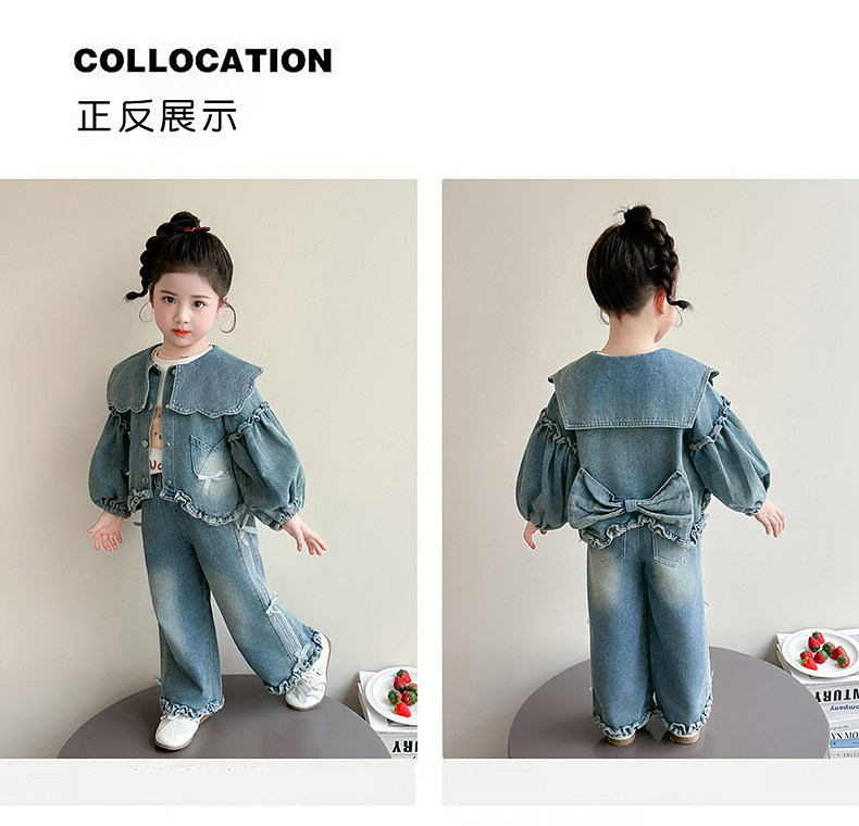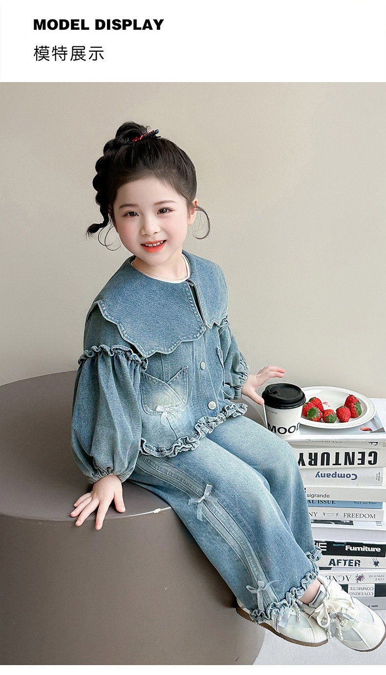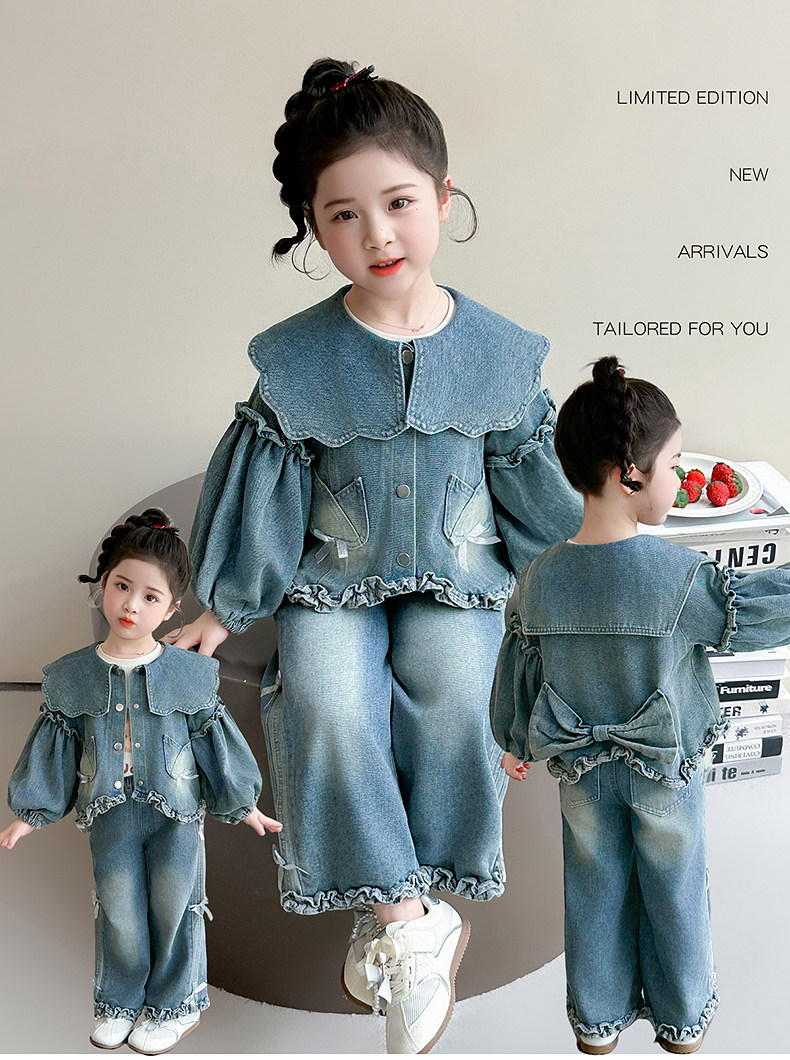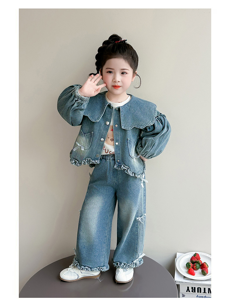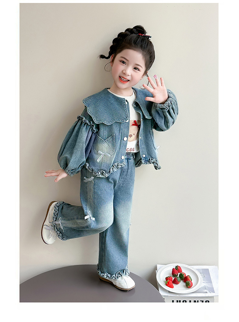 Girls spring denim suit 2026 new baby girl spring and autumn large lapel lantern sleeve denim suit for children