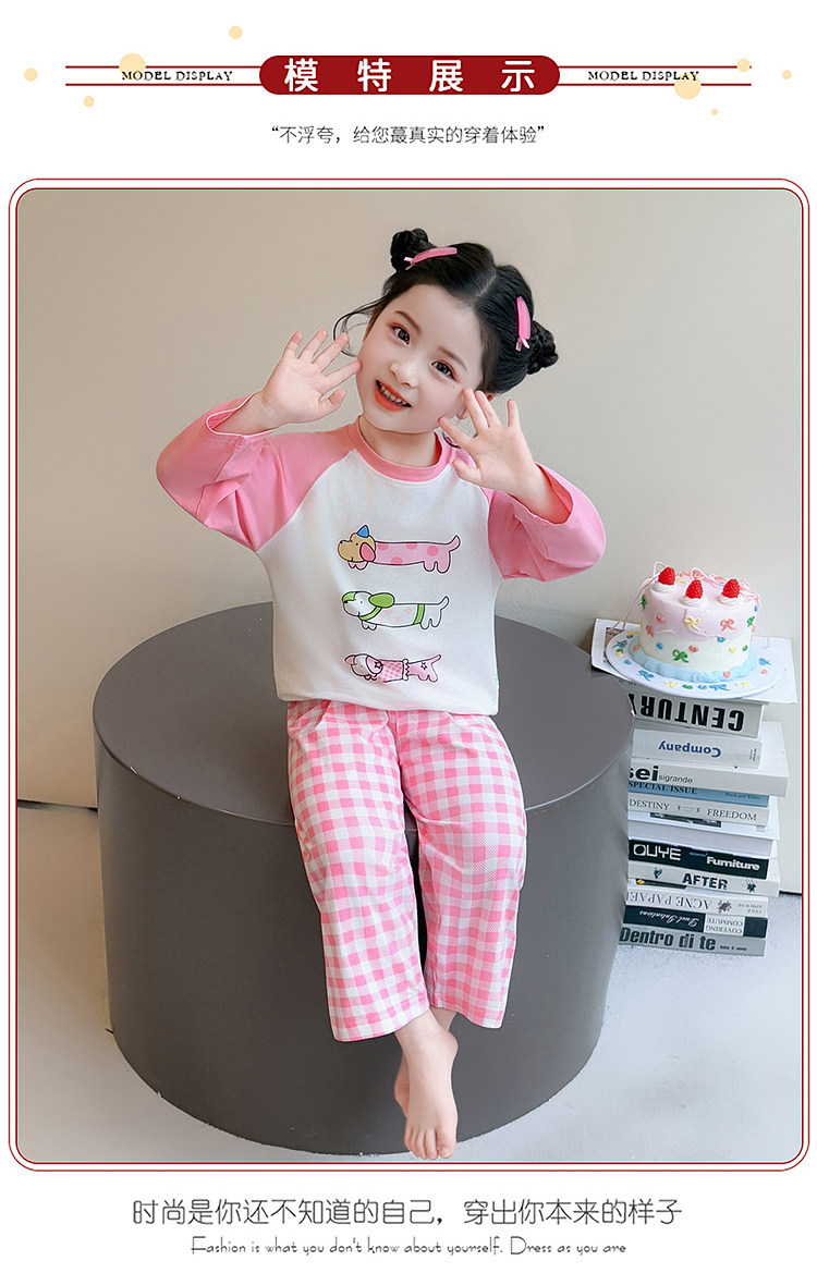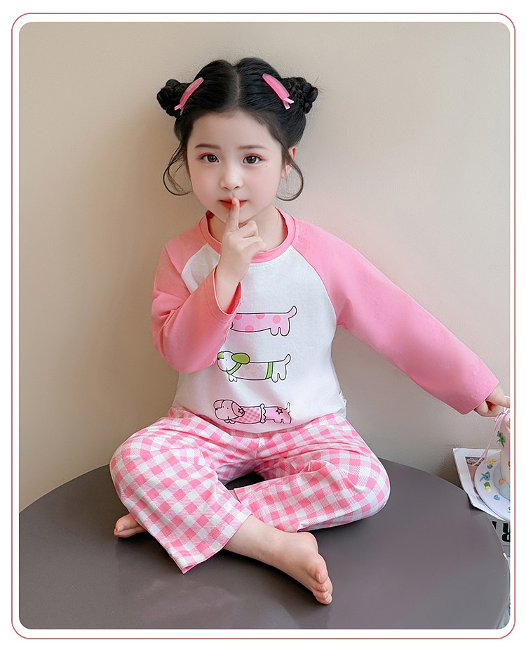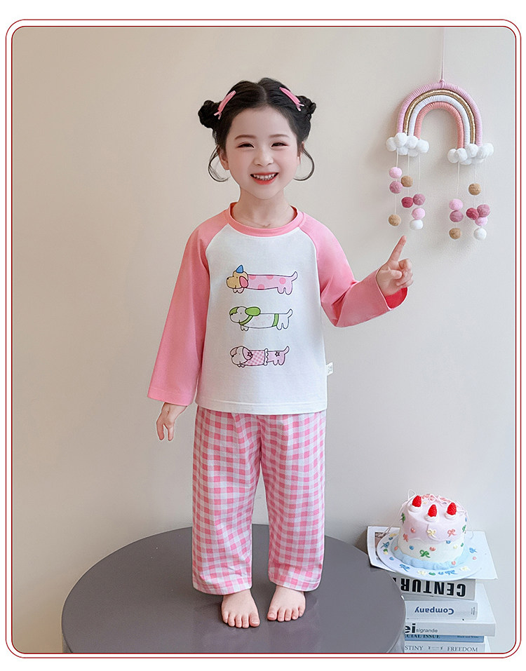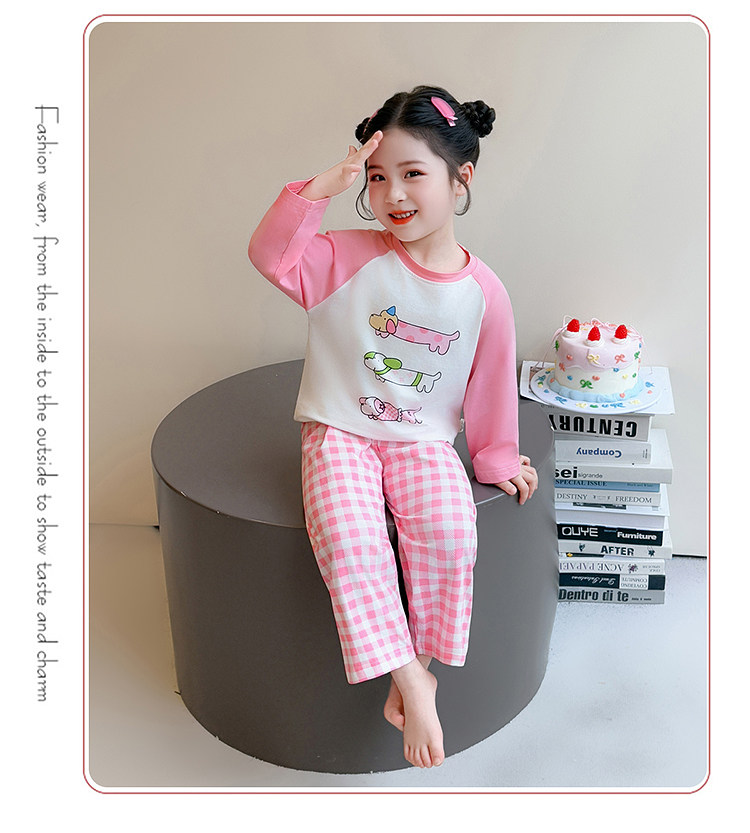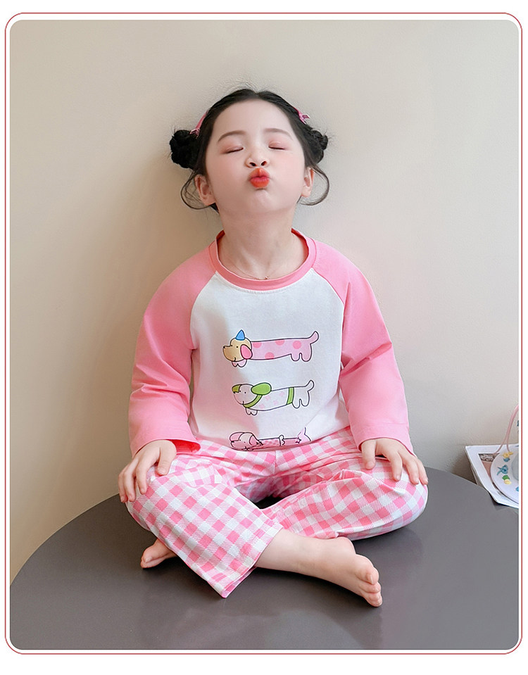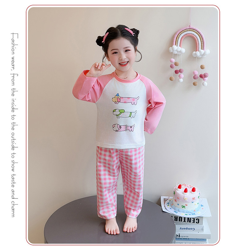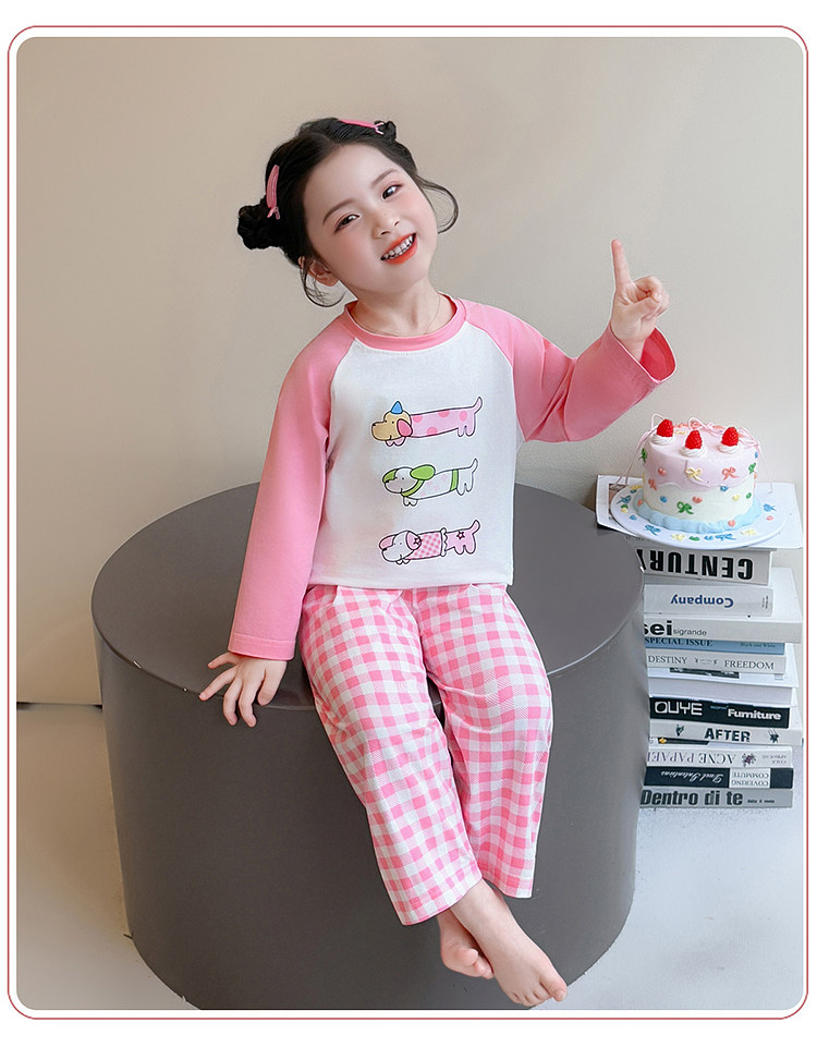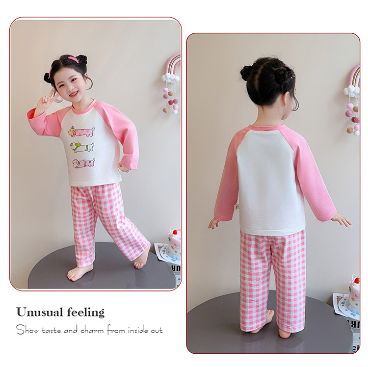 Girls' Pure Cotton Thin Pajamas, New Spring and Autumn Style, Cute Cartoon Long-Sleeve Plaid Loungewear, Air-Conditioning Suit Set