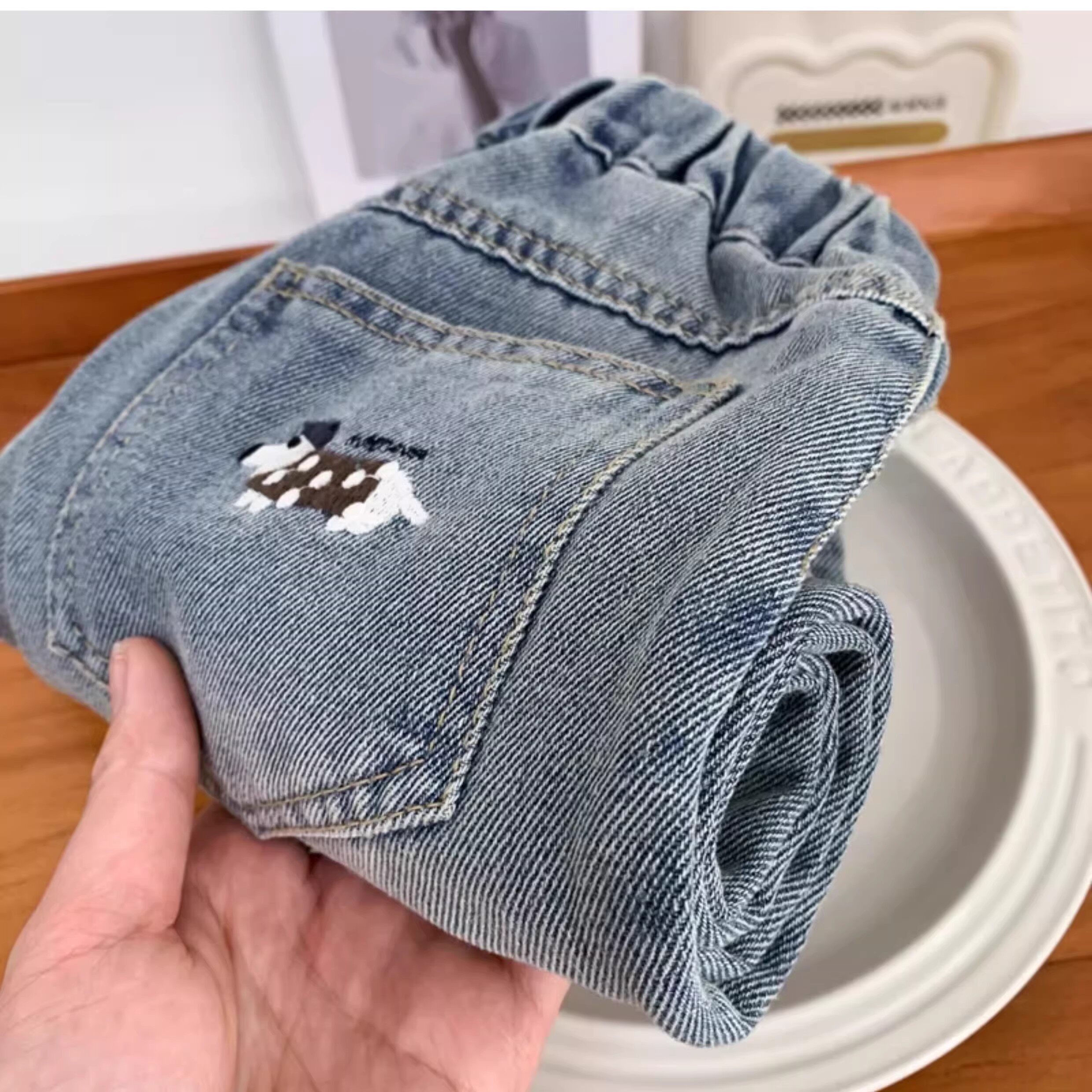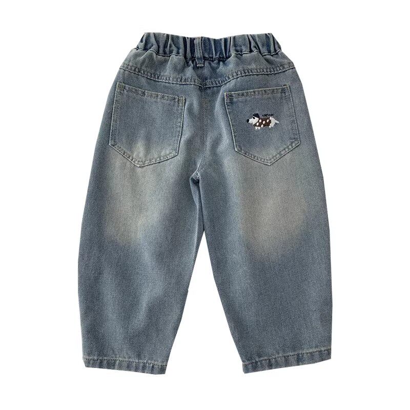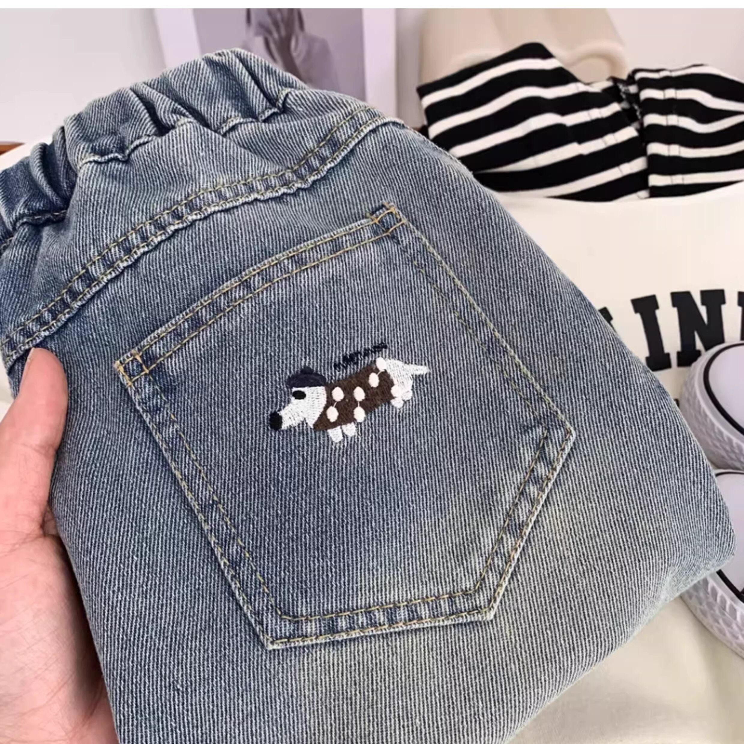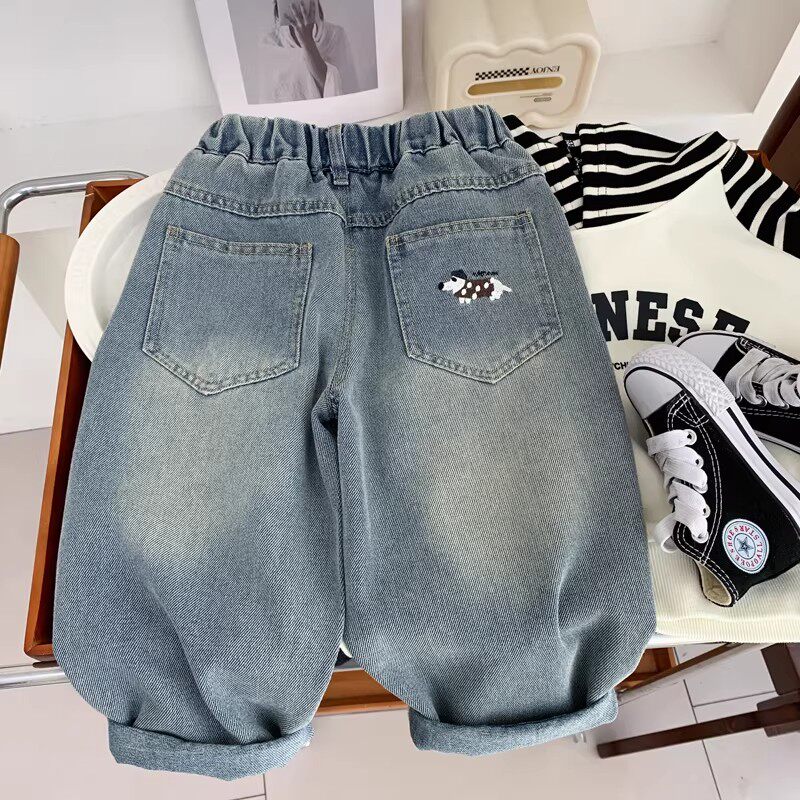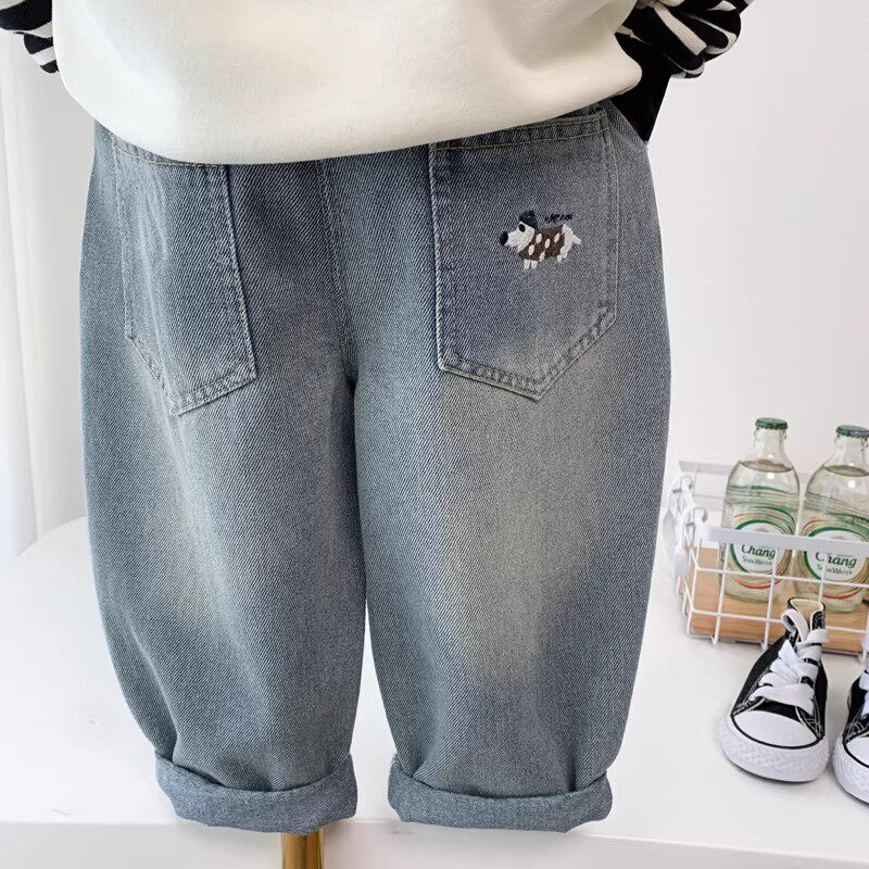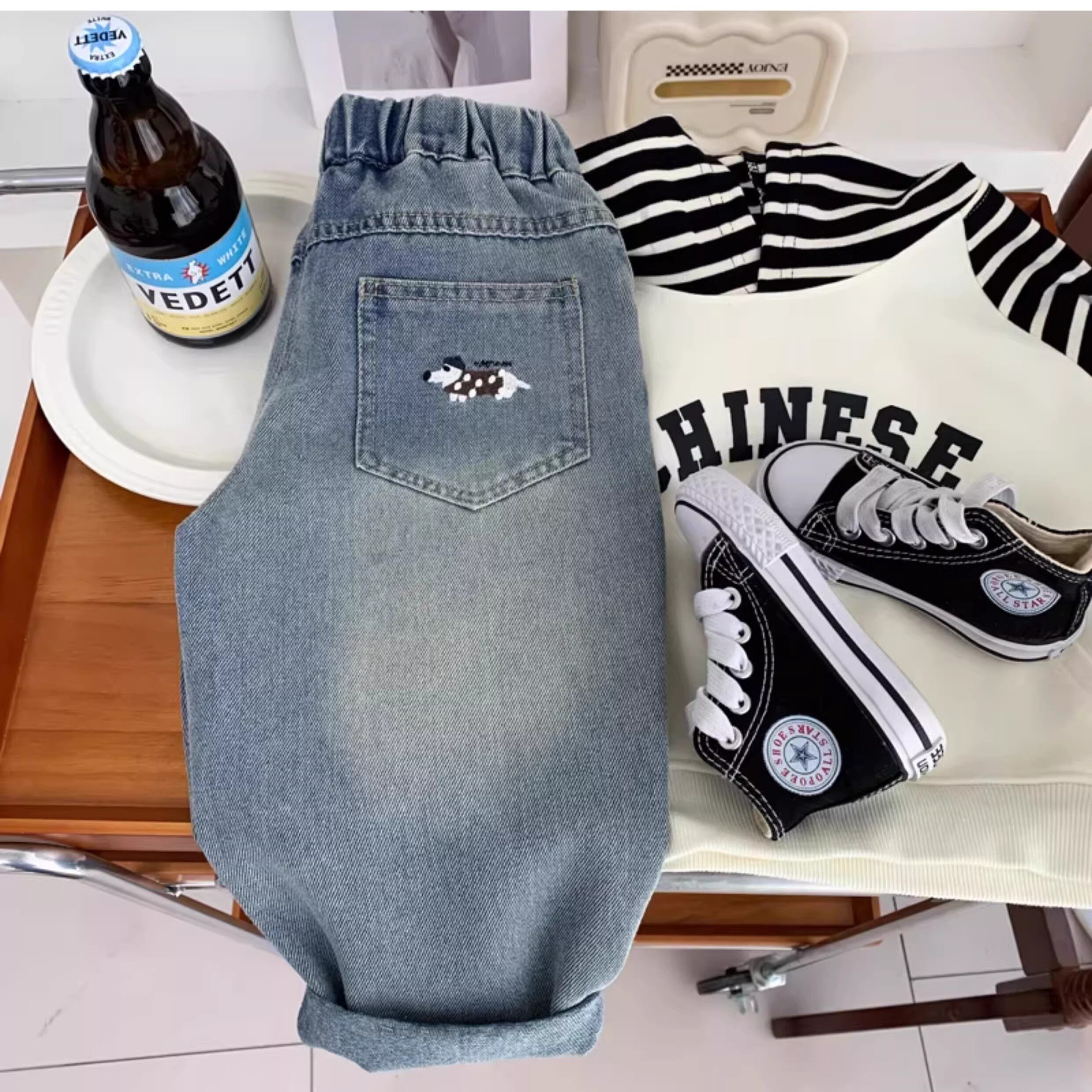 French-Style Boys' Spring and Autumn Jeans, Stylish Cartoon Soft Pants for Young Children, Handsome Long Pants for Little Boys, Casual