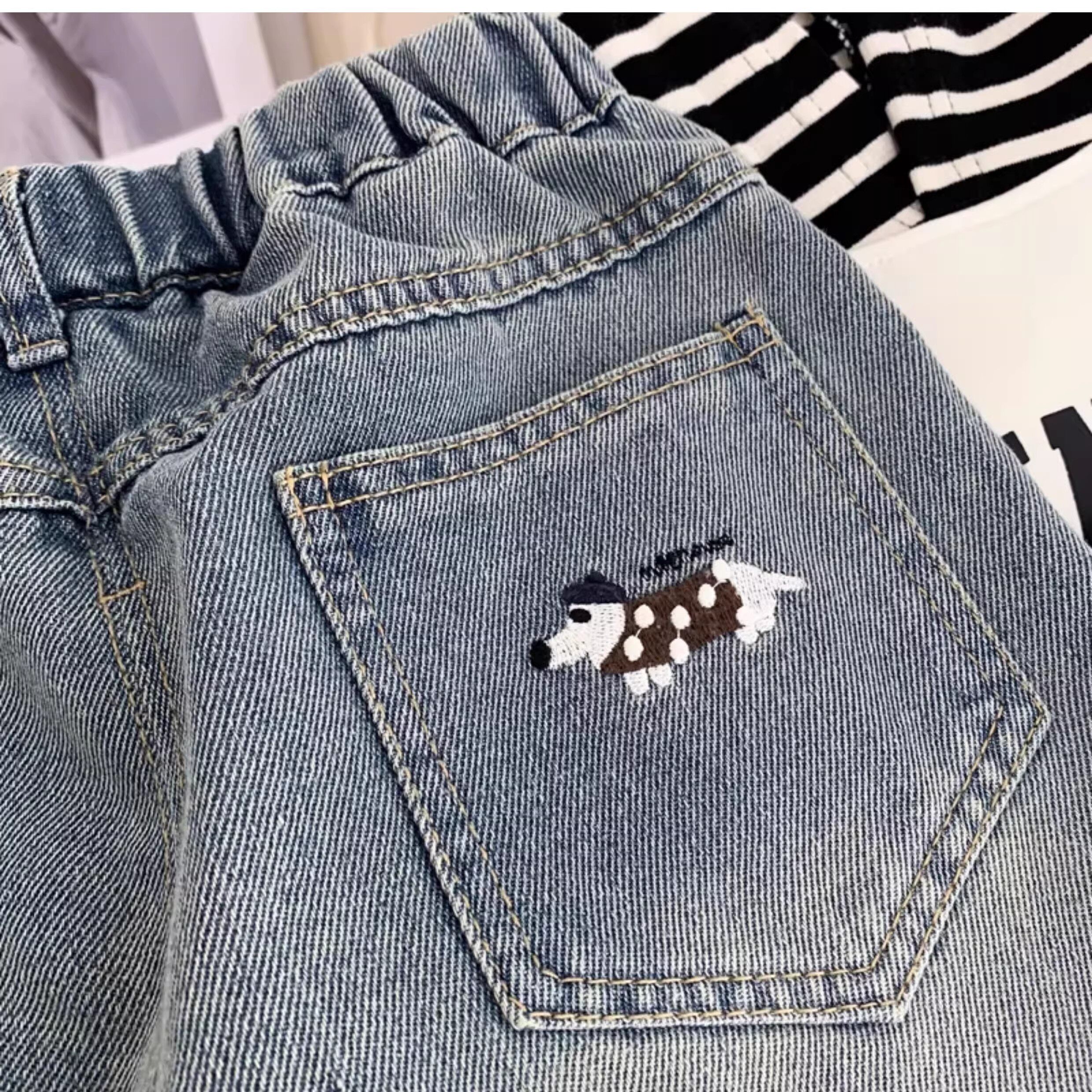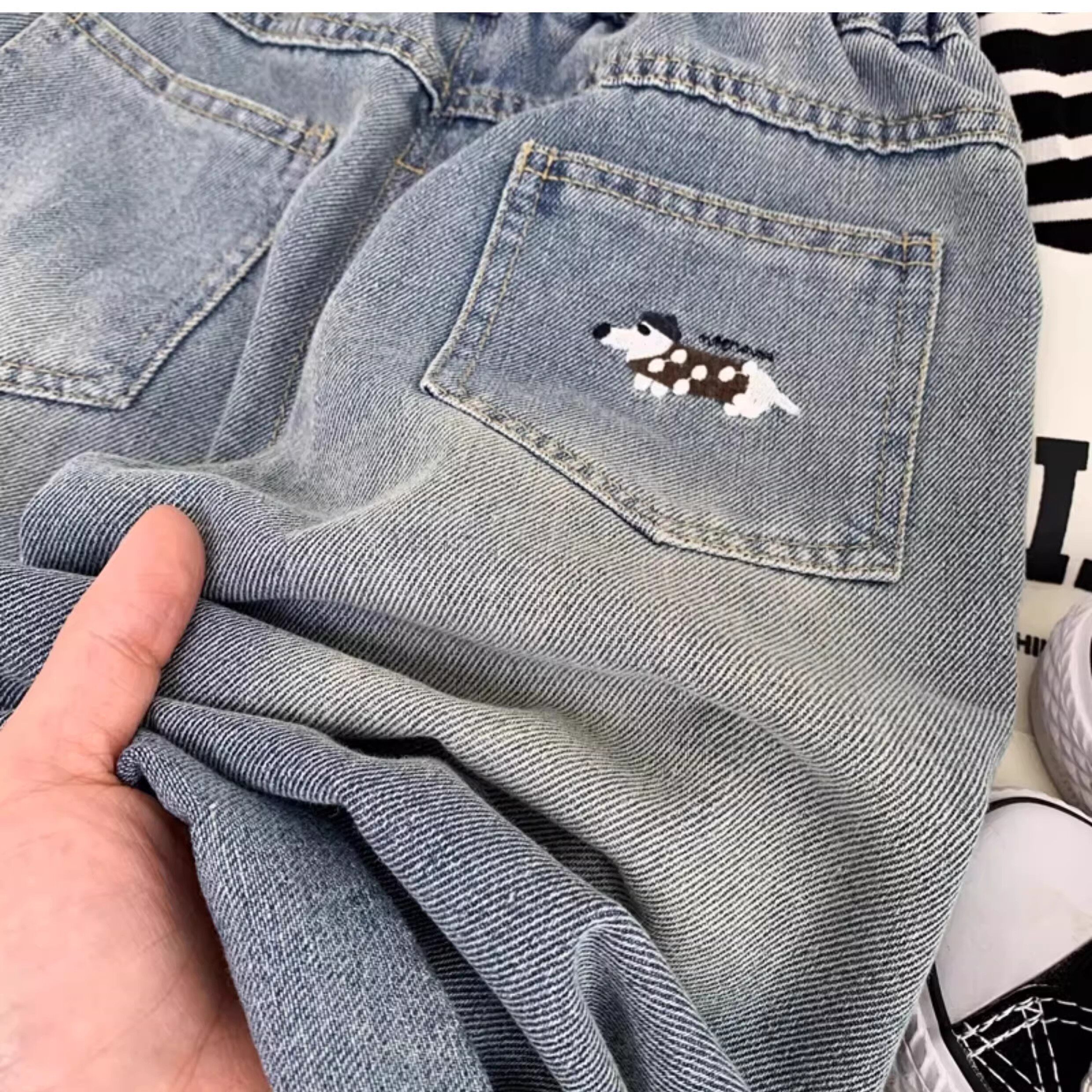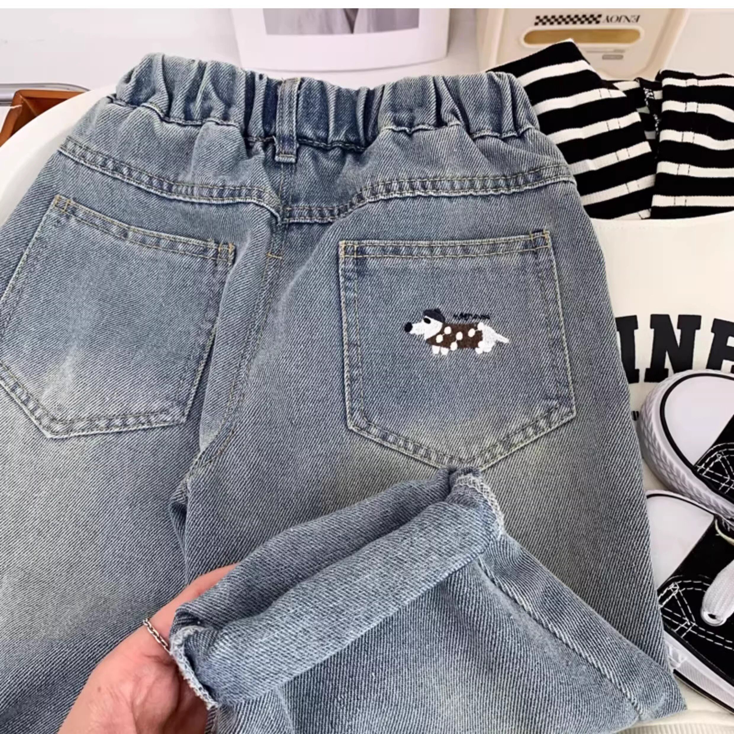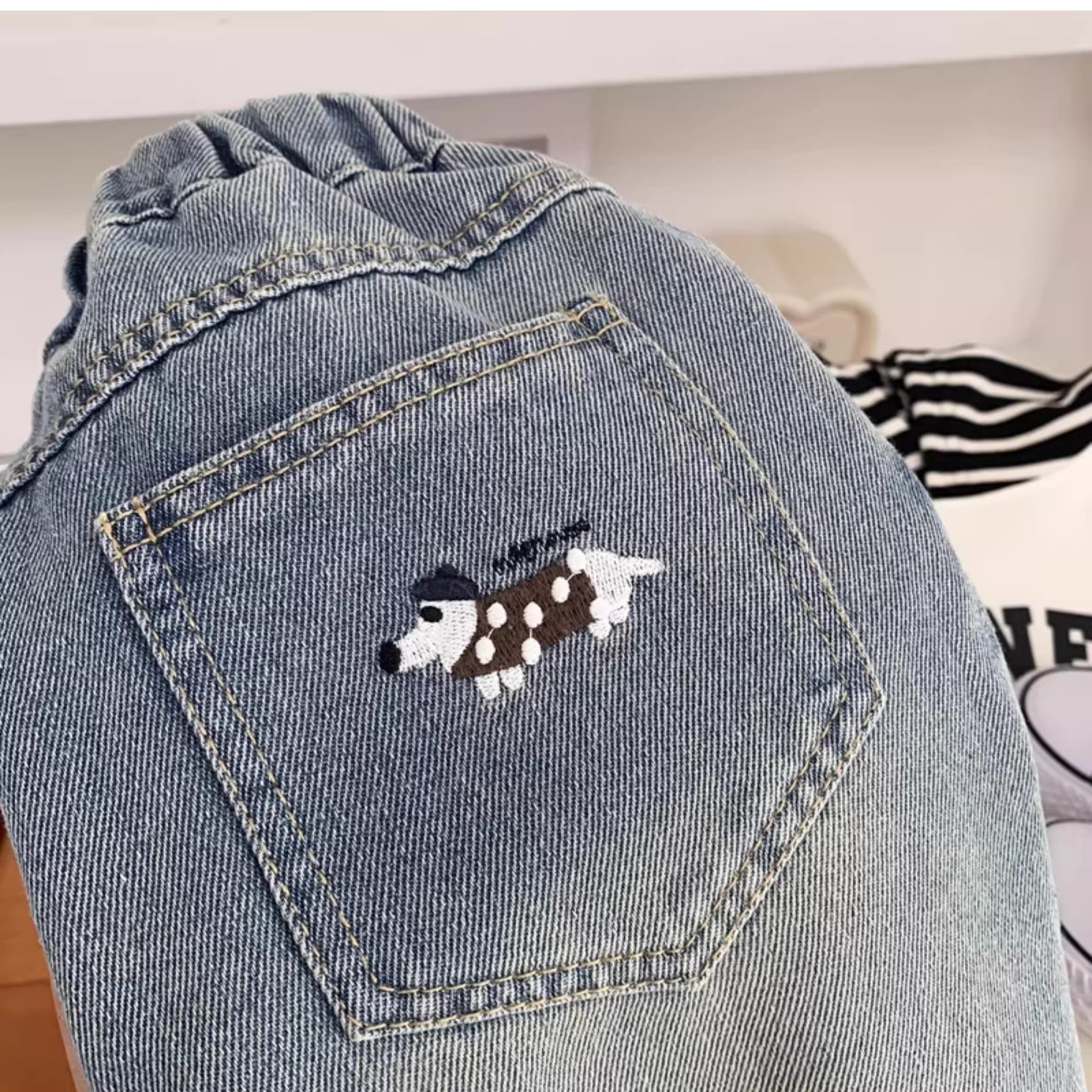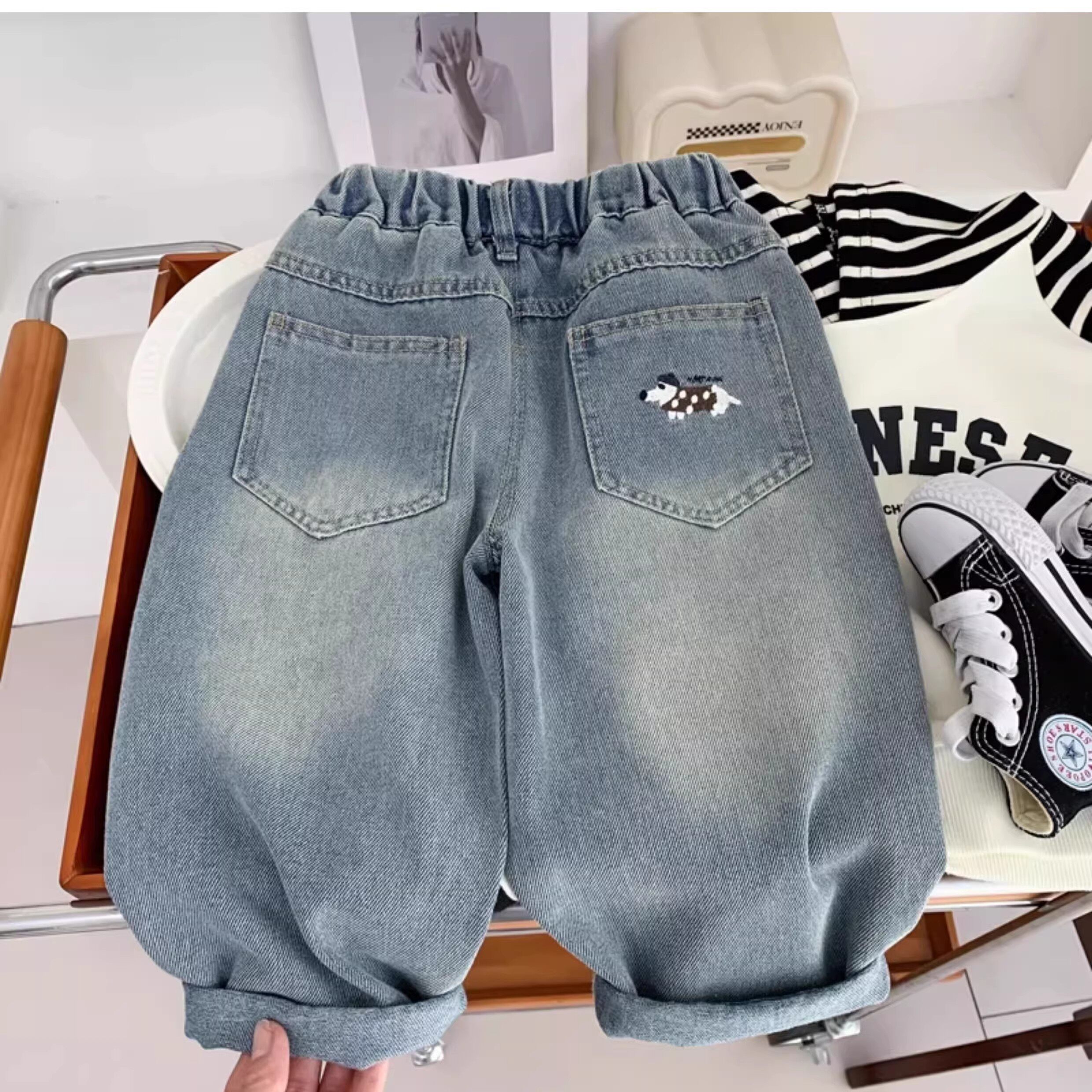 French-Style Boys' Spring and Autumn Jeans, Stylish Cartoon Soft Pants for Young Children, Handsome Long Pants for Little Boys, Casual