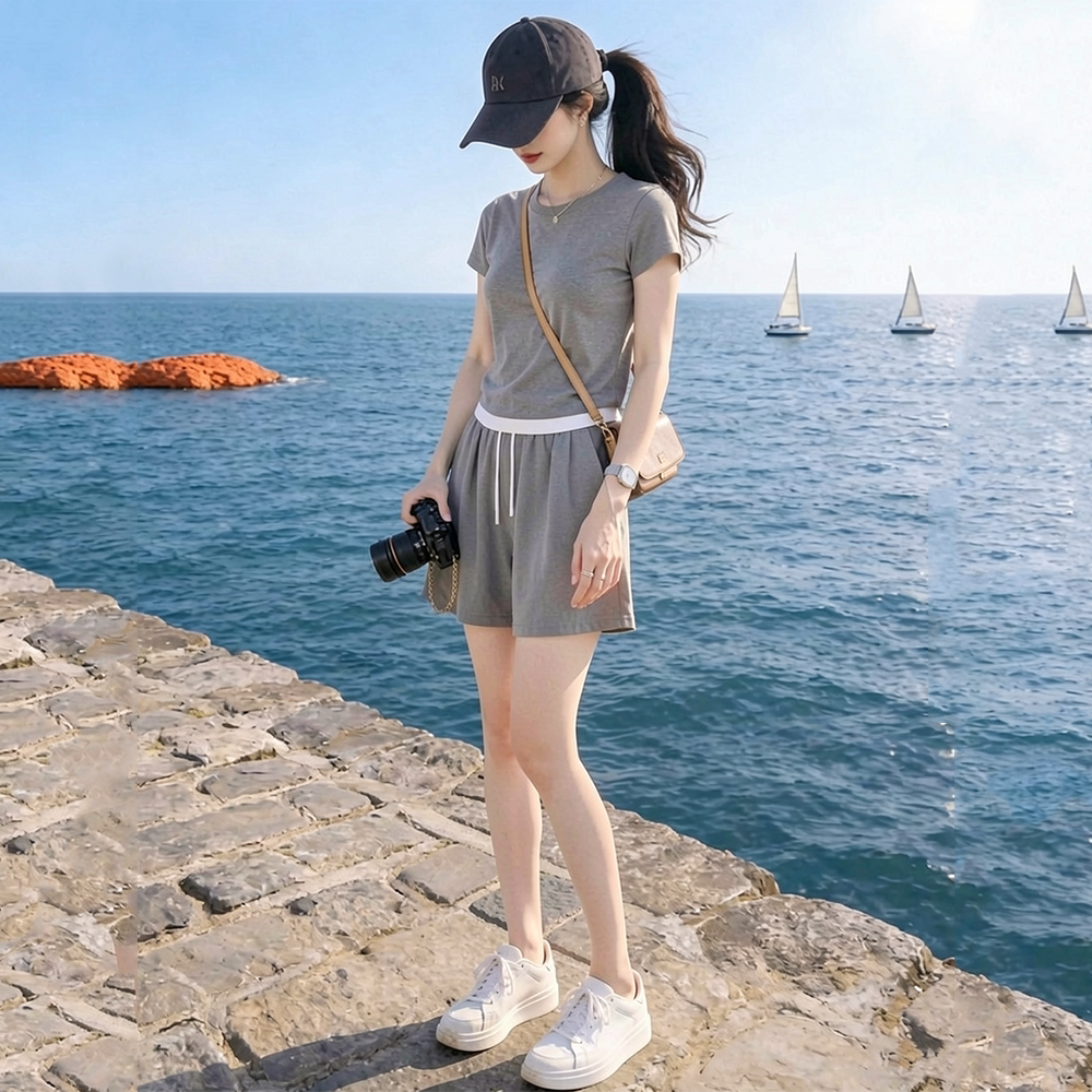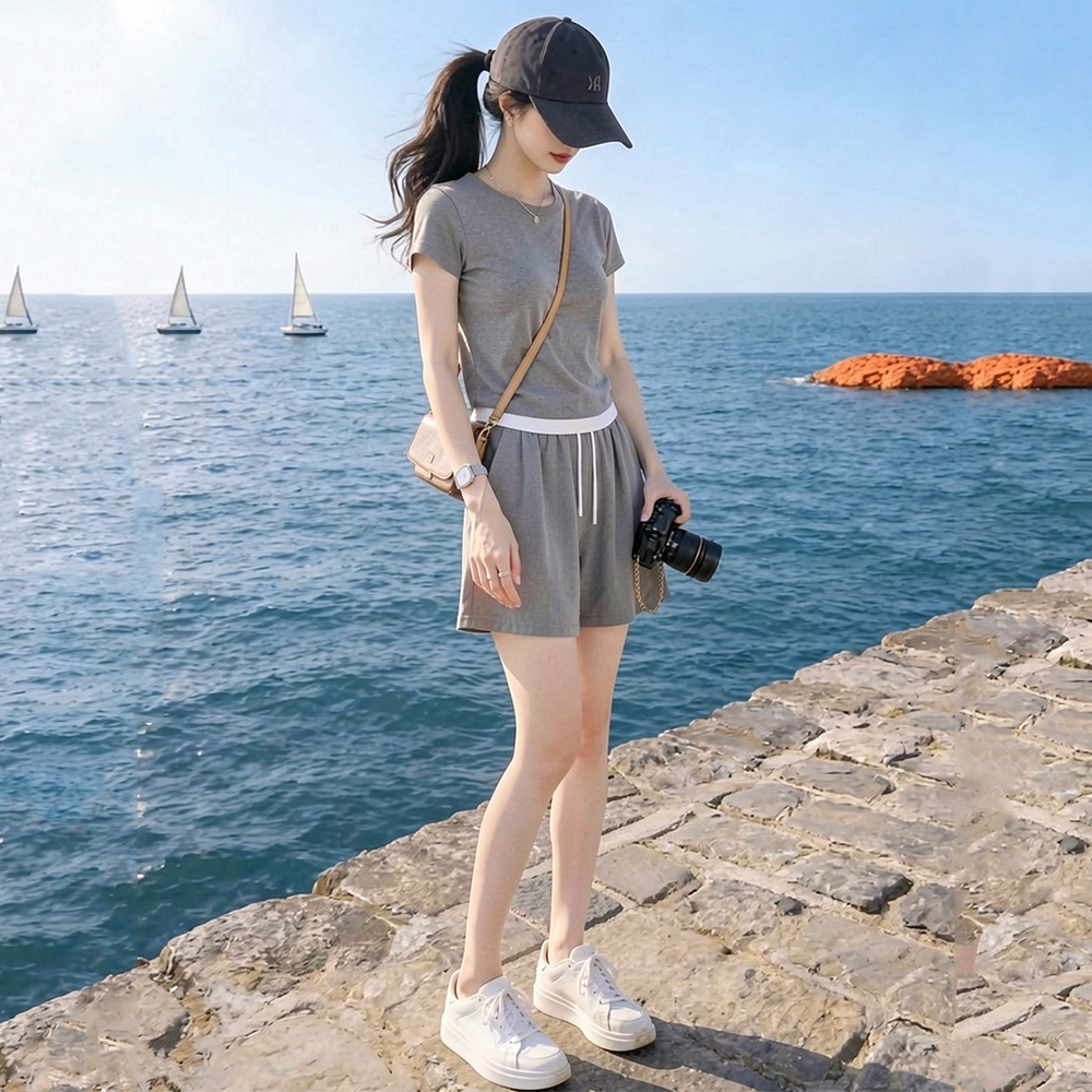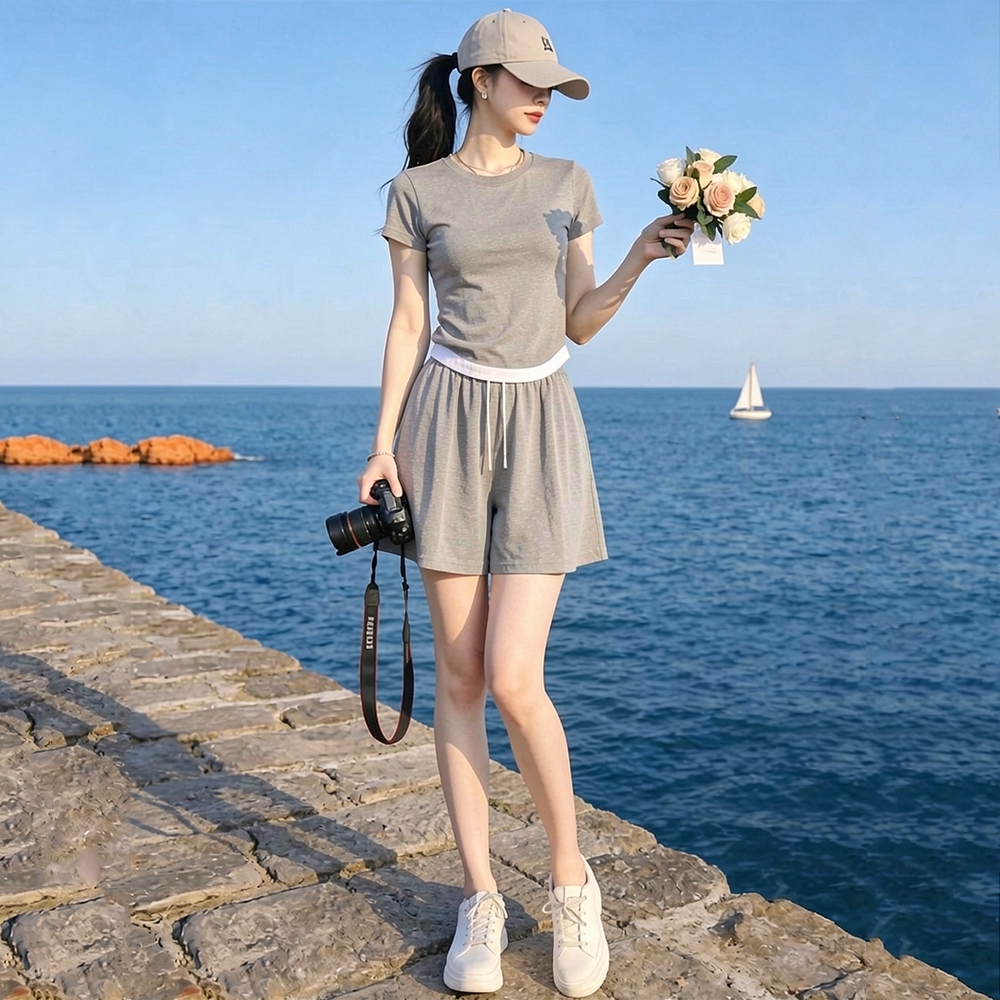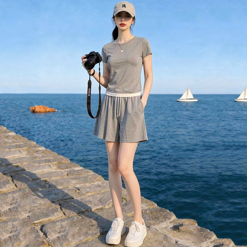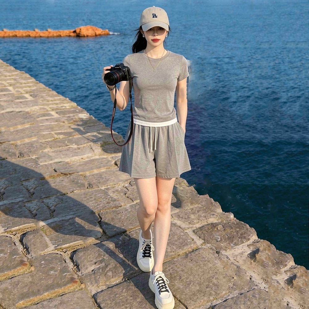 La Chapelle Casual Sports Suit for Women, Summer 2026 New Fashion, Age-Reducing Gray Short-Sleeve Shorts Two-Piece Set