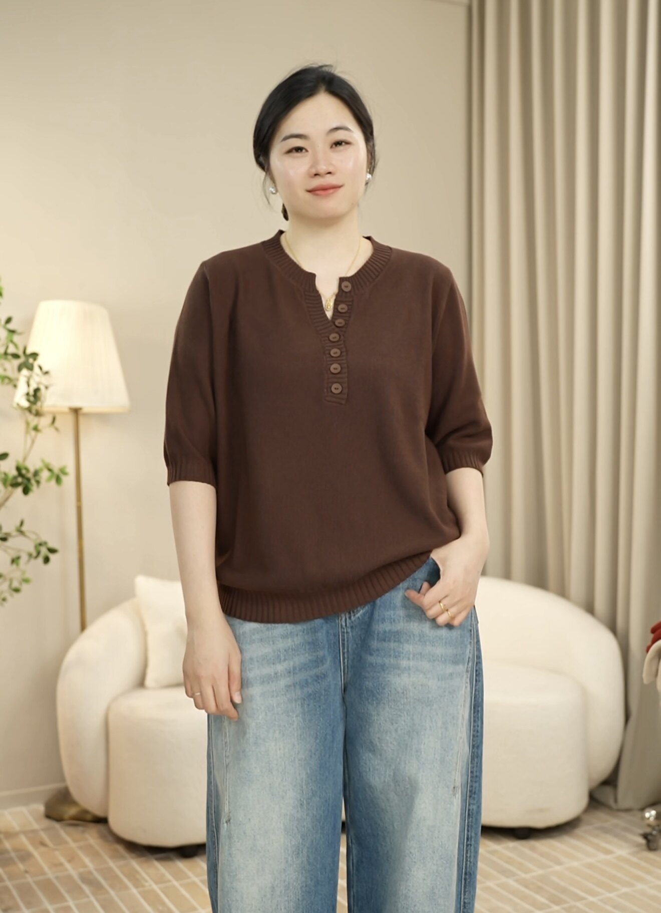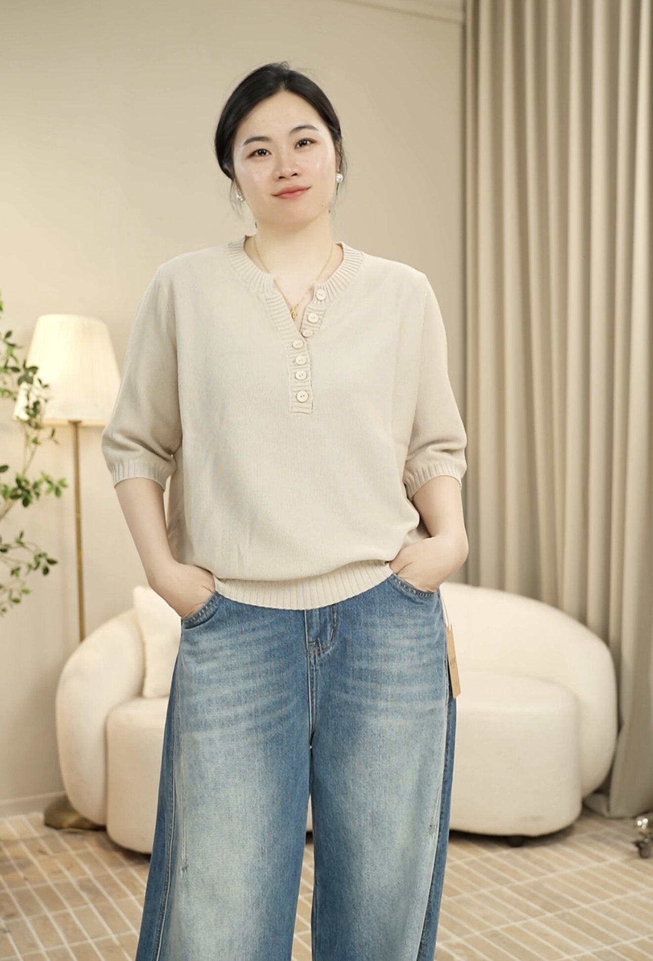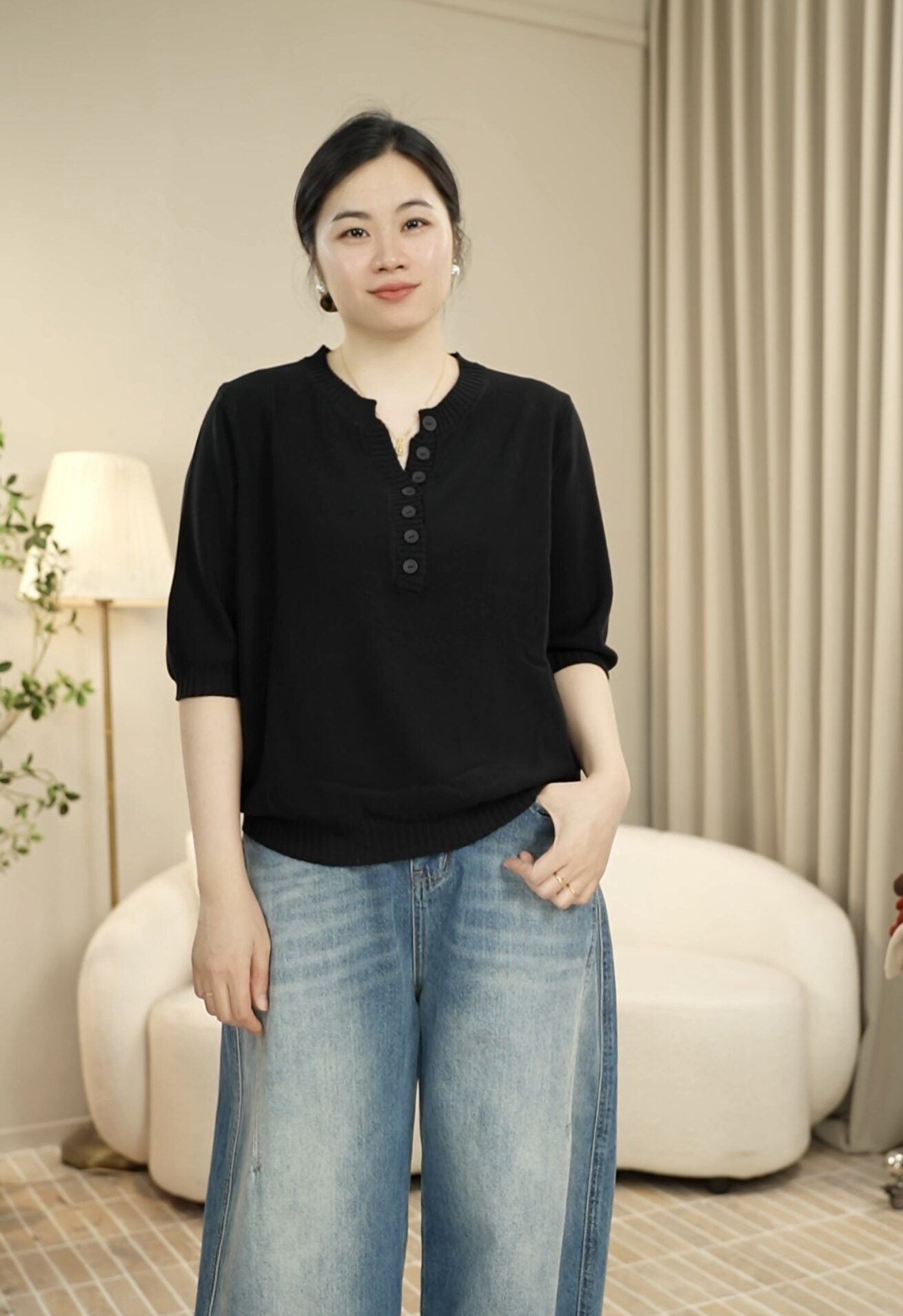 Small V-Neck Half-Button Thin Knit Sweater for Women, Gentle and Loose Mid-Sleeve T-Shirt for Women 2863