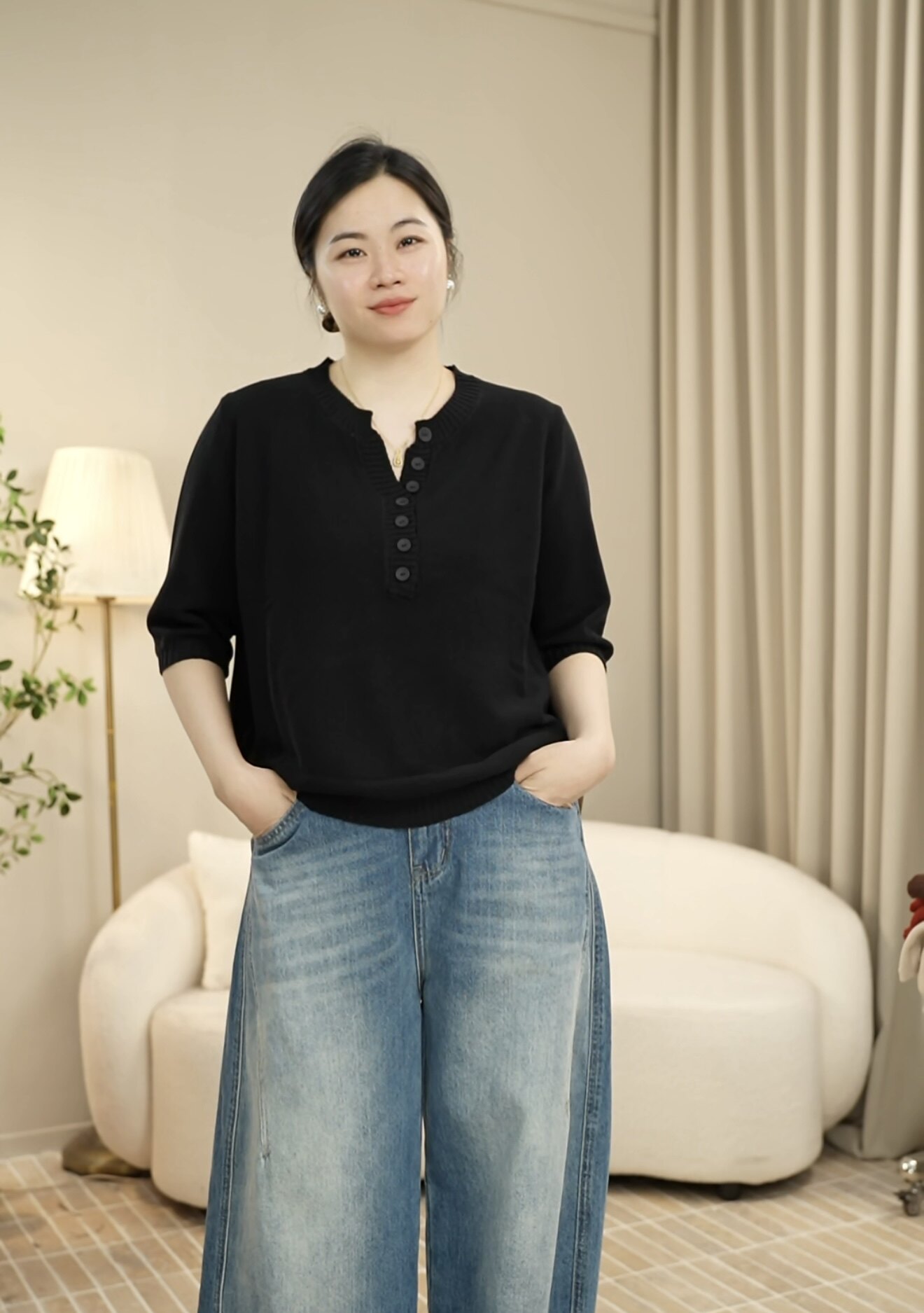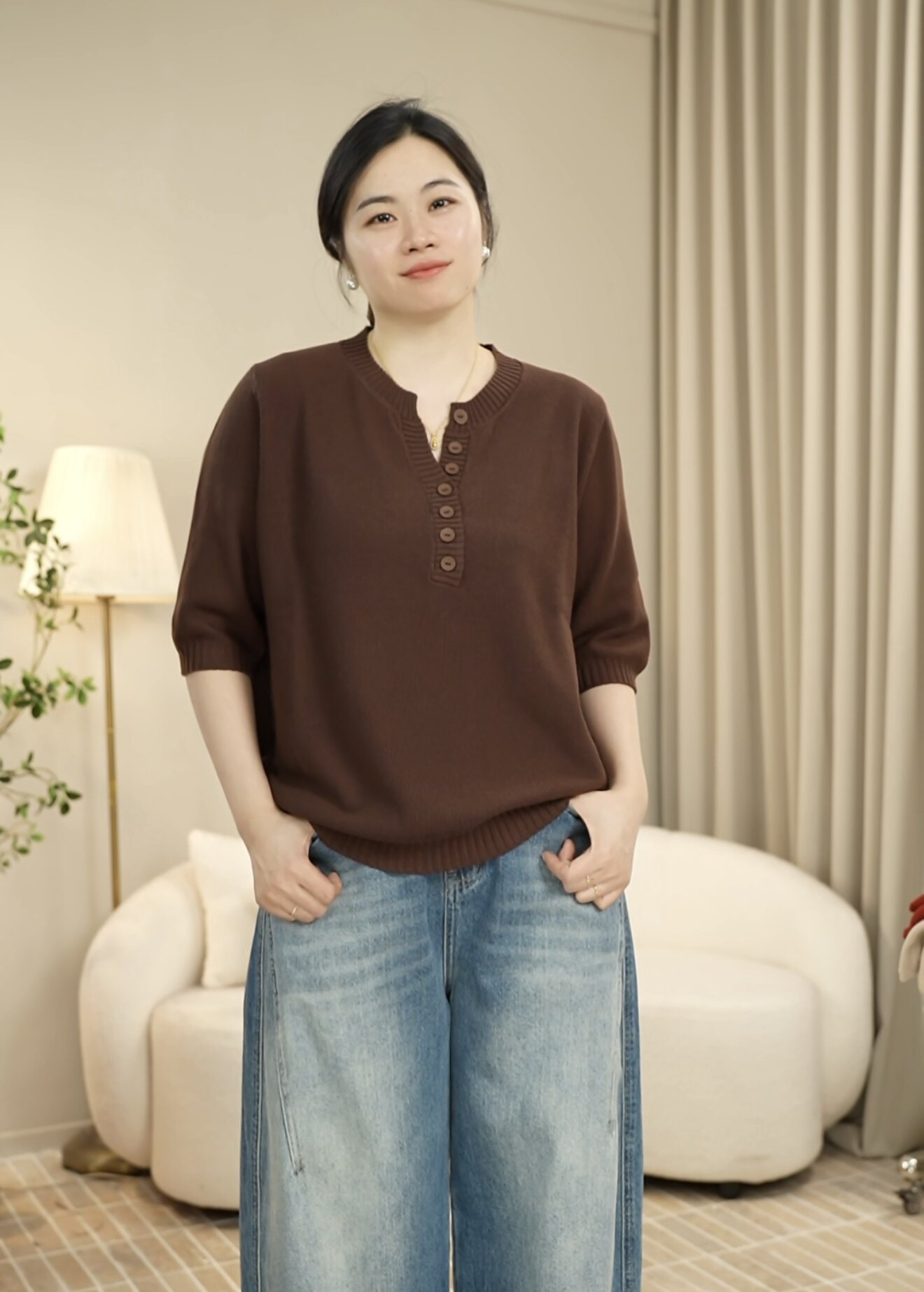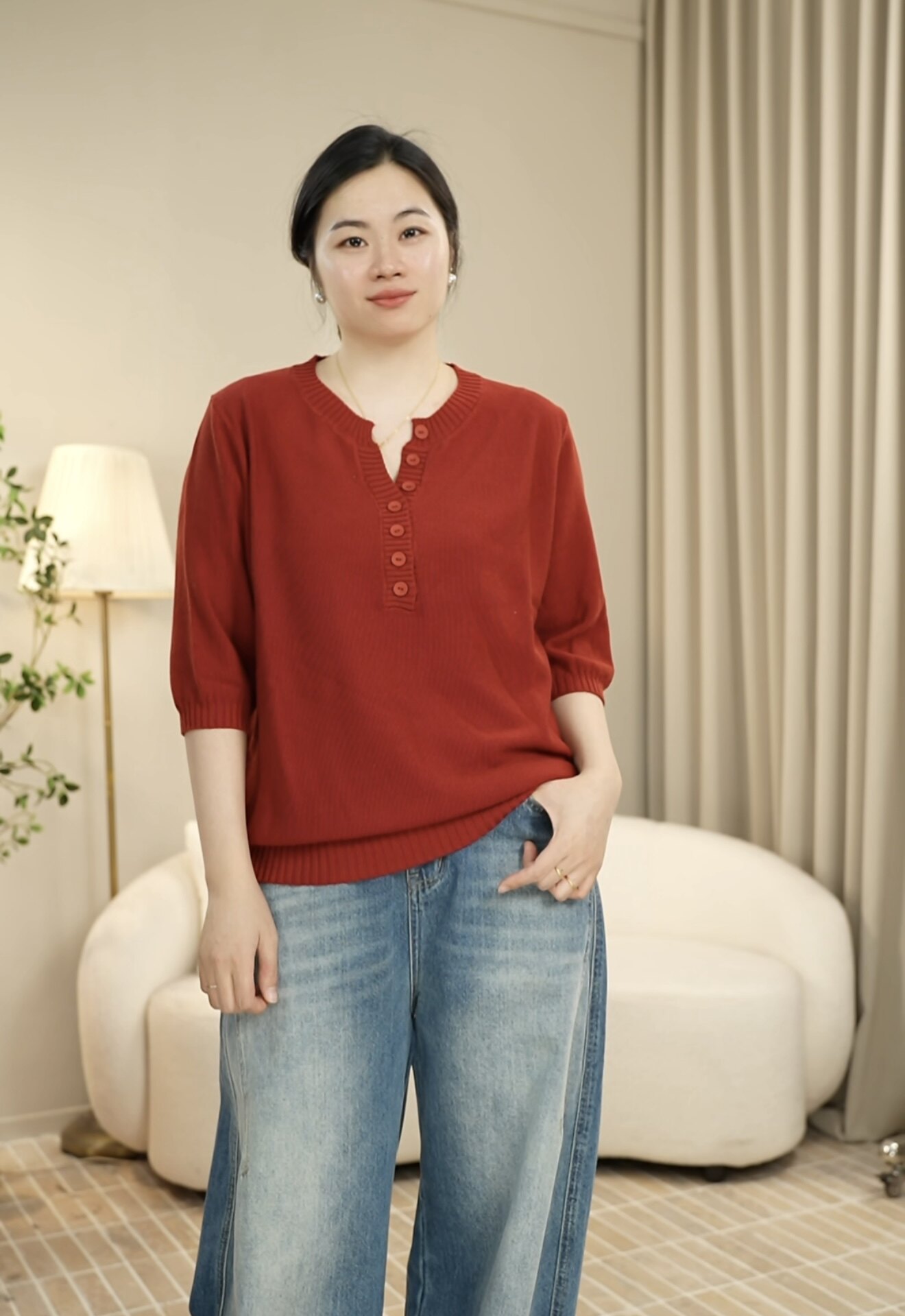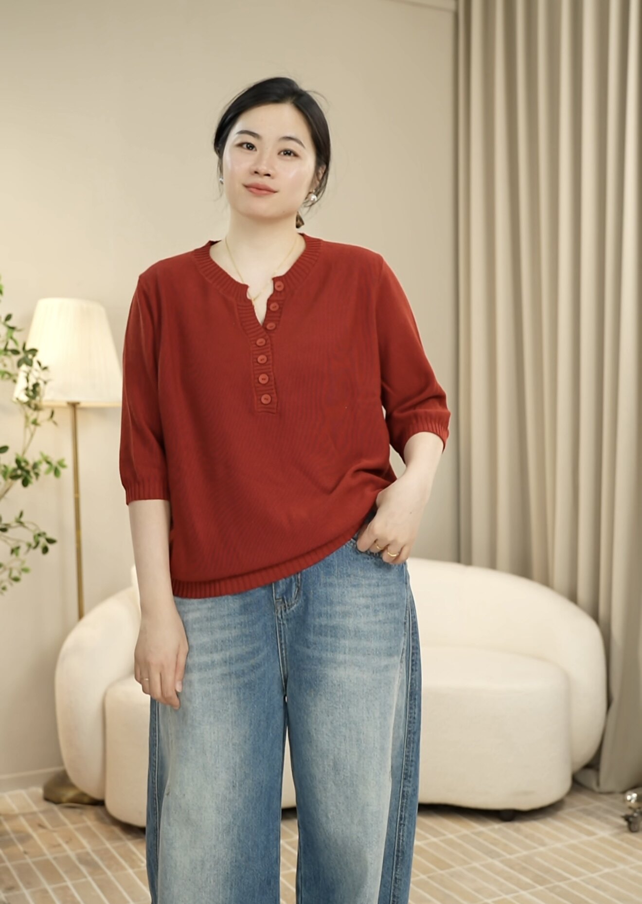 Small V-Neck Half-Button Thin Knit Sweater for Women, Gentle and Loose Mid-Sleeve T-Shirt for Women 2863