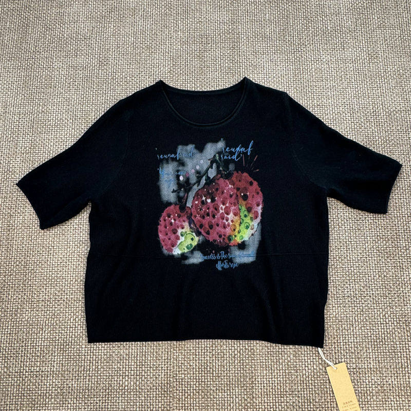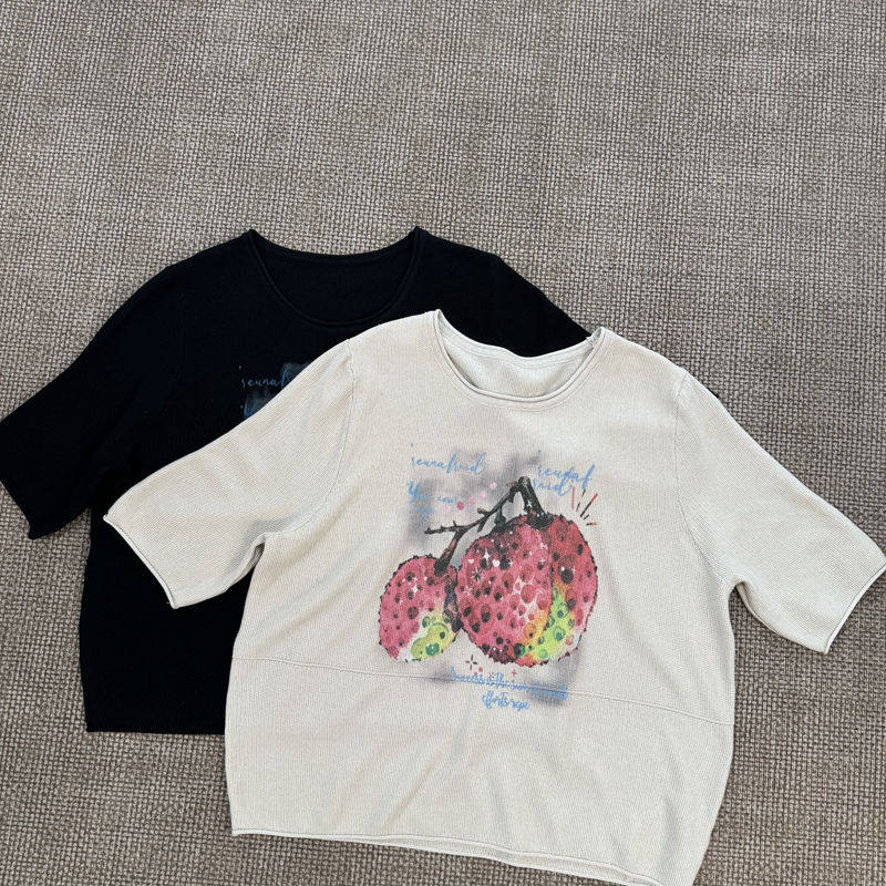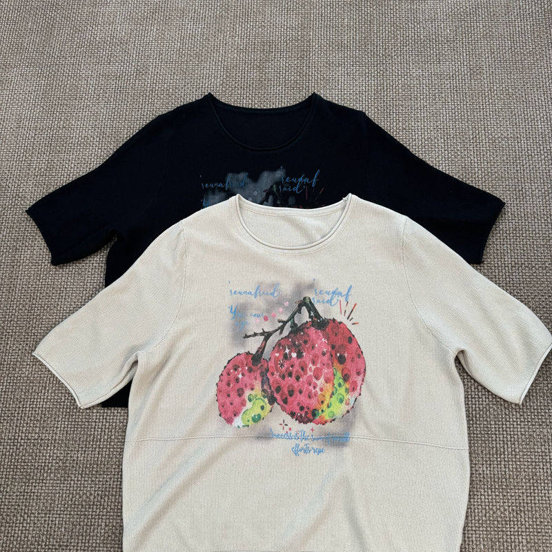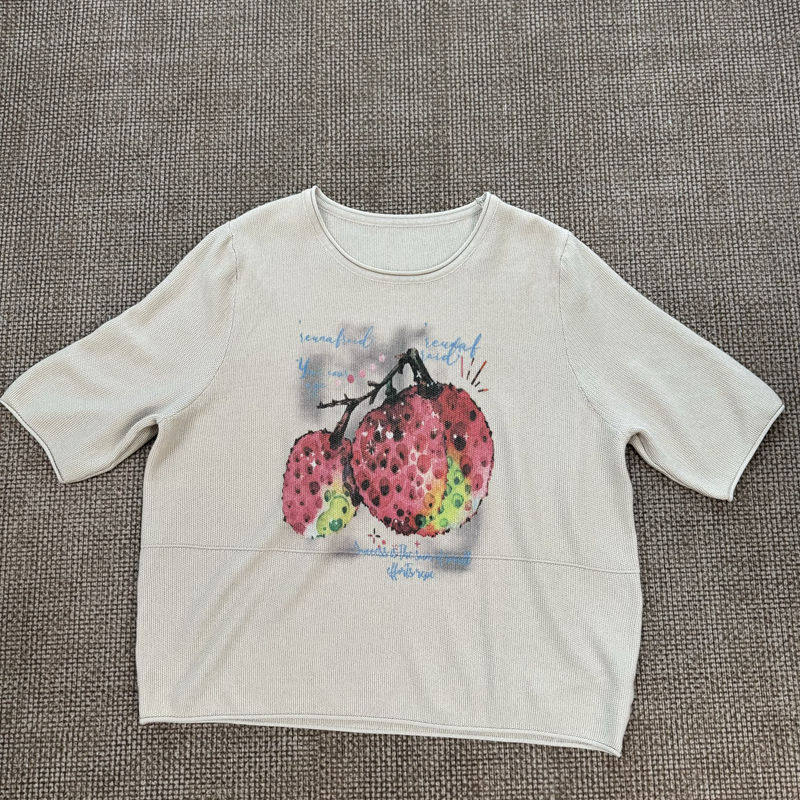Western-Style Lychee Print Mid-Sleeve Knit Top for Women, Loose Fit, Slimming, Thin Round-Neck T-Shirt 2870