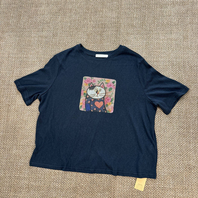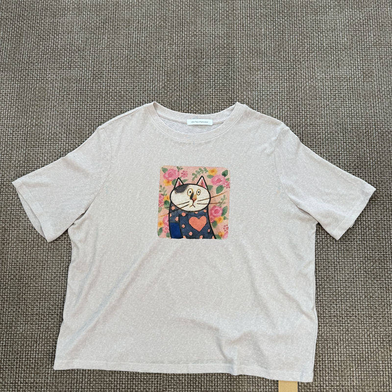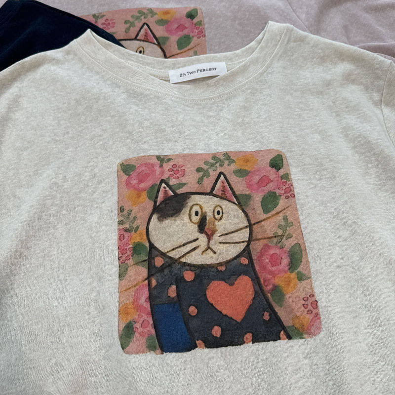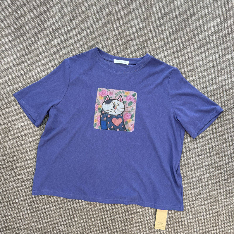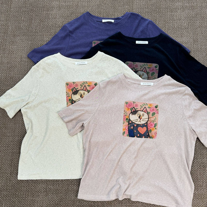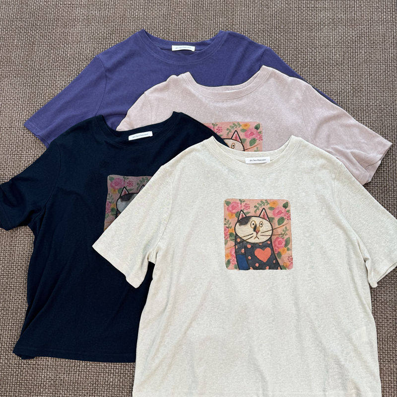 Fashionable Cat Print Short-Sleeved Age-Reducing Linen Thin Loose and Versatile Top for Women 3669