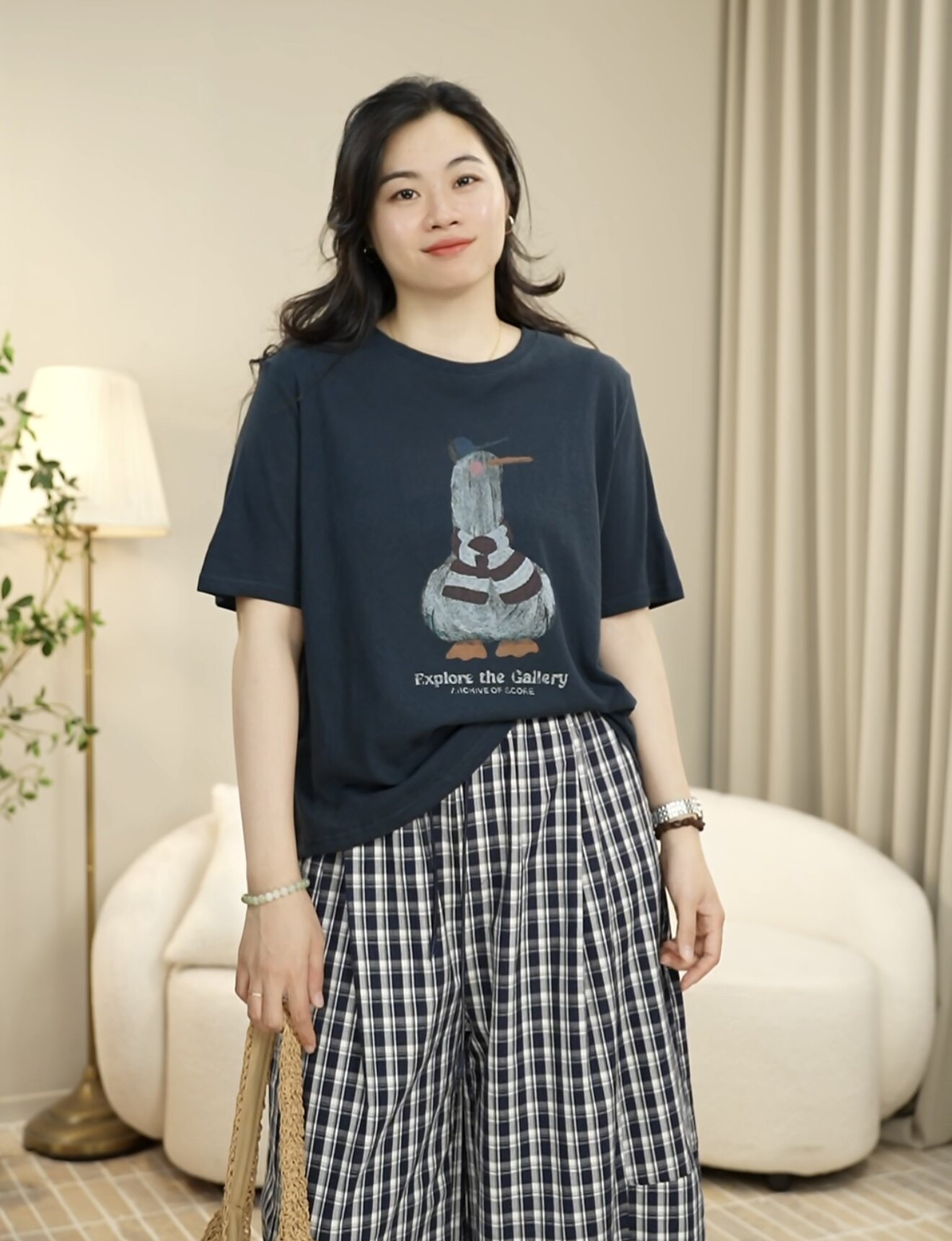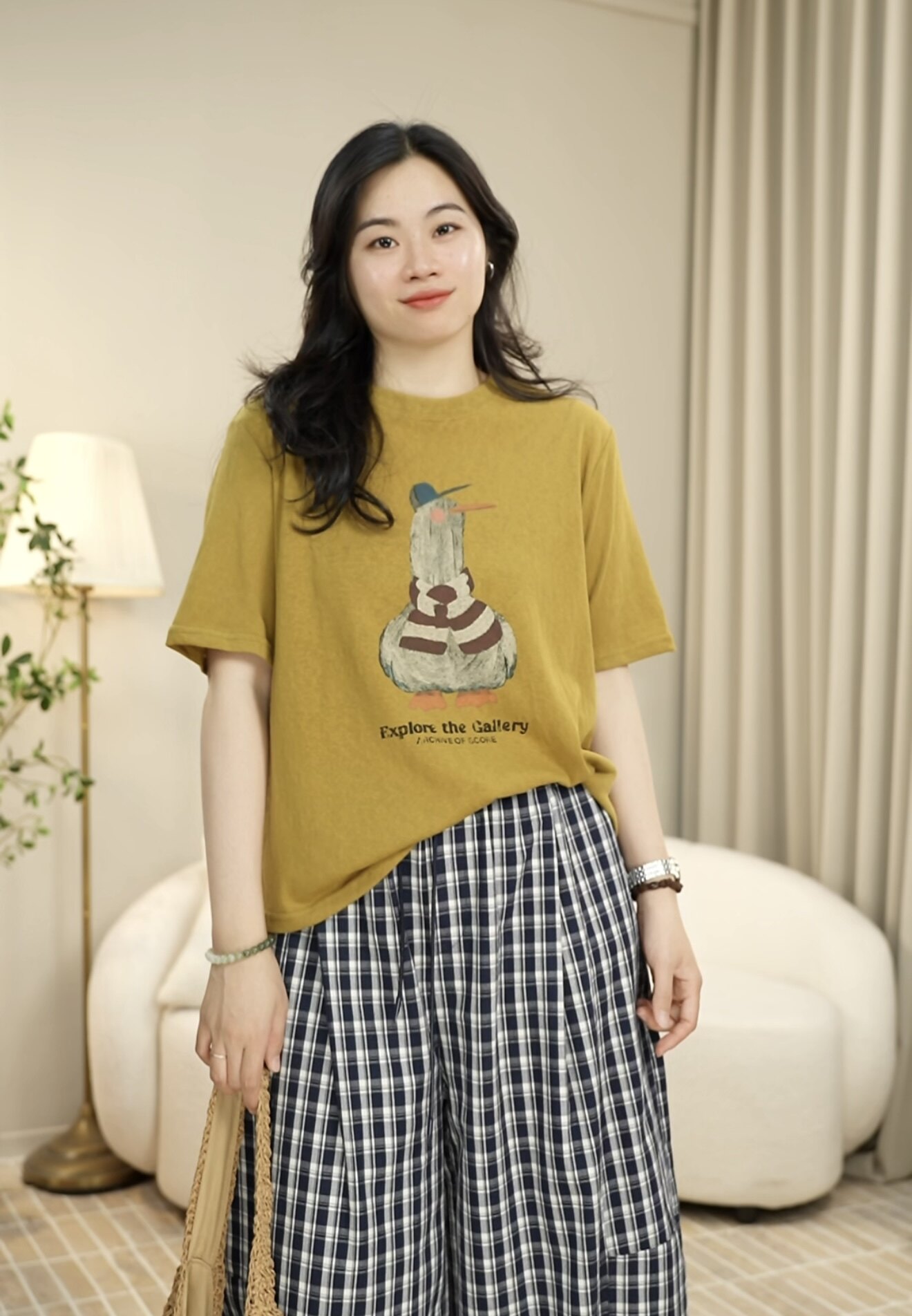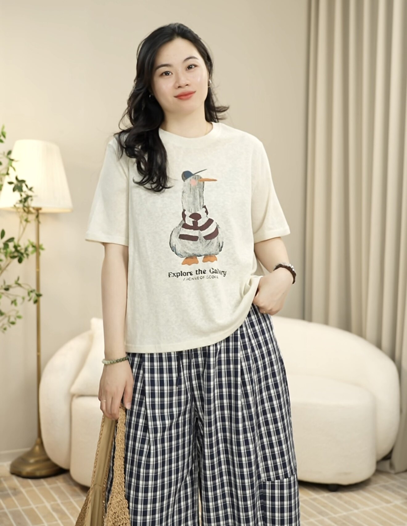 2026 Summer New Duck Print Linen T-Shirt Round Neck Commuting Daily Short Sleeve Women's 3671