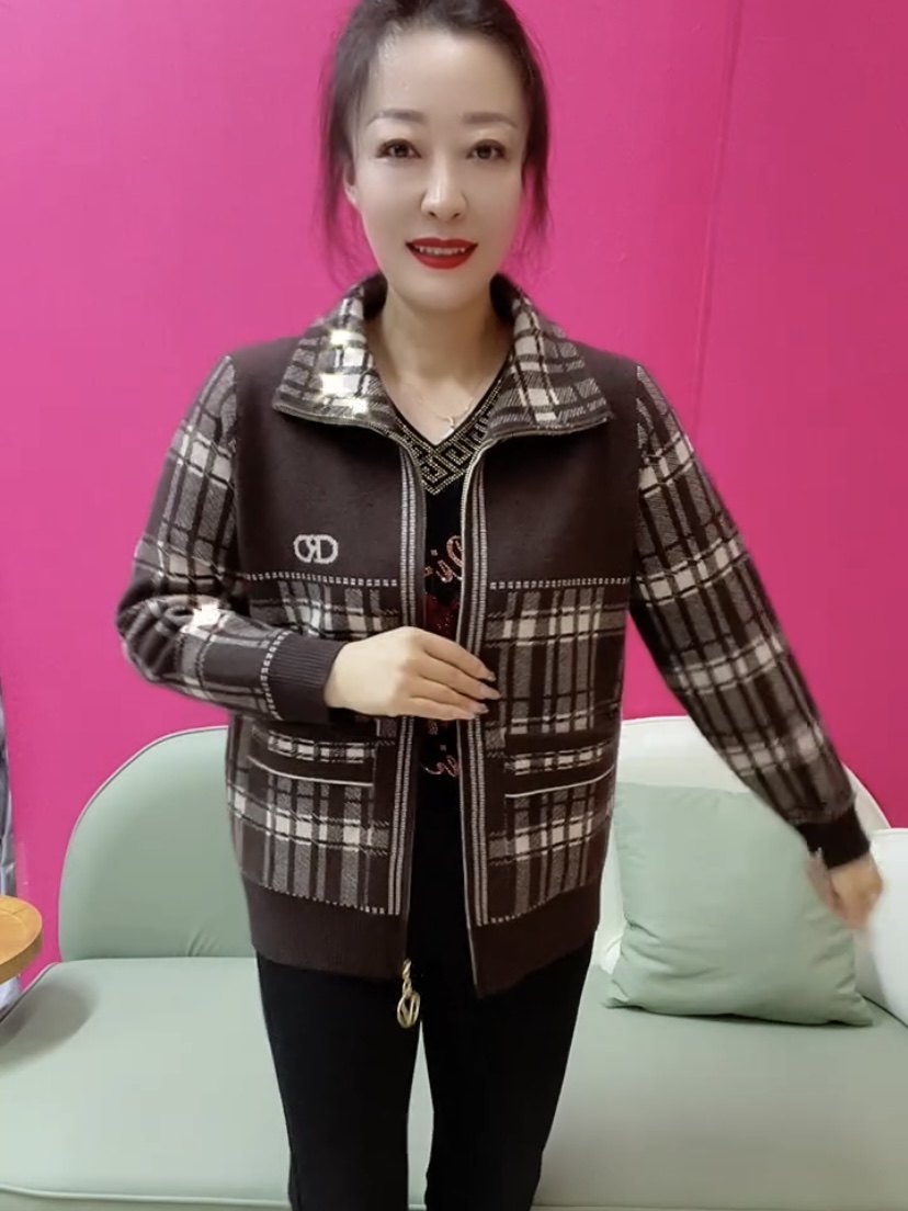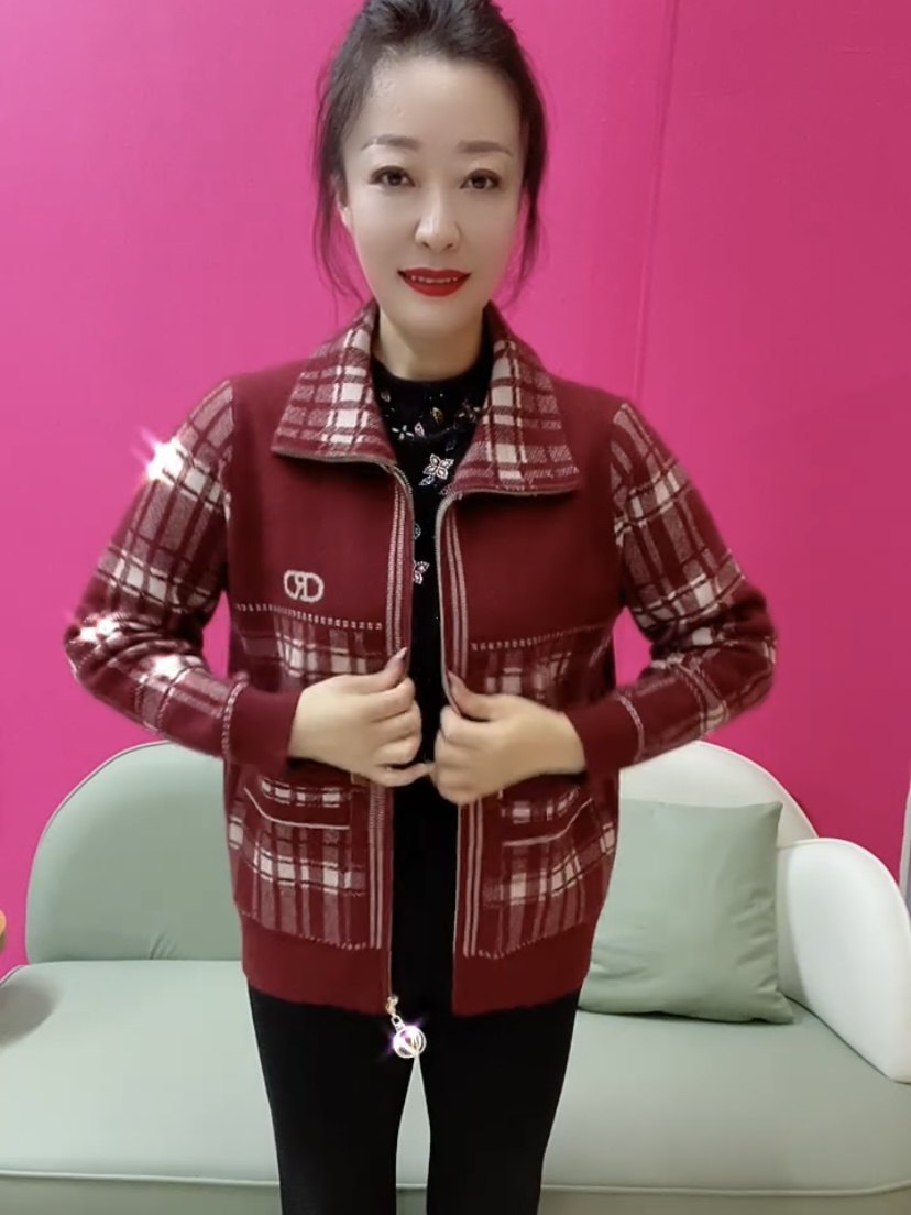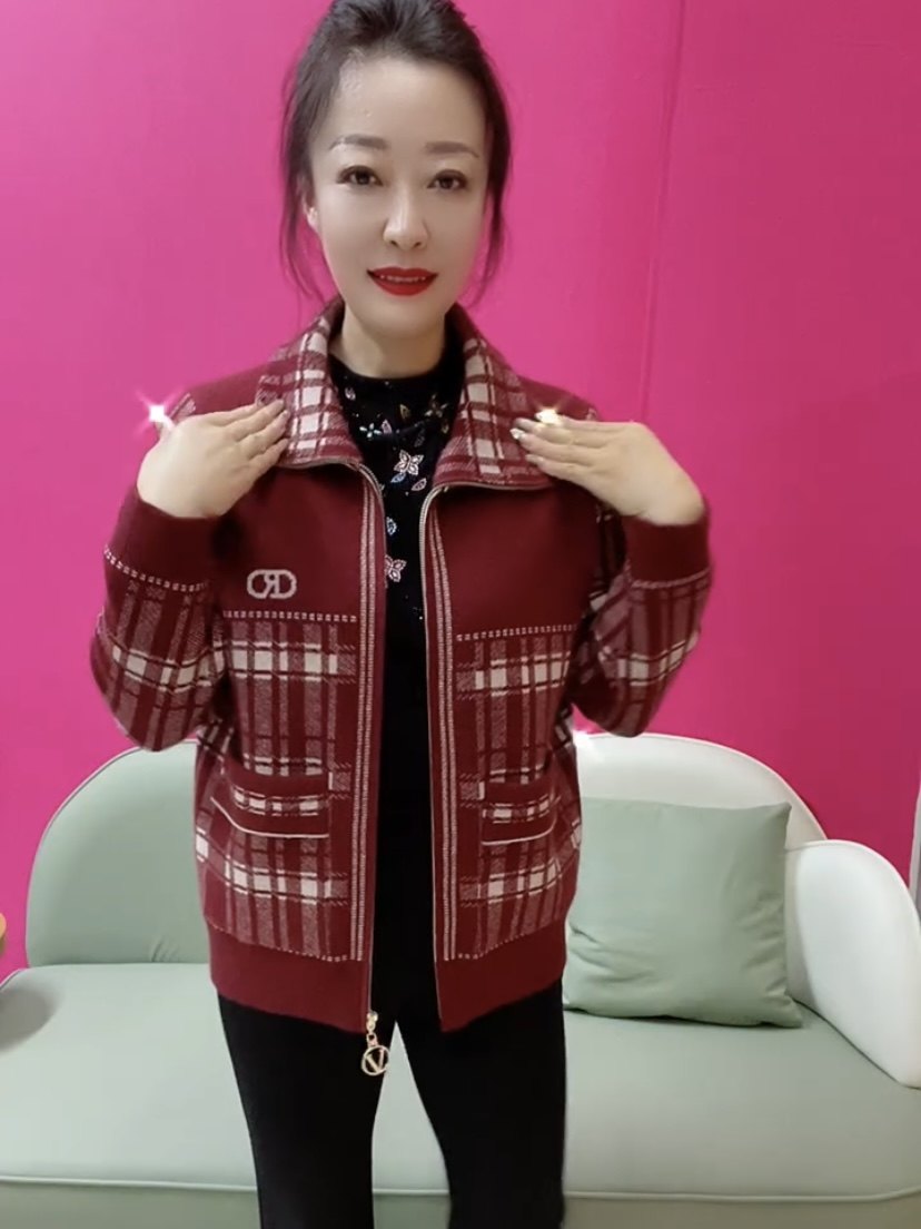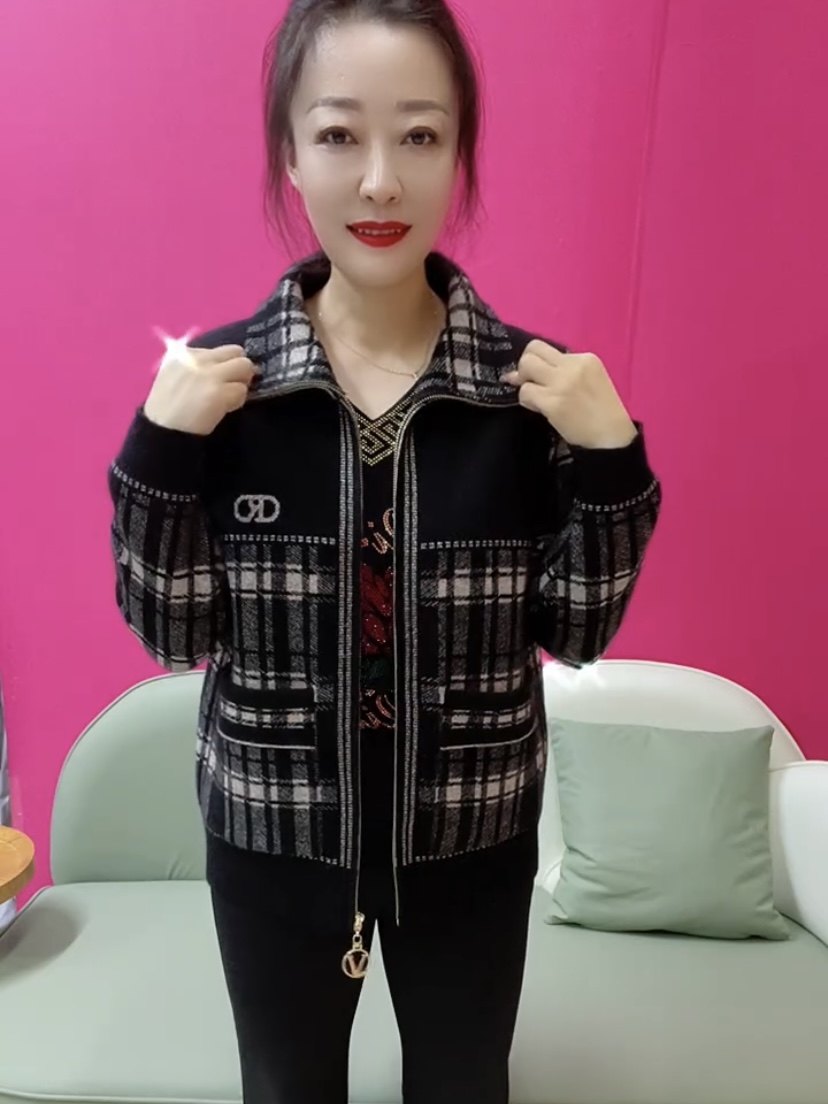 Autumn and winter new fashion zipper plaid jacket casual versatile lapel middle-aged and elderly regular women's tops women's clothing