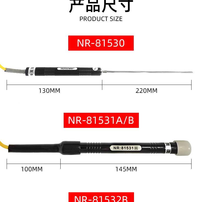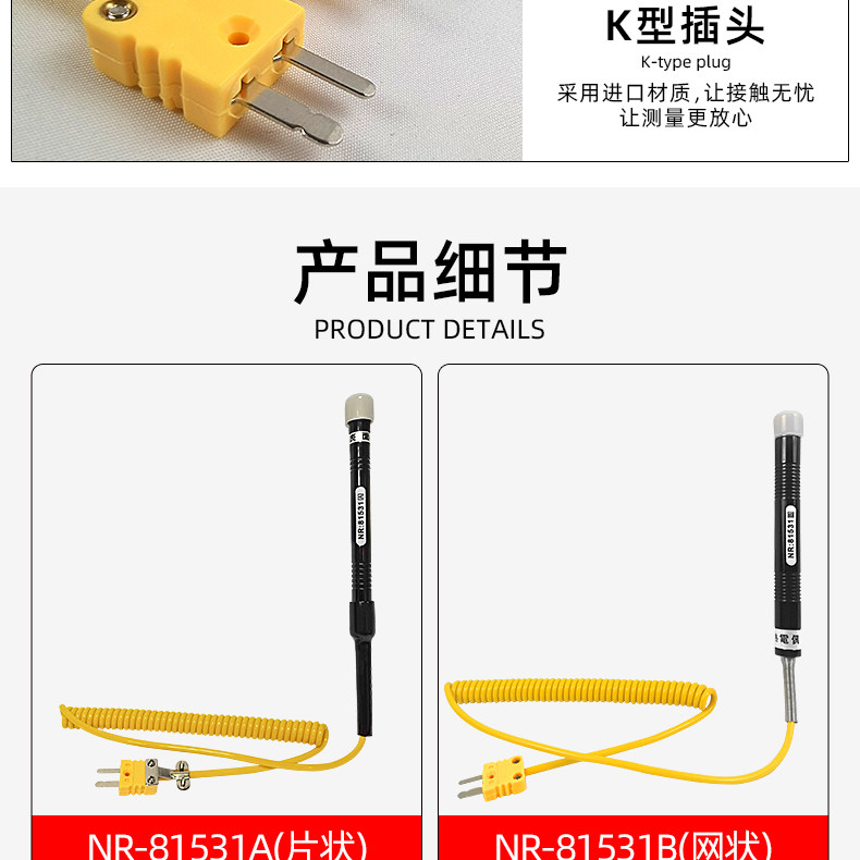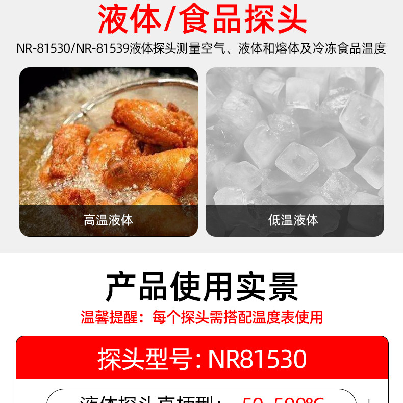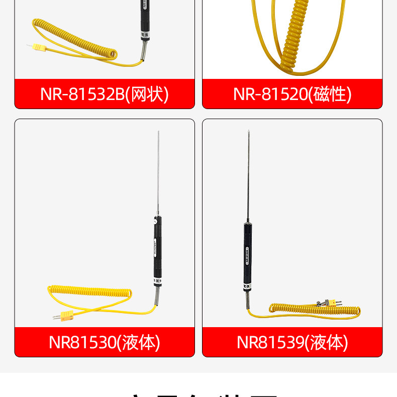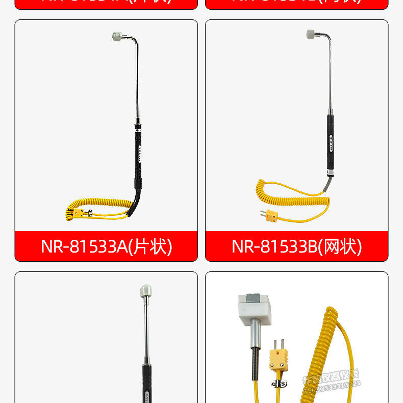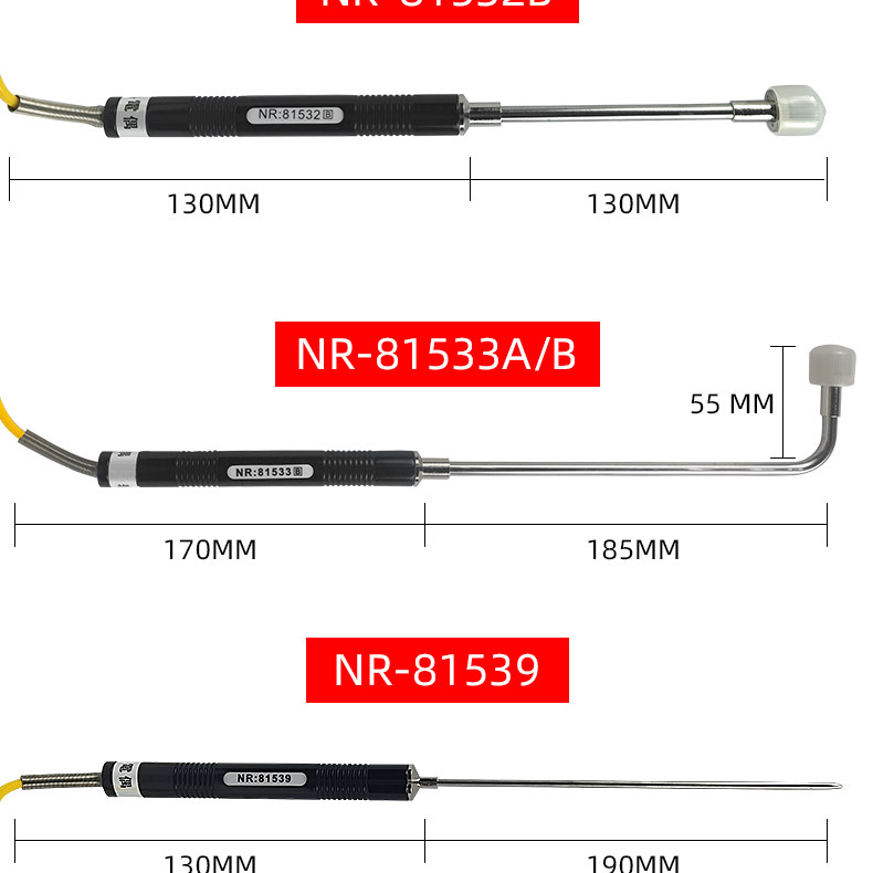 Sort by color NR-81533A (elbow thermometer is in sheet form),NR-81533B (elbow thermometer is mesh-shaped),NR-81531A (straight handle thermometer is in sheet form),NR-81531B (straight handle thermometer is mesh),NR-81532B (straight handle thermometer is mesh),NR-81530 (liquid probe),NR-81539 (tip probe) measures food liquids,NR-81520 (sheet probe with magnet),NR-81520 (mesh probe with magnetic),NR-81535A (roller probe) sheet,NR-81535B (roller probe) mesh,NR-81532A chip probe,NR81542A (sheet) is more durable,NR81542B (mesh),NR81546A(flake),NR81546B(mesh)
