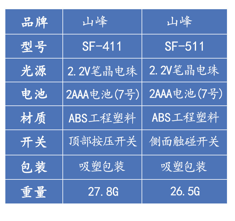 Color Classification Sf-411 Without Battery,Sf-511 Without Battery,Sf-411 Comes with 2 Aa Batteries,Sf-511 Comes with 2 Aa Batteries,Sf-411 2 Pieces Without Battery,Sf-411 2 Pieces with 4 Aa Batteries,Sf-511 2 Pieces Without Battery,Sf-511 2 Pieces with 4 Aa Batteries,Sf-611 Without Battery - Bring an Extra Lamp Head - Random Color,Sf-611 with 2 Batteries - 1 More Lamp Head - Random Color
