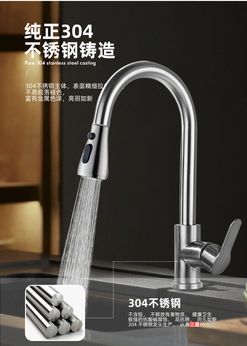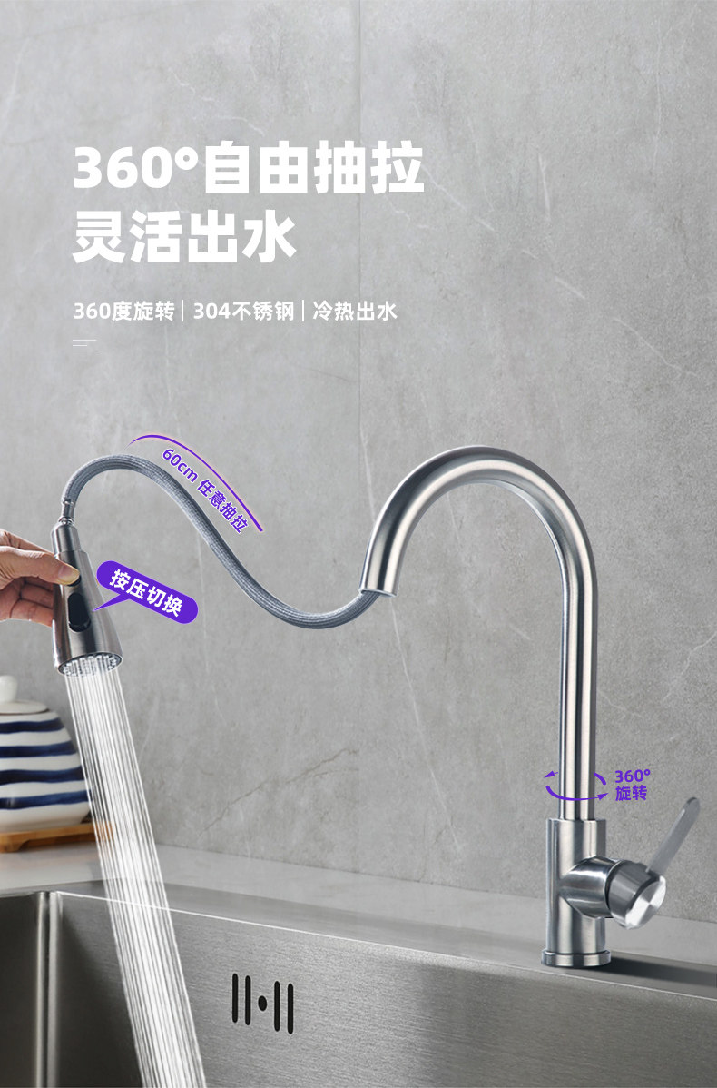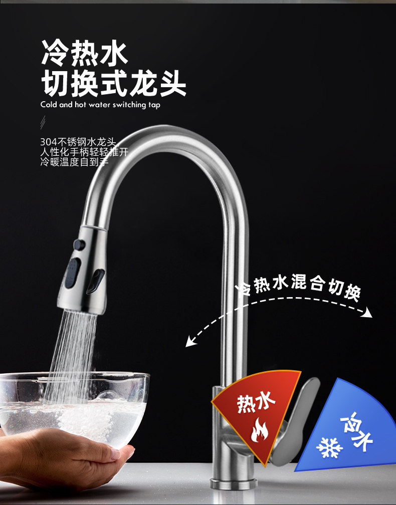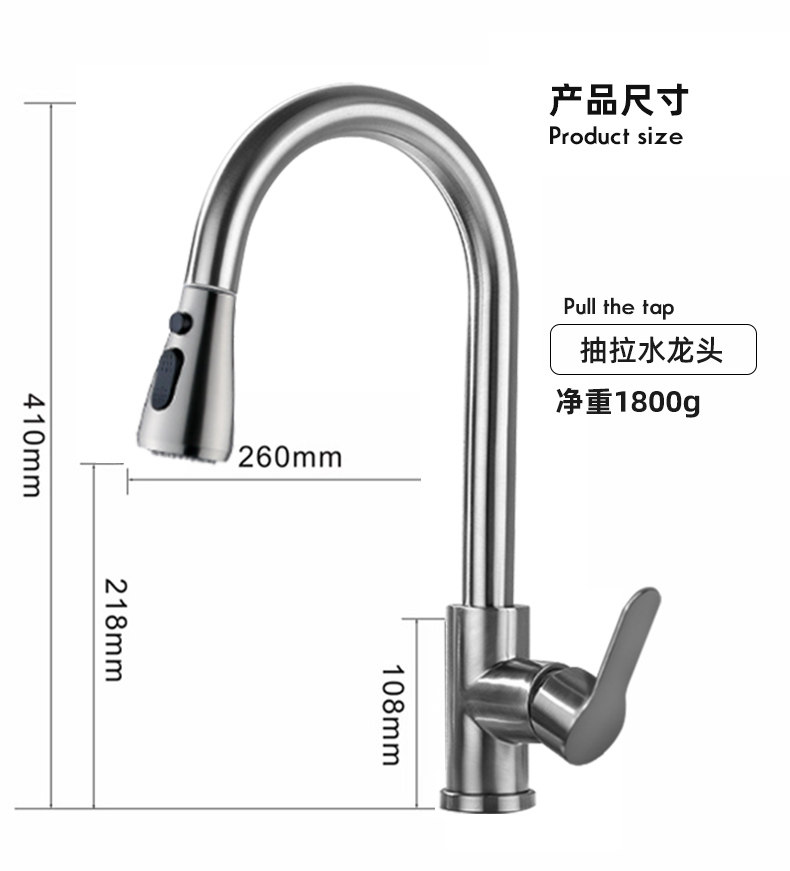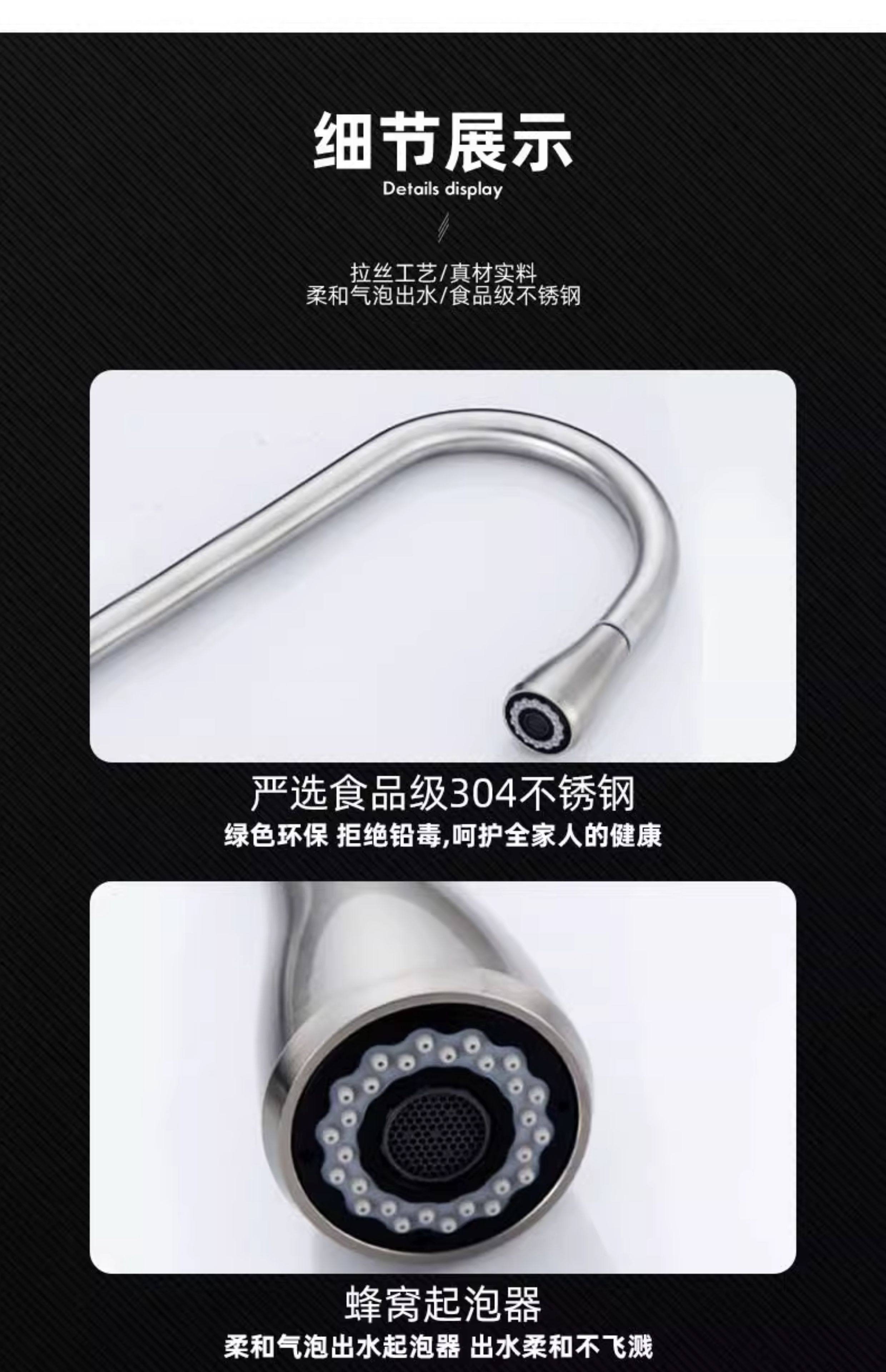 304 Stainless Steel Kitchen Sink Faucet Hot and Cold Water Faucet Rotating Pull-Out Faucet Brushed Polished